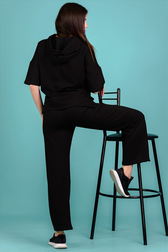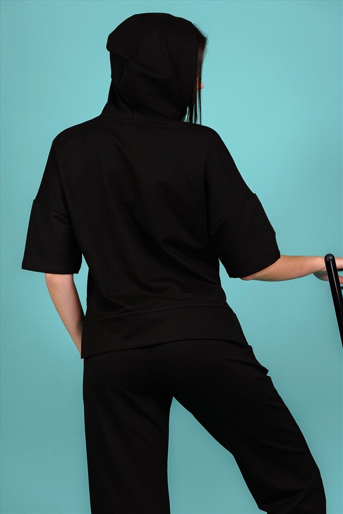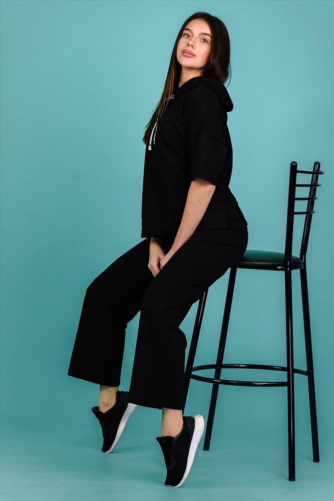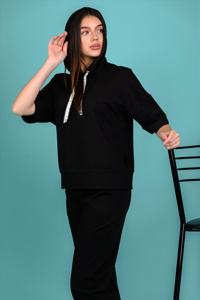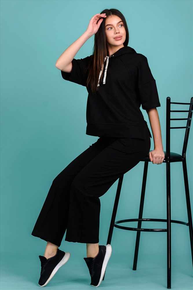 Костюм состоит из толстовки и брюк. Толстовка прямая, свободная, с капюшоном, с коротким рукавом. На полочке расположены симметричные фигурные кокетки. В нижней части боковых швов обработаны разрезы. Низ полочки и спинки завершены поясом. Брюки свободные, прямые, со стрелками, с карманами, на поясе.