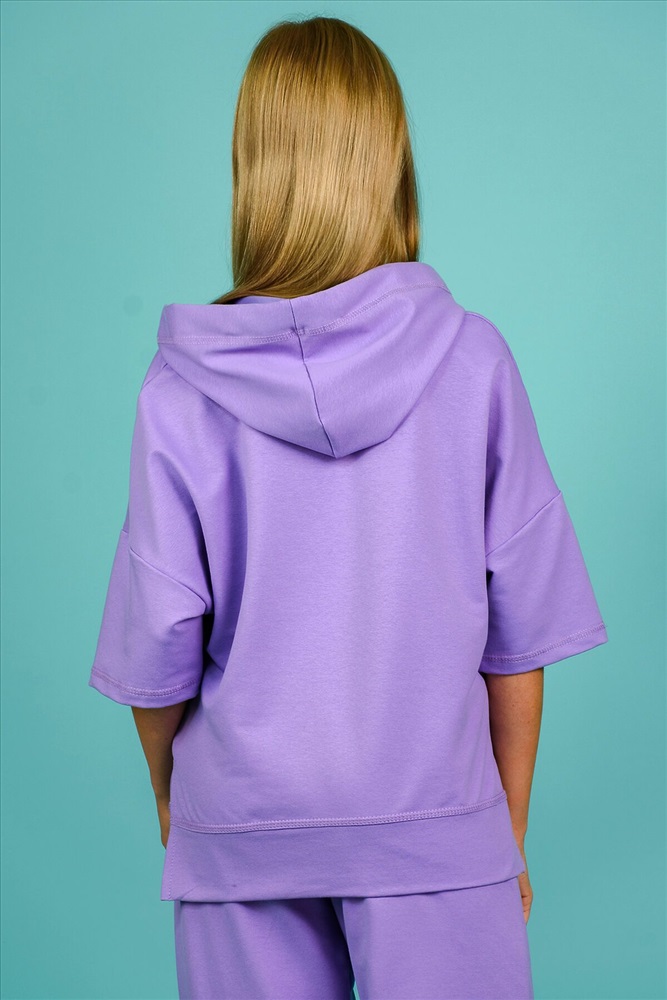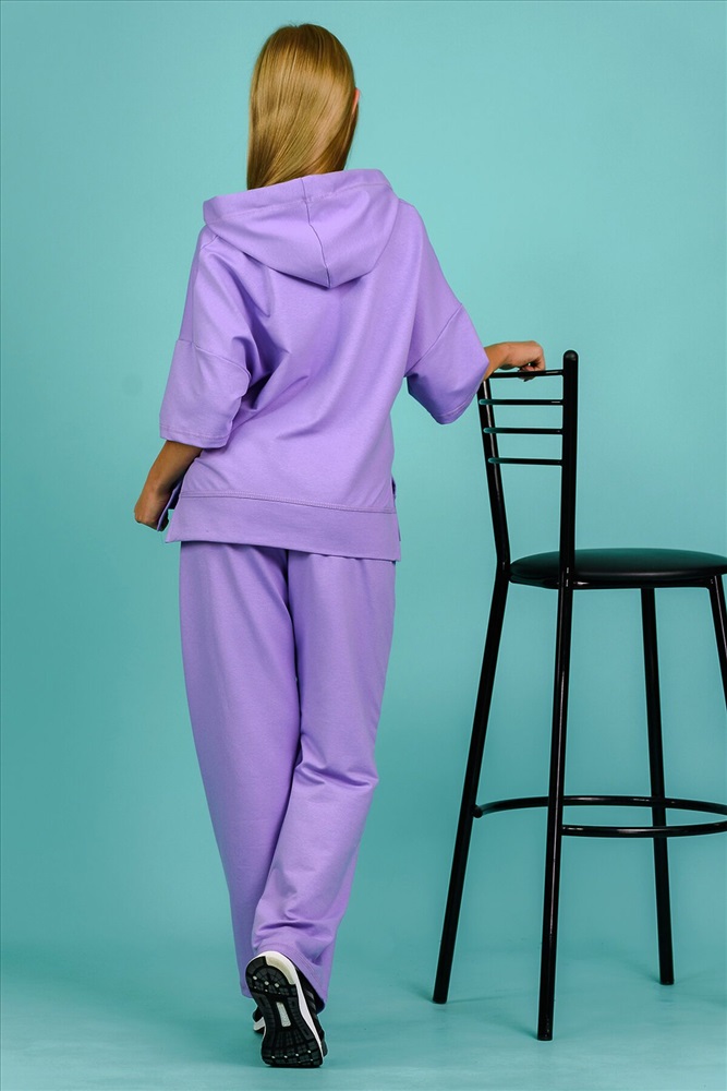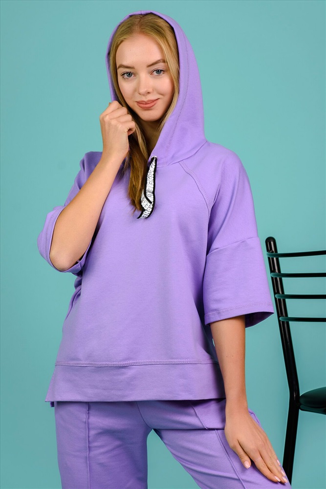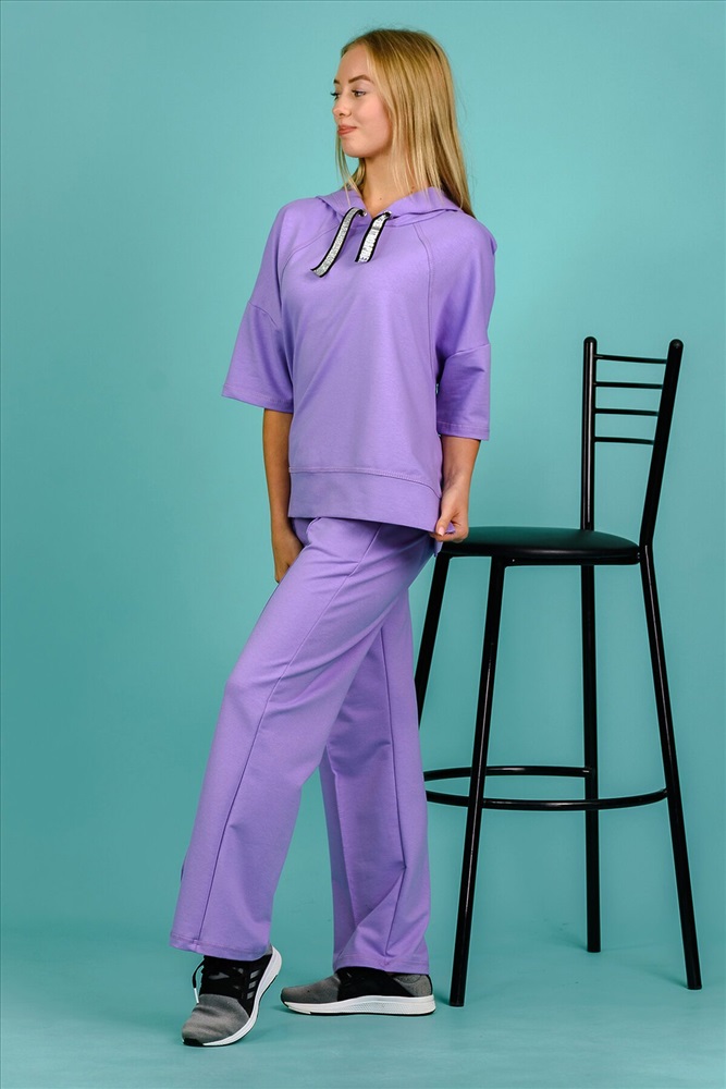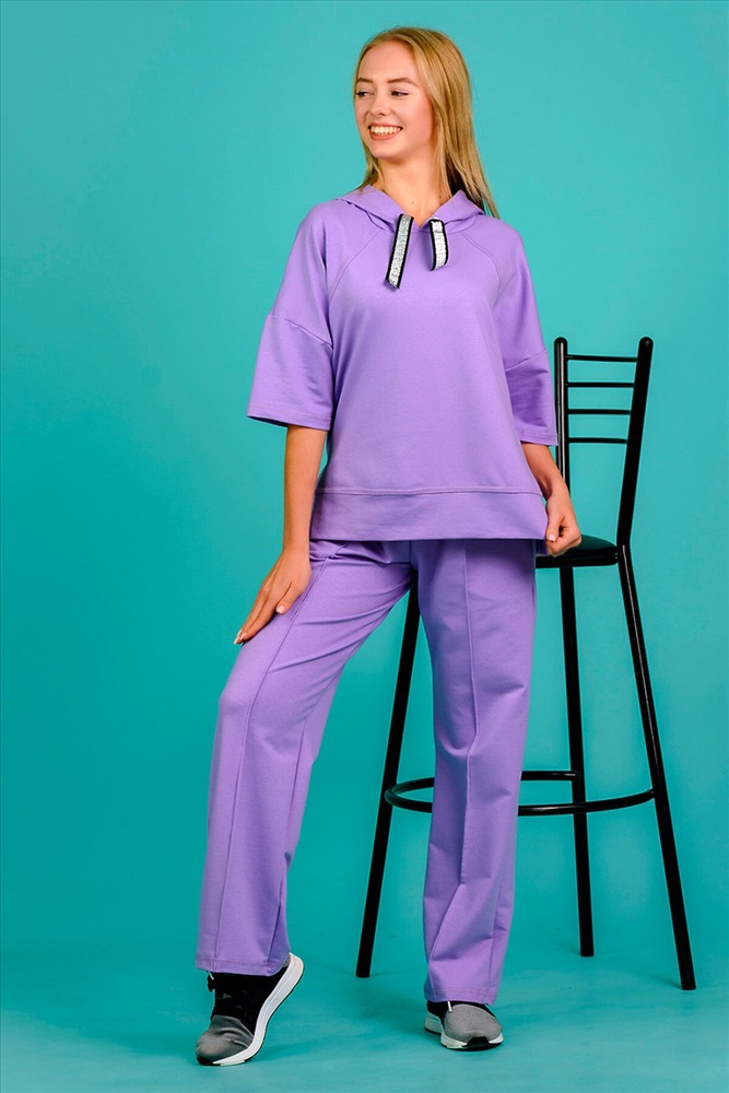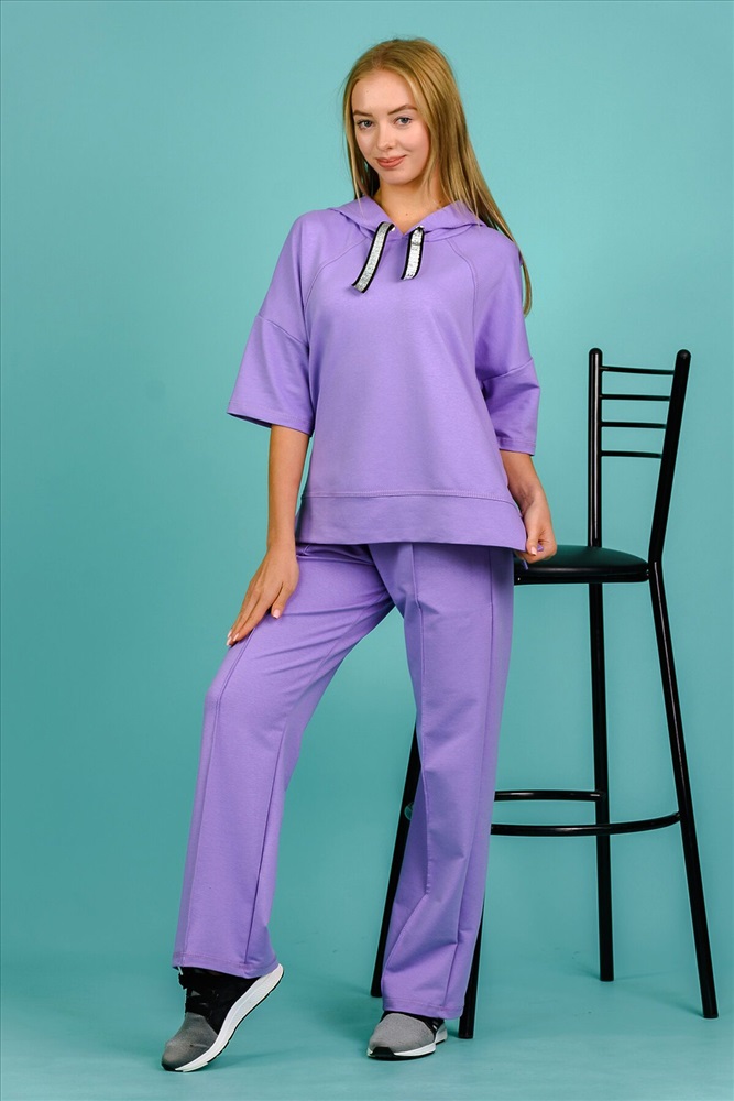 ID товара: 699660 Состав: Хлопок 72%, Полиэстер 20%, Эластан 8% Сезон: Весна/Лето Длина: Средняя Фасон: Свободный крой Рукав: До локтя Вид застежки: Без застежки Крой брючин: Широкий Тип карманов: Прорезные Декоративные элементы: С капюшоном Основная ткань: Хлопок | Футер с лайкрой 2-х нитка Стиль: Спортивный Страна бренда: Россия Страна производства: Россия Костюм состоит из толстовки и брюк. Толстовка прямая, свободная, с капюшоном, с коротким рукавом. На полочке расположены симметричные фигурные кокетки. В нижней части боковых швов обработаны разрезы. Низ полочки и спинки завершены поясом. Брюки свободные, прямые, со стрелками, с карманами, на поясе. Комментарии к товару