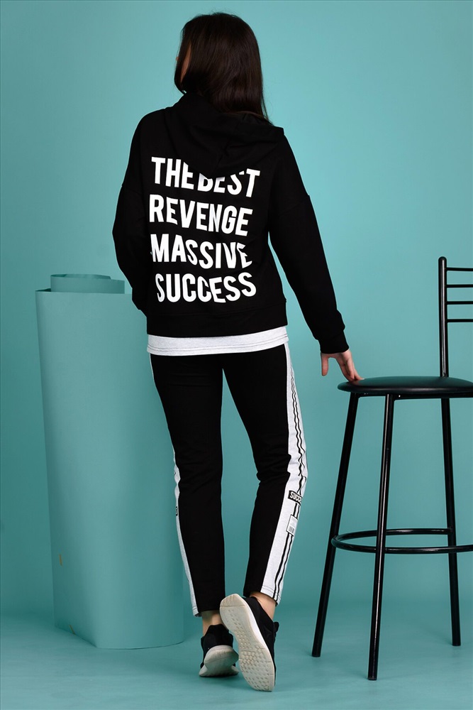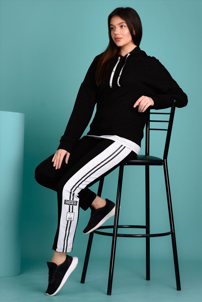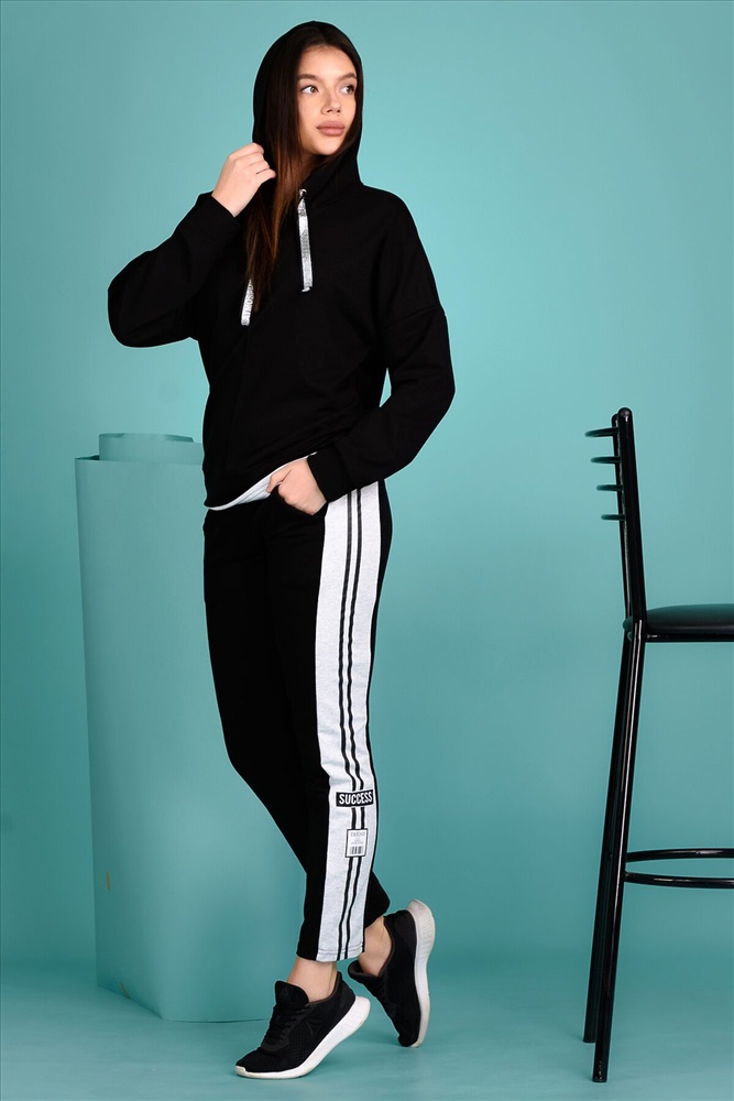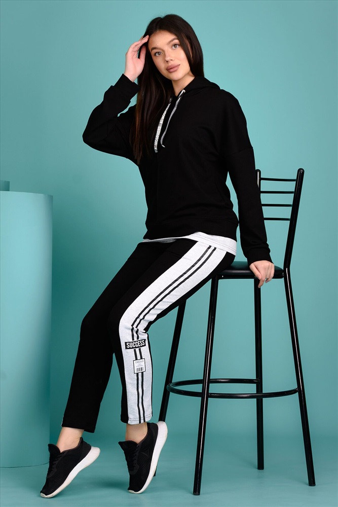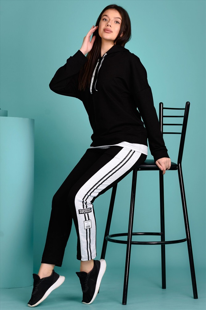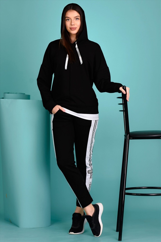 Костюм состоит из толстовки и брюк. Толстовка прямая, свободная, с капюшоном, с длинным рукавом на манжете. Низ полочки и спинки завершен поясом. Брюки с карманами, на поясе. Вдоль боковых швов расположены лампасы из отделочного полотна.