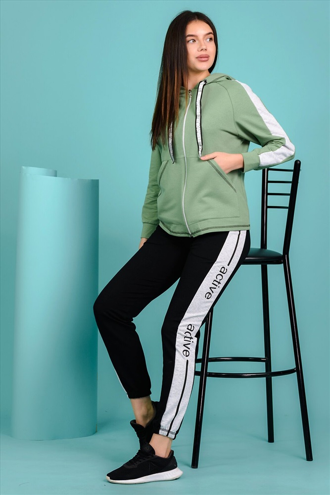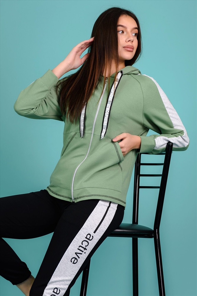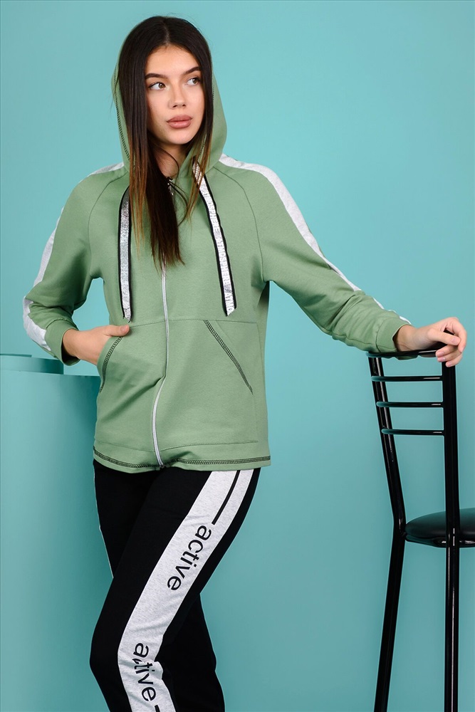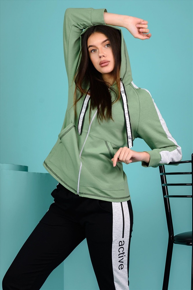 Костюм состоит из толстовки и брюк. Брюки на поясе, с боковыми карманами, с лампасами из отделочного полотна по боковым швам, на резинке по низу. Толстовка прямая, на молнии, с капюшоном, с карманами "кенгуру", длиной до середины бедра. Рукав реглан, длинный, с лампасами из отделочного полотна вдоль рукава, на манжете.