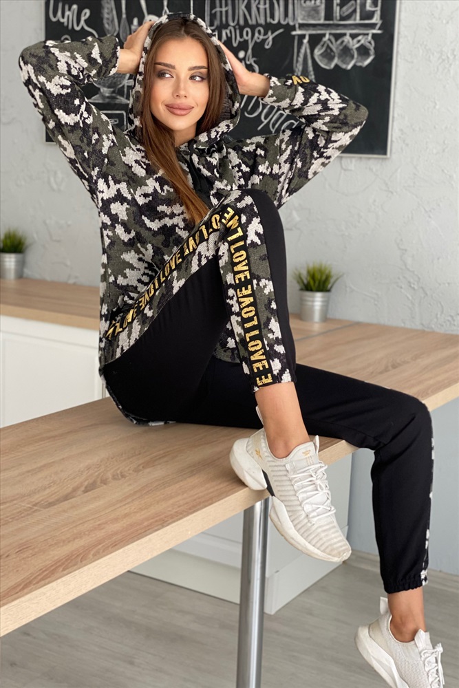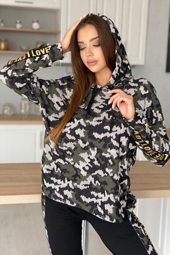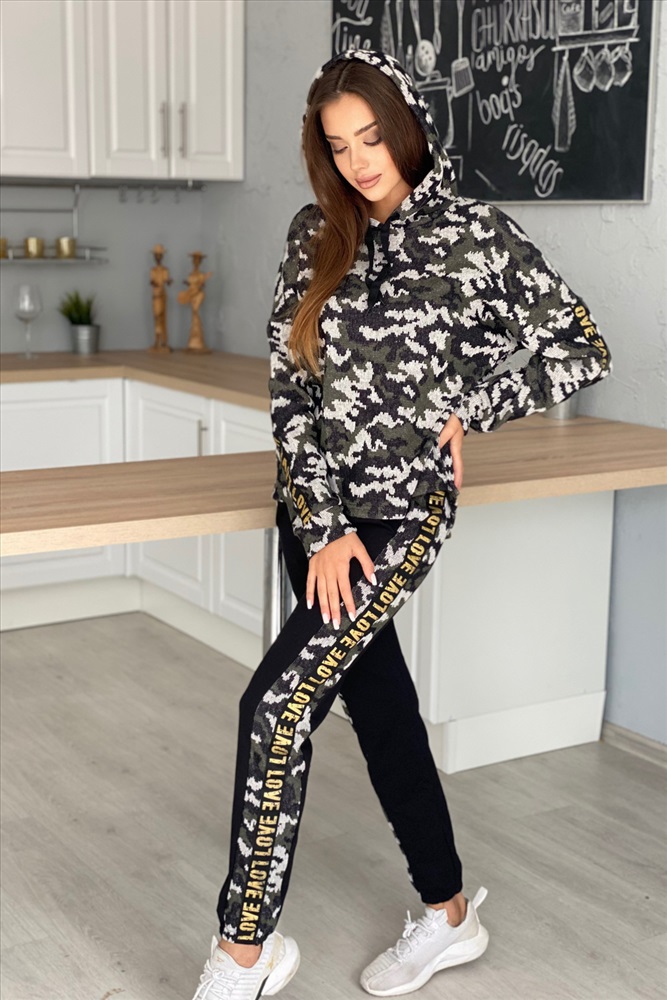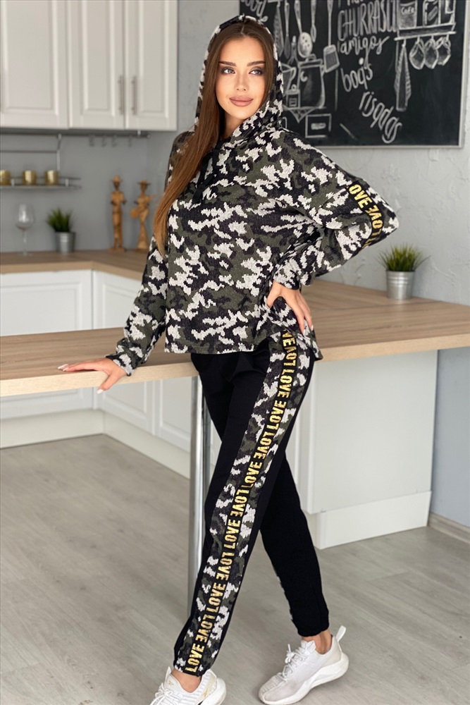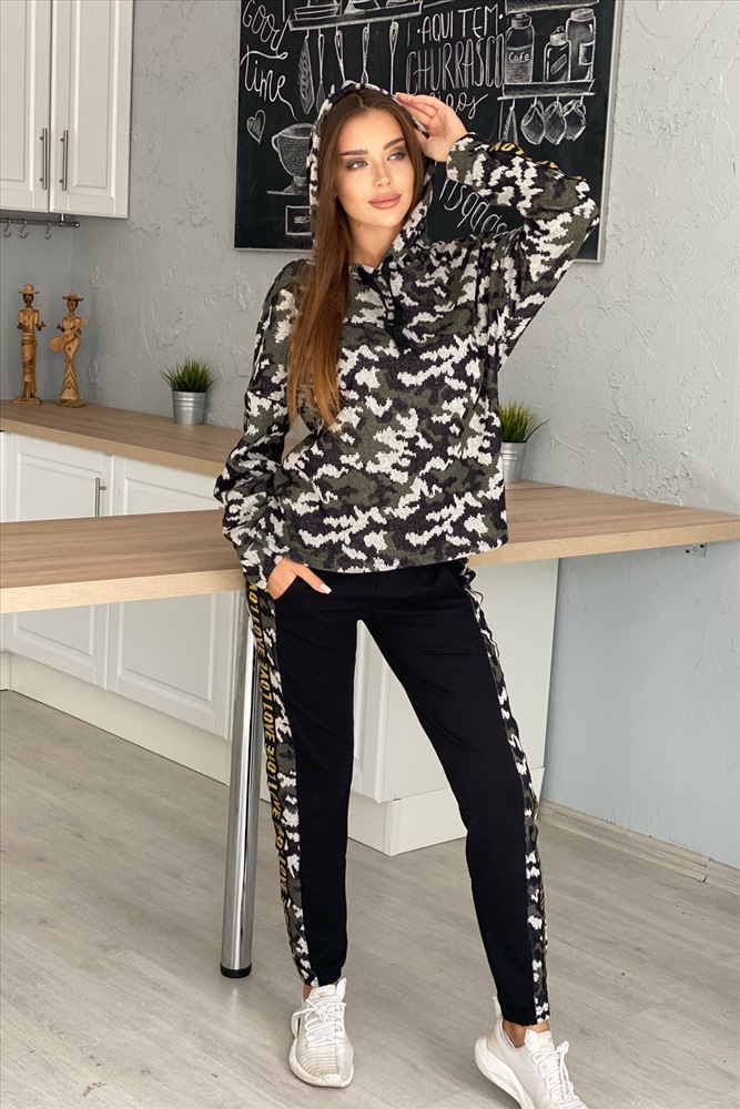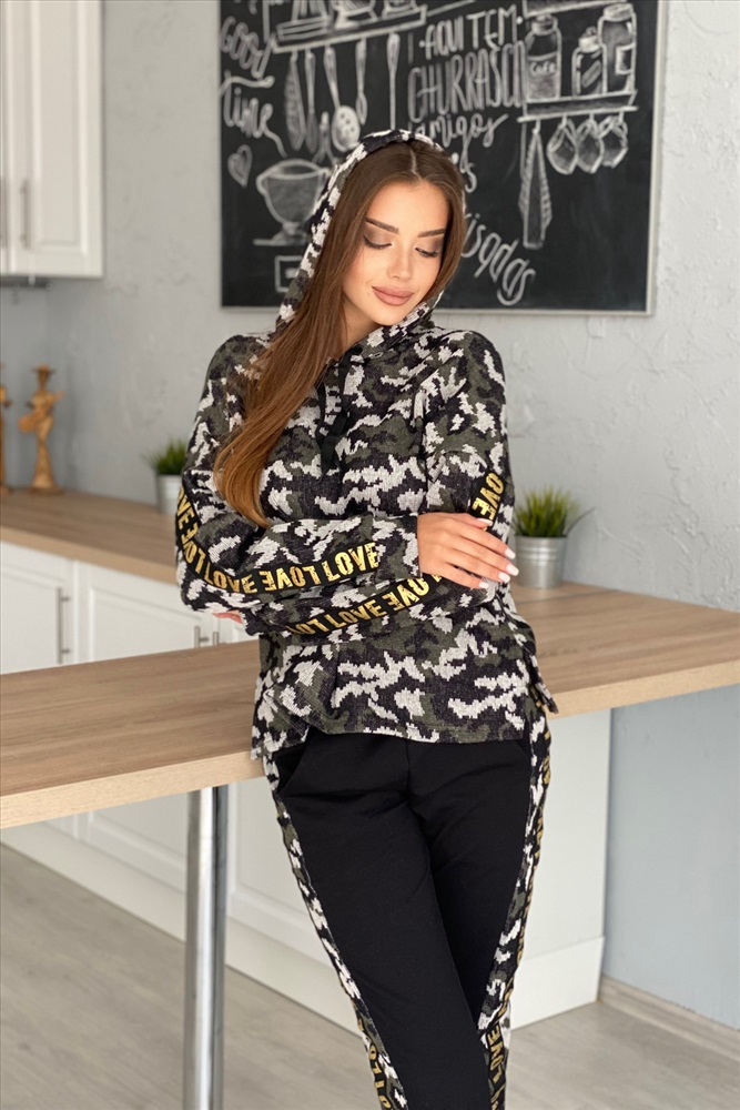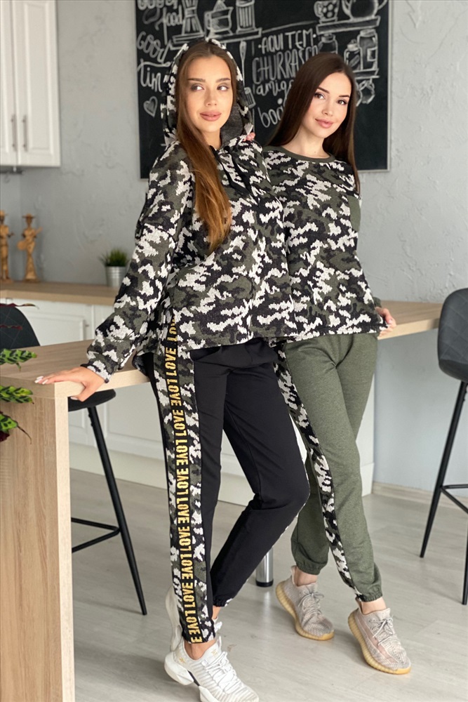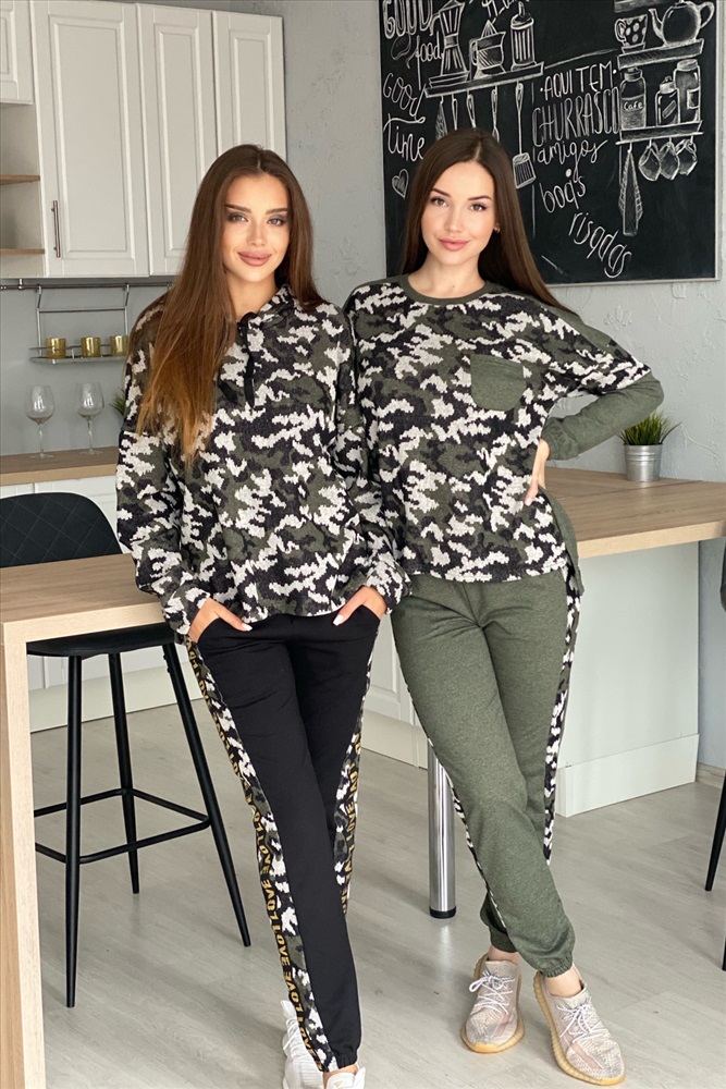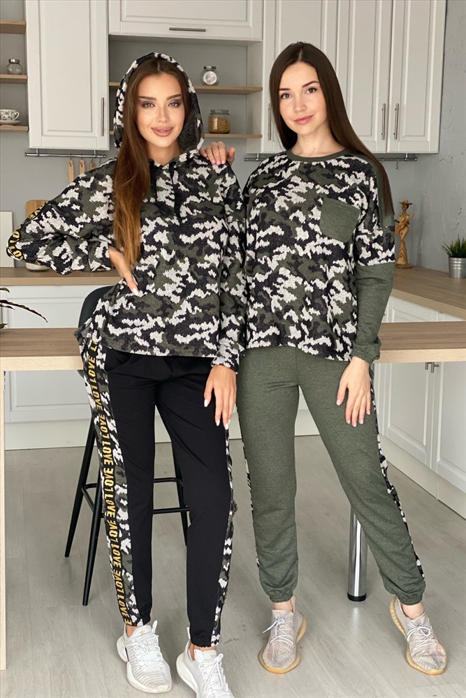 Застежка: без застежки Костюм состоит из толстовки и брюк. Брюки на поясе, с боковыми карманами, с лампасами из отделочного полотна по боковым швам, на резинке по низу. Толстовка прямая, свободная, с капюшоном, с длинным рукавом на манжете. Низ спинки фигурный. В нижней части боковых швов обработаны разрезы.