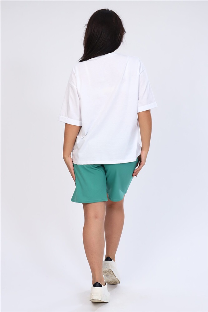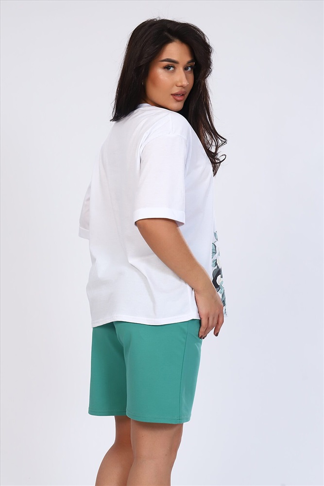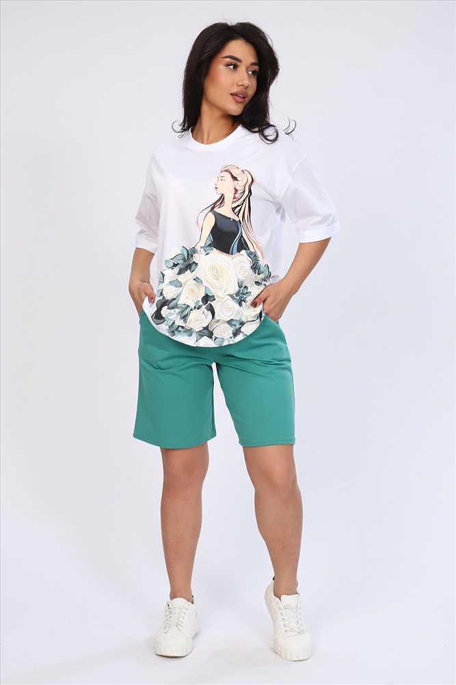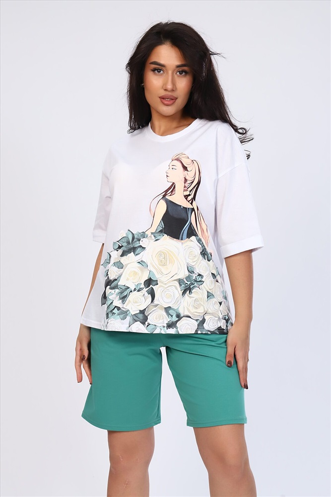 Страна производства: Россия Костюм женский состоит из футболки с ярким принтом и шорт - бермуды. Костюм выполнен из качественного трикотажа - футболка из кулирки качества кардэ, шорты из футера с лайкрой высокого качества пенье компакт. Футболка в свободном стиле оверсайз, круглая горловина обработана рибаной с лайкрой, широкий до локтя рукав на манжете. Шорты - бермуды на широком распошитом поясе, удобная посадка, боковые карманы. Стильный, комфортный, приятный к телу костюм отличный вариант для активного отдыха и просто летних прогулок. Длина рукава в таблице измерений указана от начала плечевого шва.