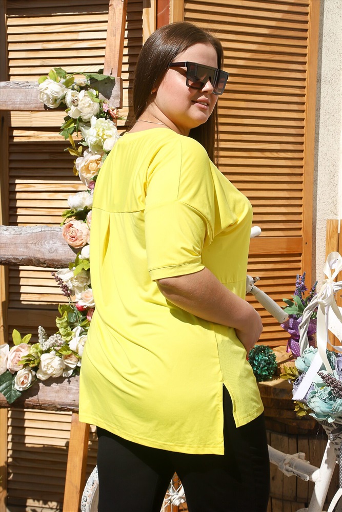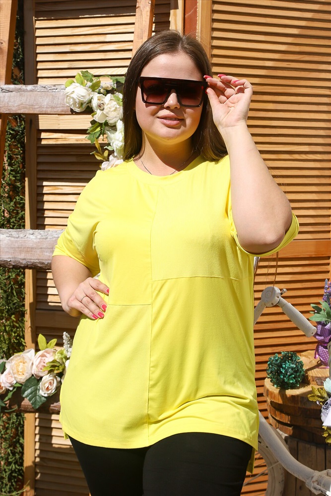 Костюм состоит из футболки и брюк. Футболка прямого силуэта, с округлой горловиной, с удлиненной спинкой, с разрезами в нижней части боковых швов. На полочке расположены вставки из отделочного полотна. Спинка с кокеткой. Рукав короткий, обработанный эластичным манжетом. Горловина обработана эластичной обтачкой. Брюки на поясе, с боковыми карманами. В верхней части передних половинок по шву притачивания пояса расположены складки. На моделях 48 и 52 размеры