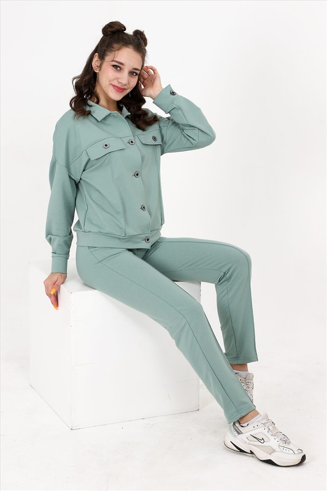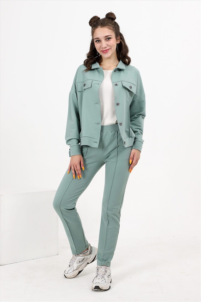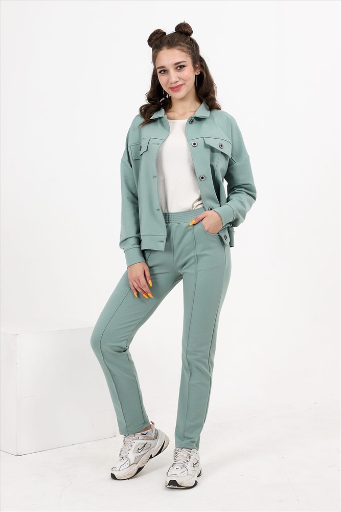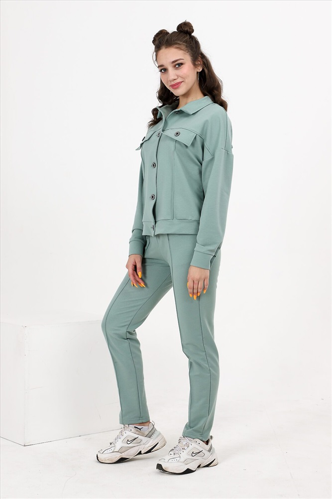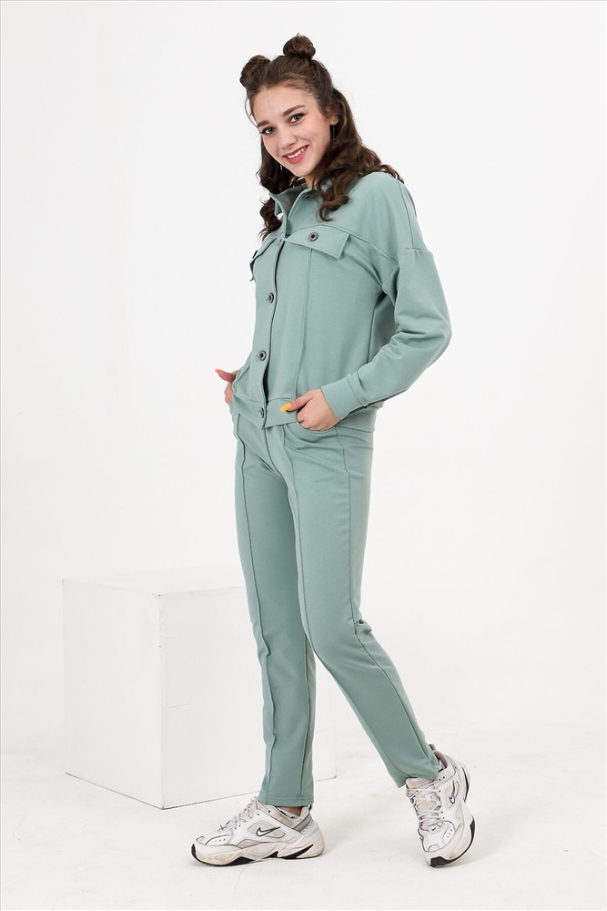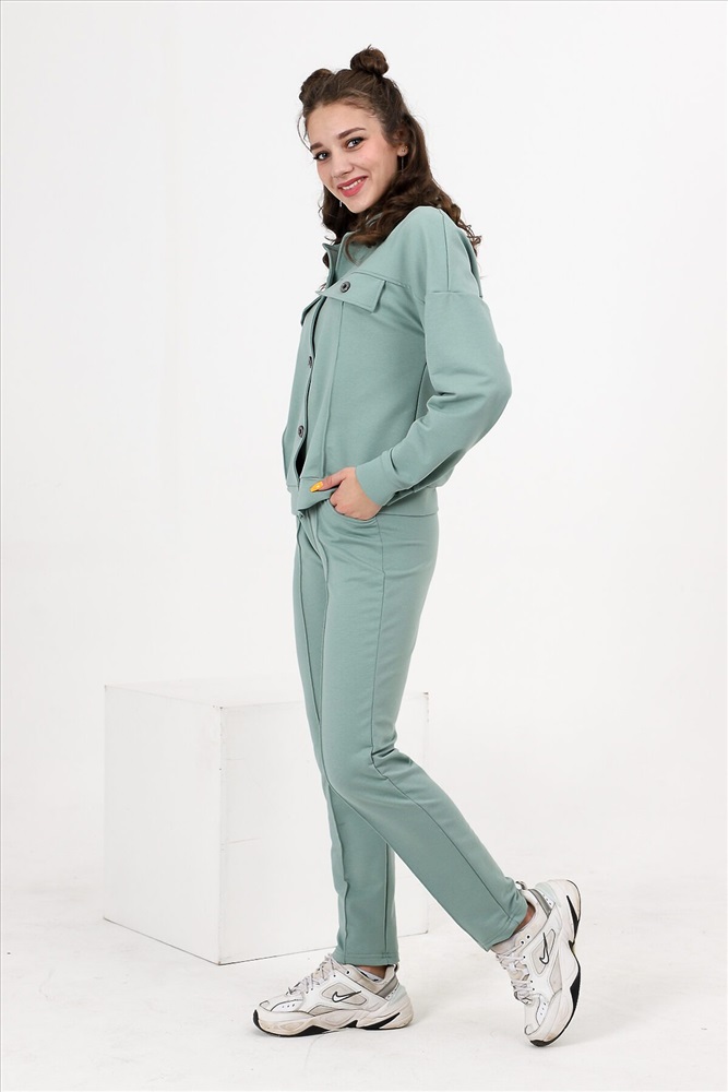 Костюм состоит из бомбера и брюк. Бомбер с застежкой на пуговицы и петли, с отложным воротником, свободная, на поясе. Полочка и спинка с кокетками. Рукав длинный, на манжете с застежкой на петлю и пуговицу. Брюки на поясе, с боковыми карманами. Вдоль передних половинок обработаны "стрелки".
