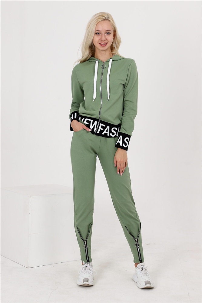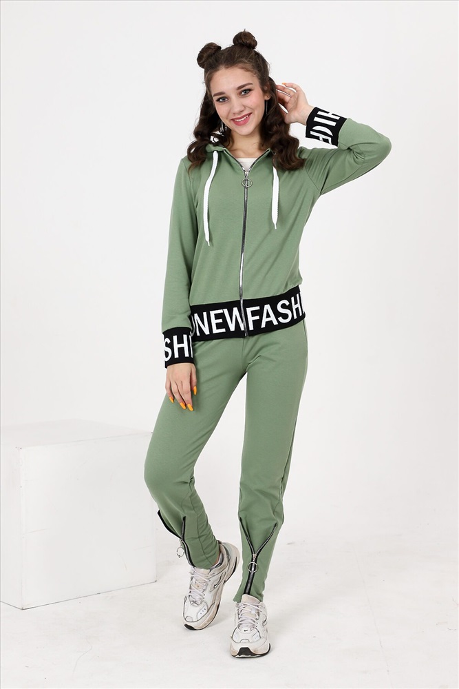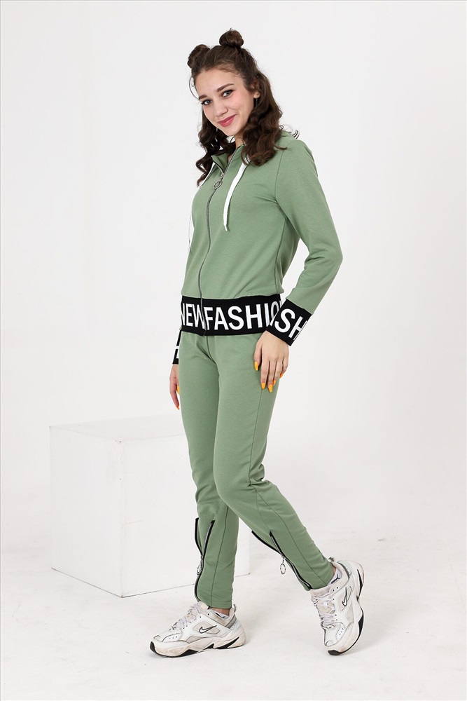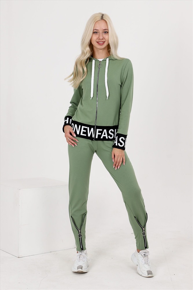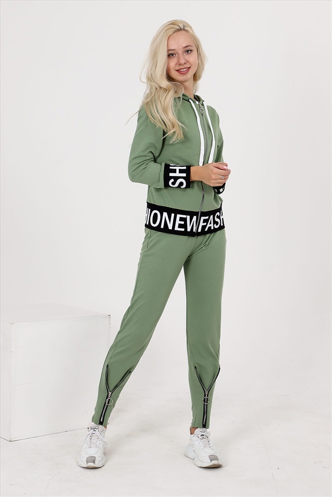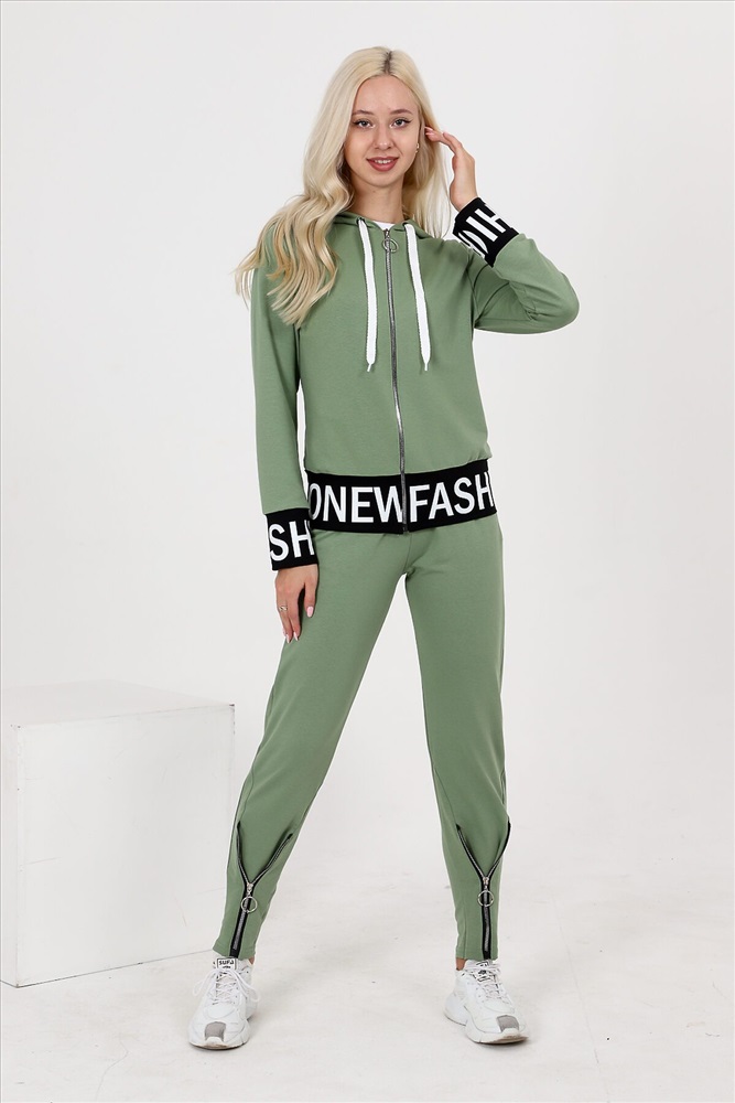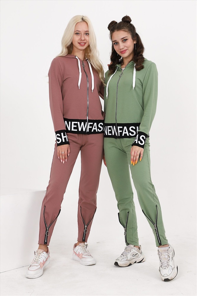 Костюм состоит из толстовки и брюк. Толстовка прямая, полуприталенная, с капюшоном, на молнии, на поясе. Рукав втачной, длинный, на манжете. Пояс куртки и манжеты рукавов выполнены из контрастного полотна с принтом. Брюки полуприлегающего силуэта, с боковыми карманами, на эластичном поясе. В нижней части передних половинок обработаны декоративные элементы с молниями.
