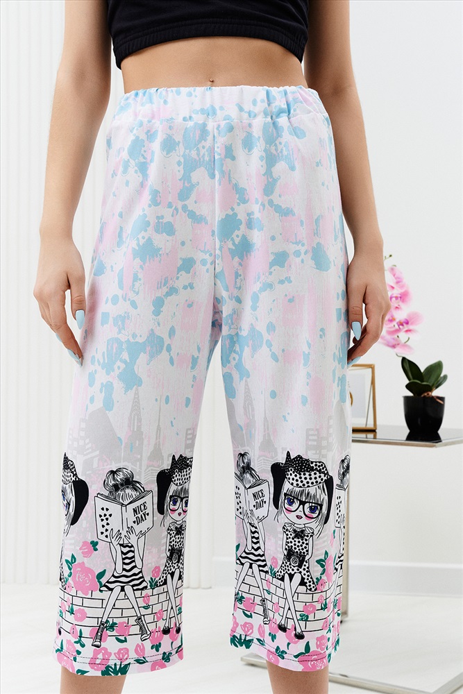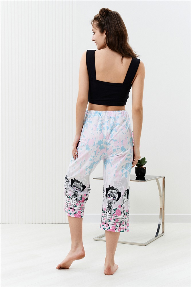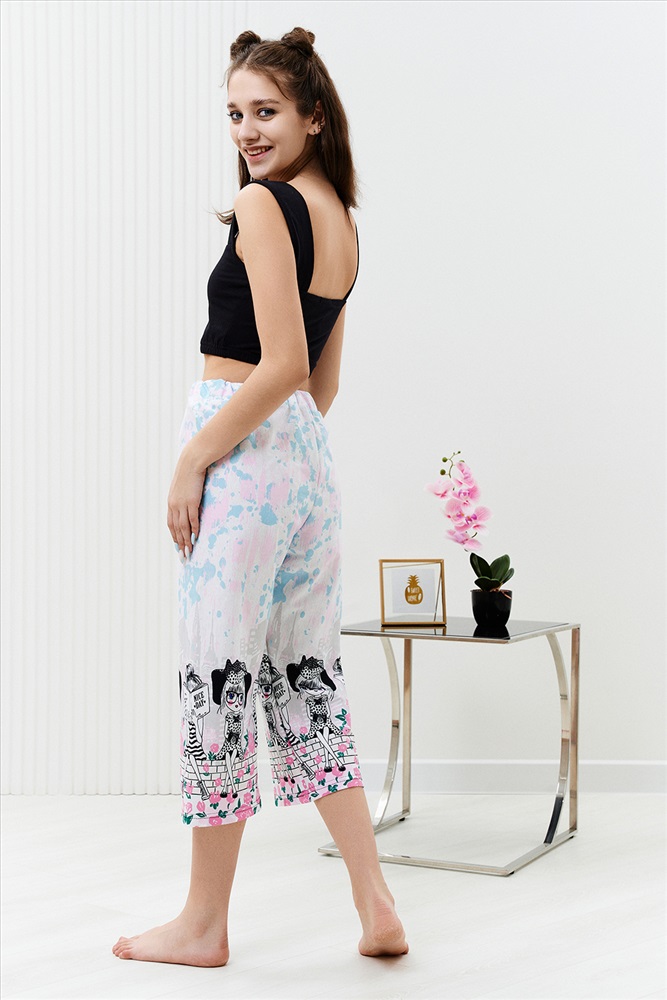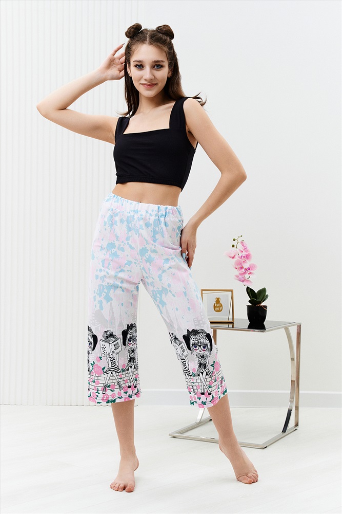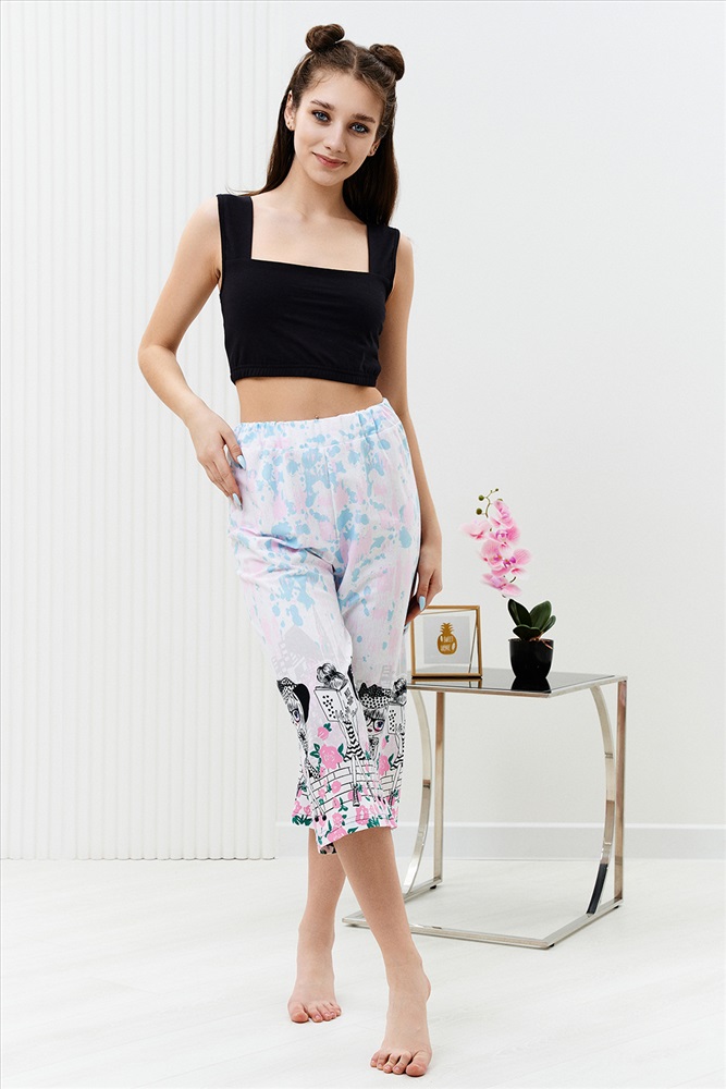 Застежка: без застежки Комплект состоит из топа и укороченных брюк кюлот. Топ из кулирки с лайкрой на широких бретелях, с квадратной горловиной, длиной выше линии талии. Верх спинки и низ топа собраны на резинке. Проймы обработаны бейкой из основного полотна. Брюки из кулирки прямые, свободные, укороченные, на поясе.