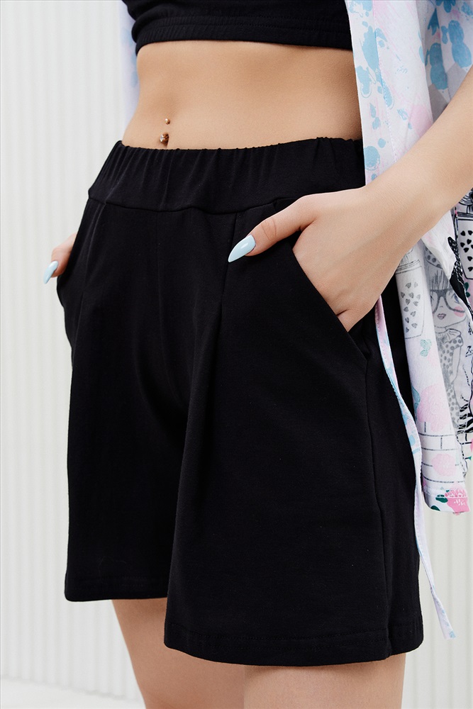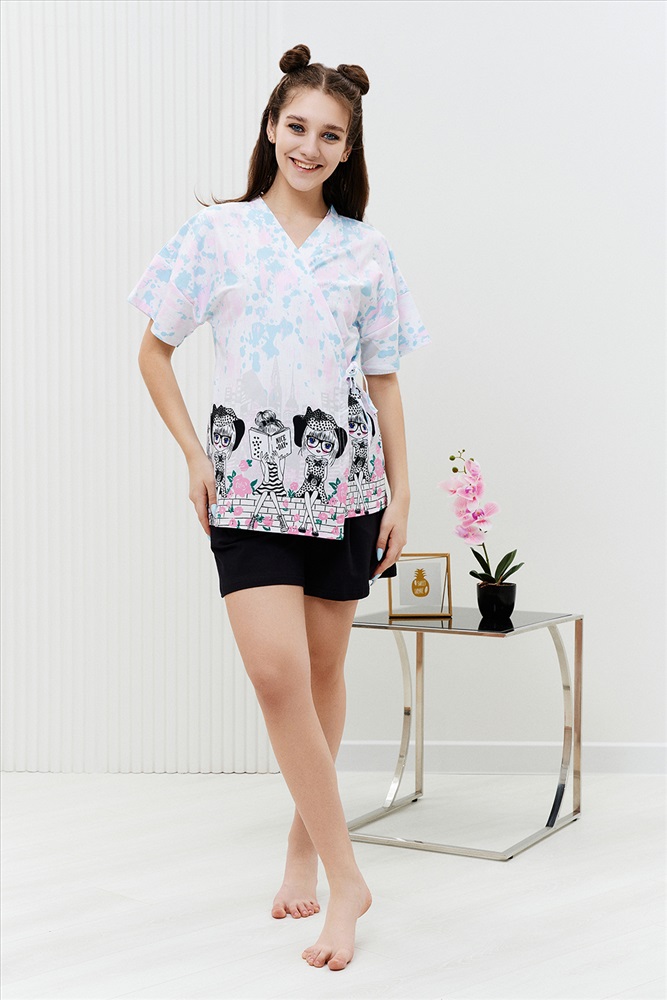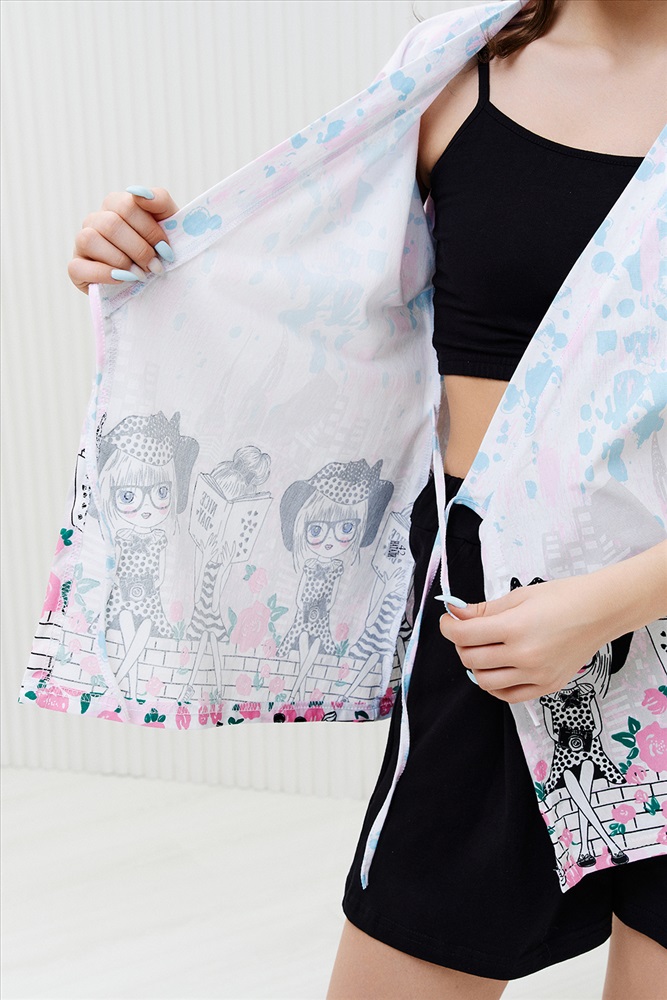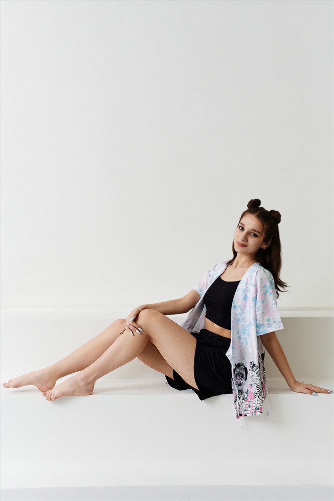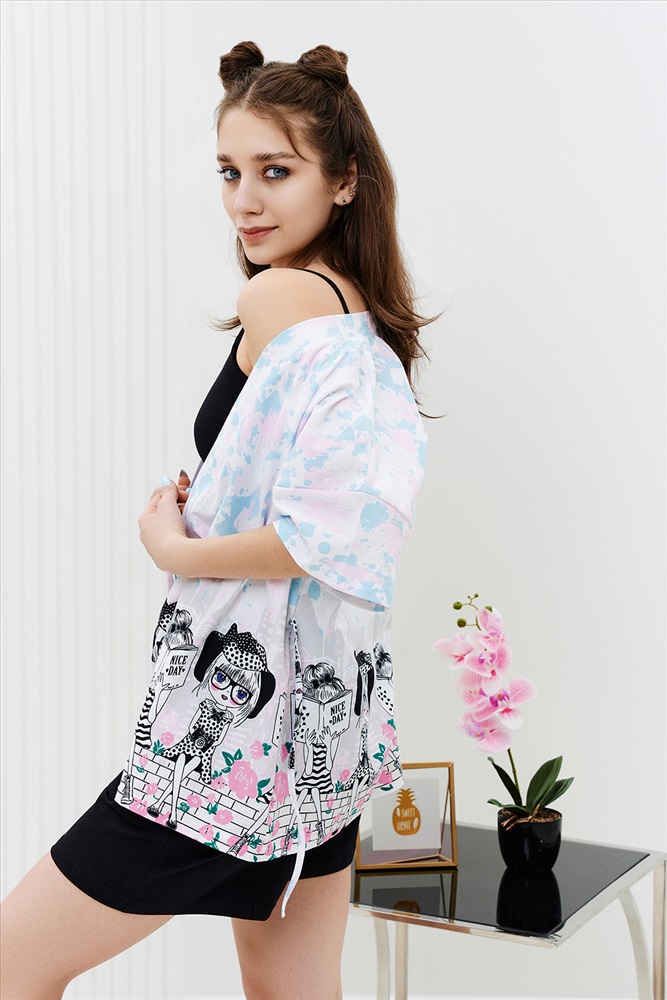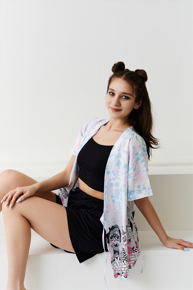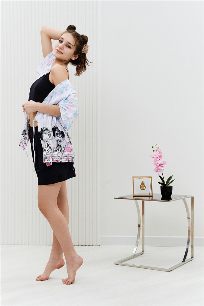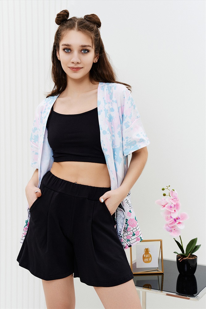 Застежка: на запах Комплект состоит из топа, шорт и короткого кимоно. Топ из эластичного полотна, на тонких бретелях, длиной выше линии талии, с резинкой по низу. Горловина и бретели топа обработаны бейкой из основного полотна. Шорты из кулирки с лайкрой на поясе, с боковыми карманами. В верхней части передних половинок по шву притачивания пояса расположены складки. Кимоно выполнено из отделочного полотна из кулирки, полуприлегающего силуэта, длиной до середины бедра, с коротким рукавом. Горловина обработана обтачкой.
