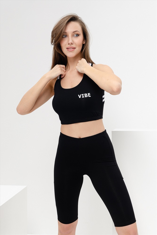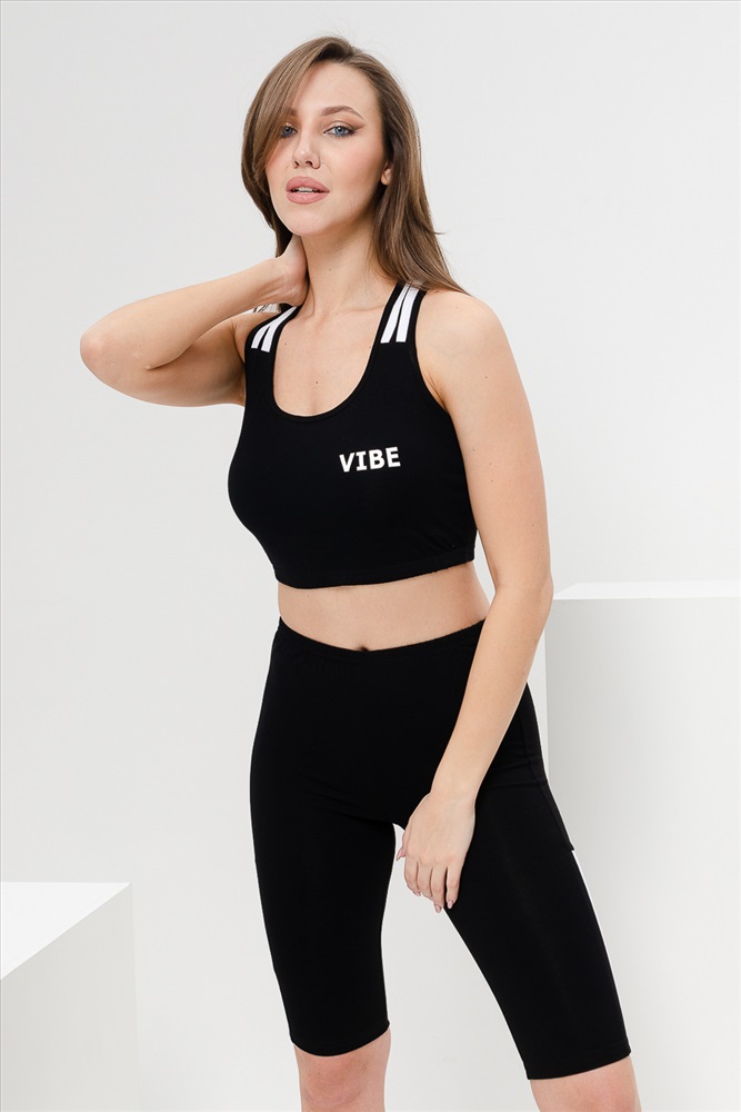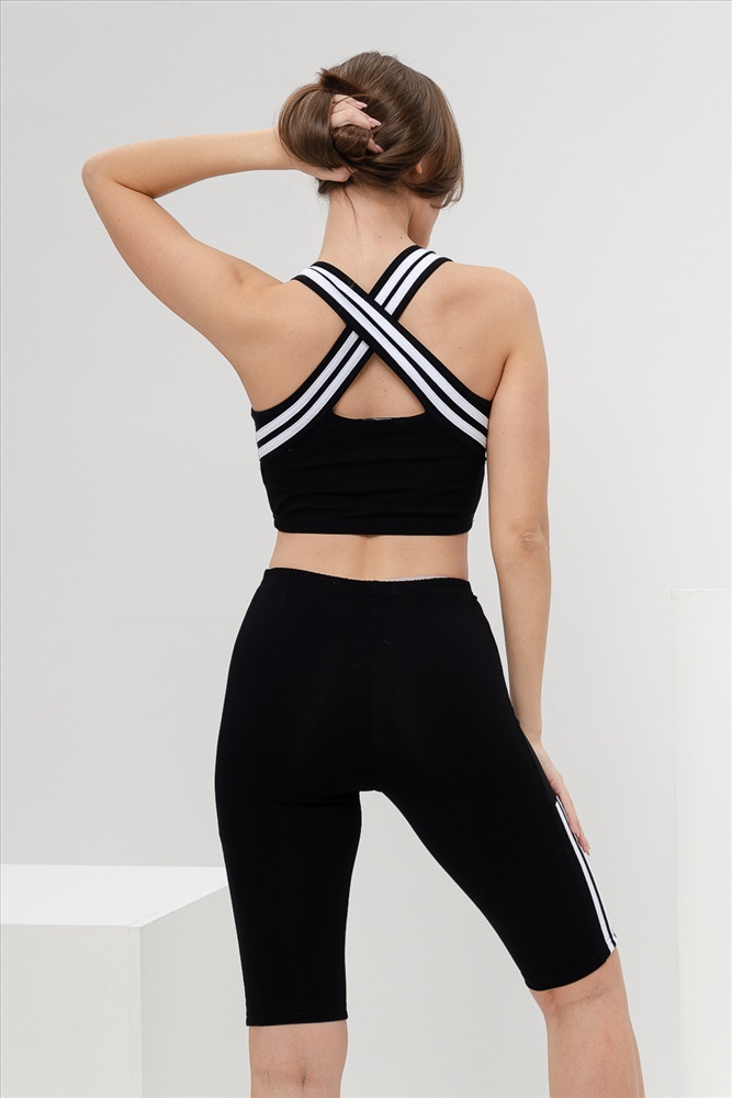 Застежка: без застежки Комплект состоит из топа и велосипедок. Топ на широких бретелях, с округлой горловиной на полочке. В верхней части спинки расположены перекрещенные бретели с отделочными лампасами. Горловина, проймы и бретели обработаны бейкой из основного полотна. Велосипедки облегающие, длинной выше колена, сверху на резинке. Вдоль боковых швов расположены вставки с отделочными лампасы.