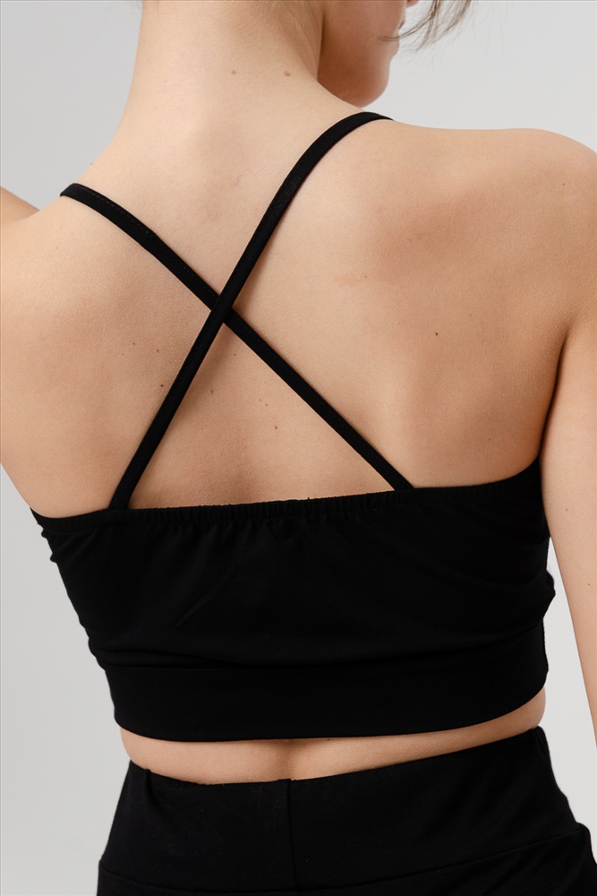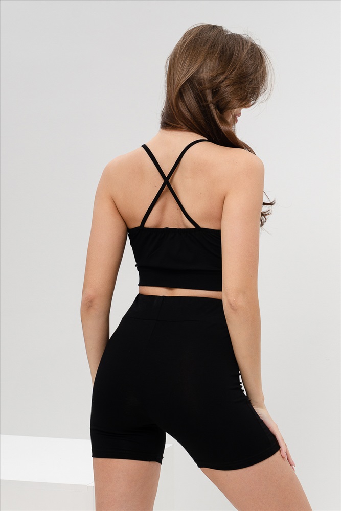 Застежка: без застежки Комплект состоит из топа и шорт-велосипедок. Топ на тонких бретелях, с округлой горловиной на полочке. Вдоль боковых швов на полочке расположены отделочные лампасы. В верхней части спинки расположены перекрещенные бретели. Верх спинки собран на резинку. Горловина, проймы и бретели обработаны бейкой из основного полотна. Шорты облегающие, длинной выше колена, с завышенной линией талии, сверху на широком эластичном поясе.