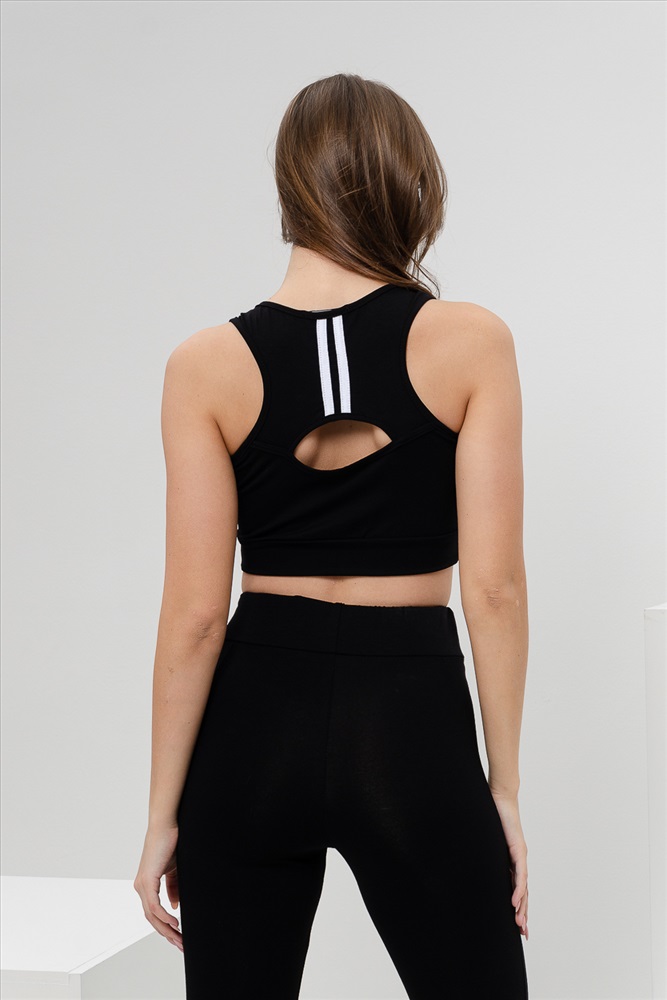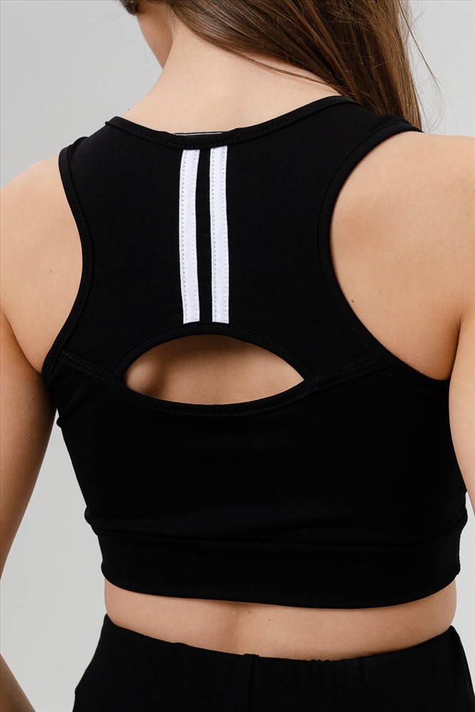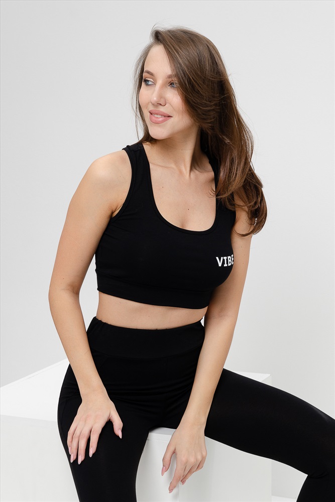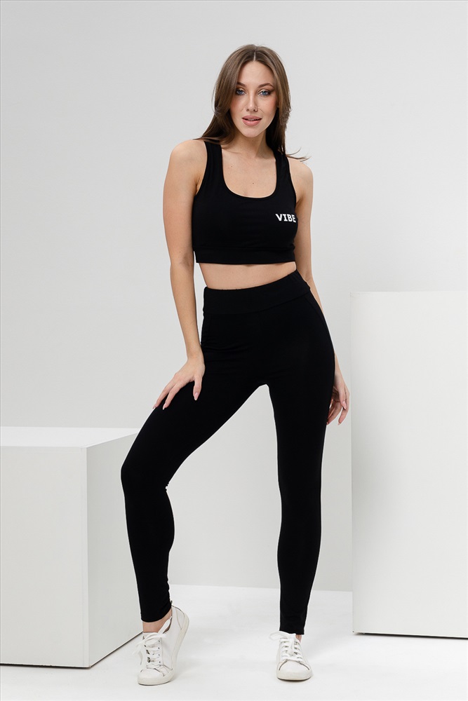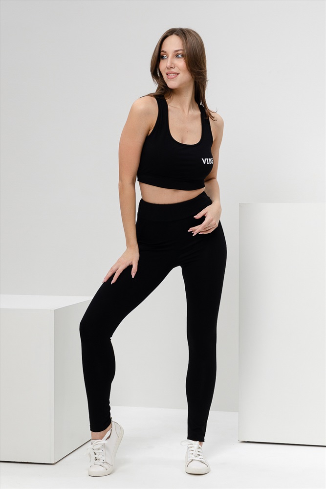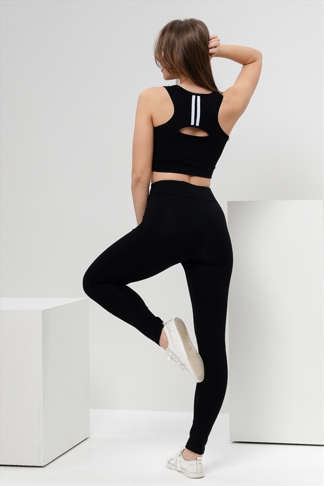 Застежка: без застежки Комплект состоит из топа и леггинсов. Топ на узких бретелях, с округлой горловиной на полочке и вырезом борцовка сзади. В верхней части спинки расположена фигурная кокетка с отделочными лампасами и декоративным вырезом. Горловина, проймы и вырез на спинке обработаны бейкой из основного полотна. Леггинсы облегающие, длинные, с завышенным уровнем талии, сверху на широком эластичном поясе. В верхней части боковых швов расположены вставки.