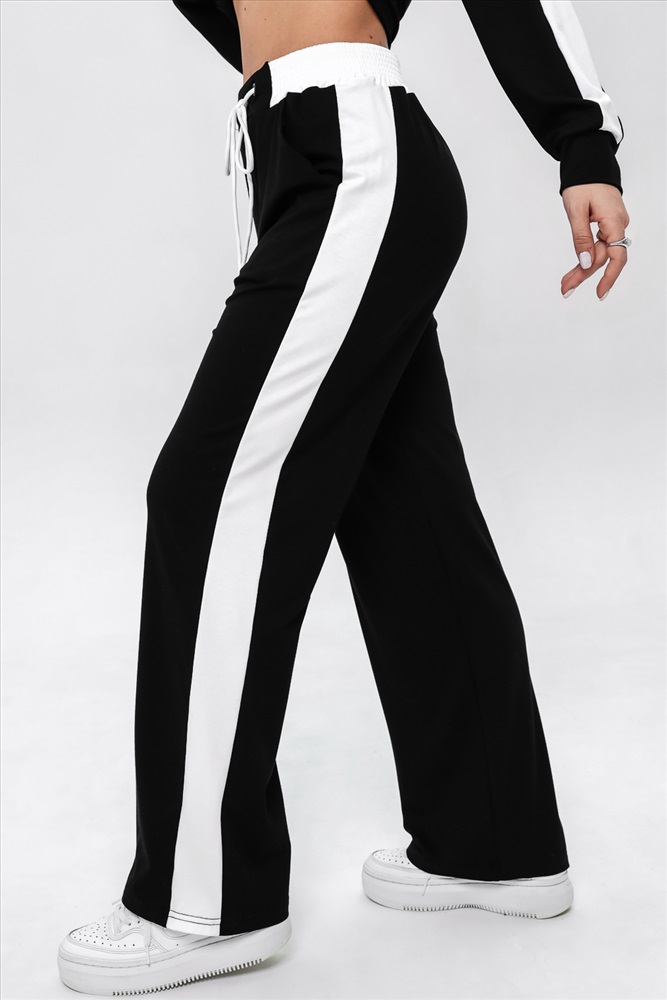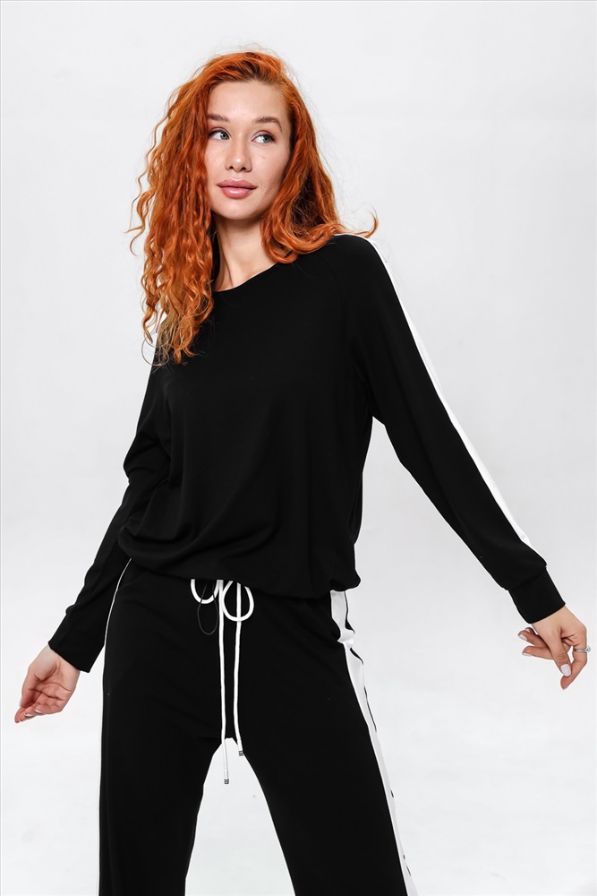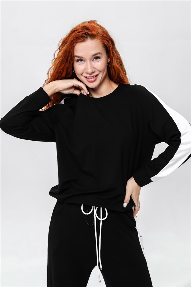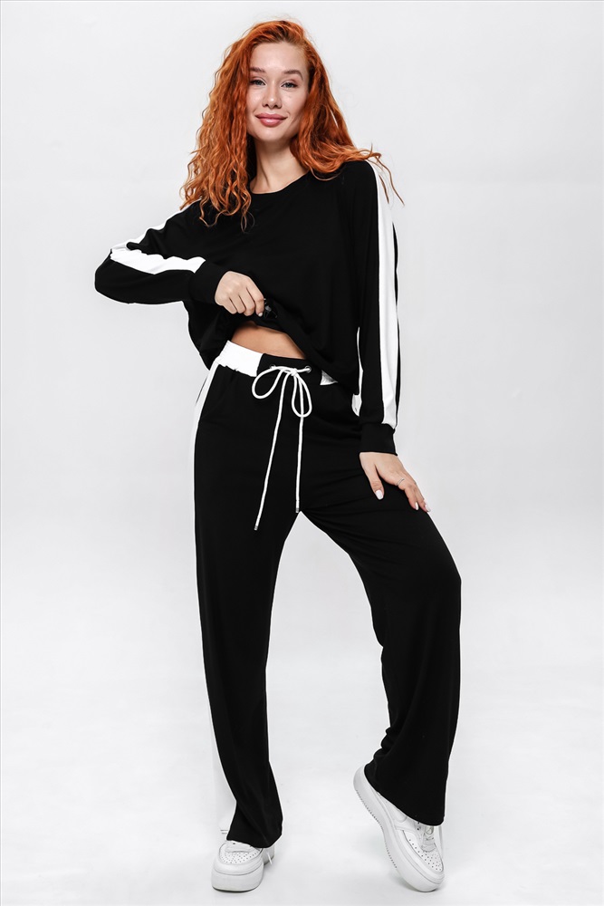 Костюм состоит из туники и брюк. Туника прямая, с округлой горловиной, с резинкой по низу. Рукав реглан, длинный, с лампасом из отделочного полотна вдоль рукава, на манжете. Горловина обработана обтачкой из основного полотна. Брюки прямые, на поясе, с боковыми карманами, с лампасами из отделочного полотна вдоль боковых швов.
