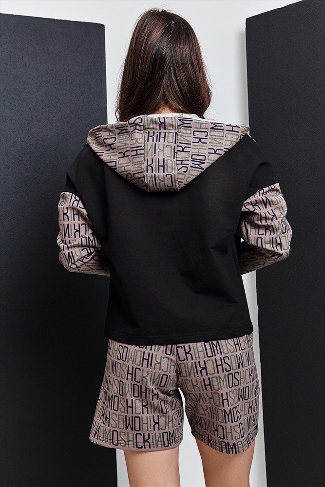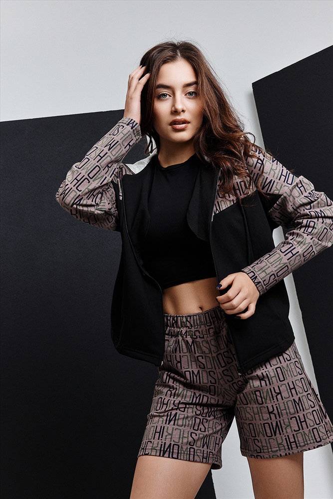 Костюм состоит из толстовки и шорт. Толстовка прямая, свободная, с капюшоном, на молнии. Полочка с кокетками и вертикальными рельефами. В рельефных швах обработаны карманы. Рукав длинный. Шорты прямые, на поясе, с боковыми карманами.