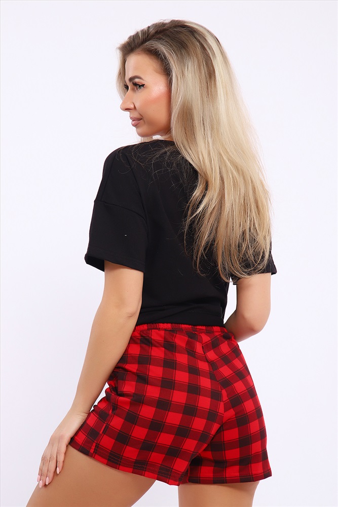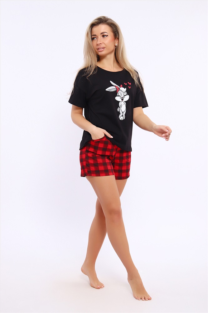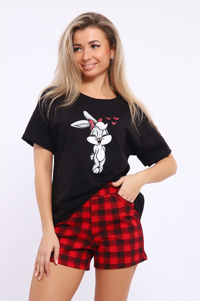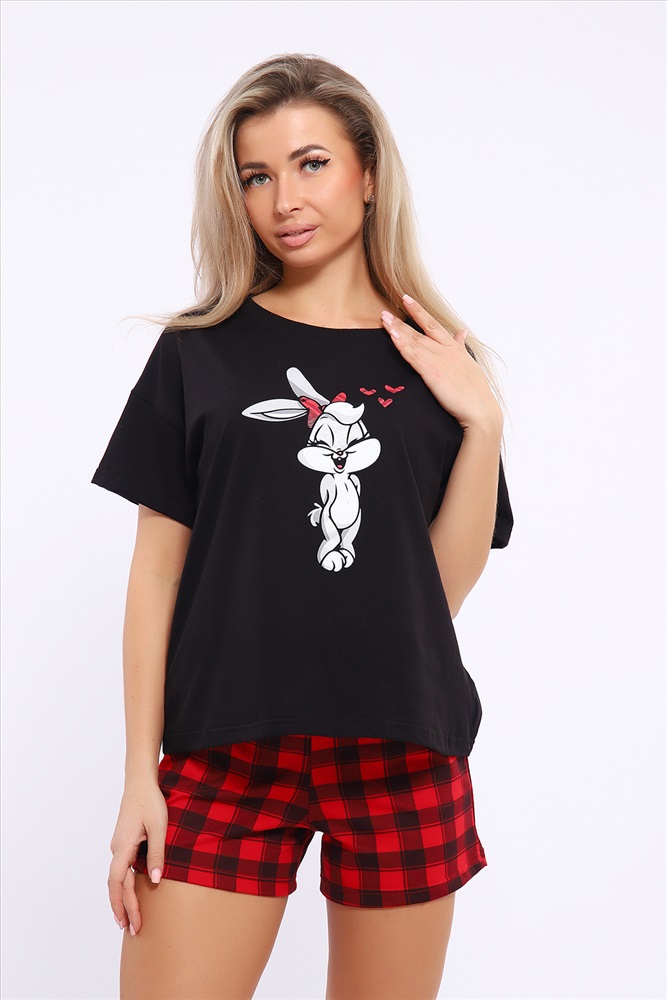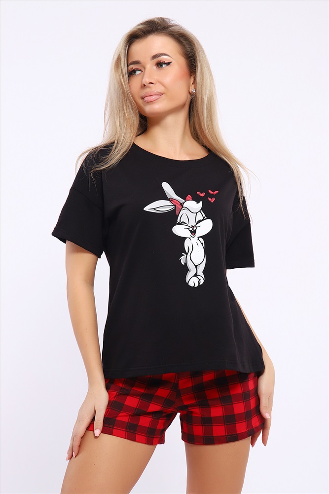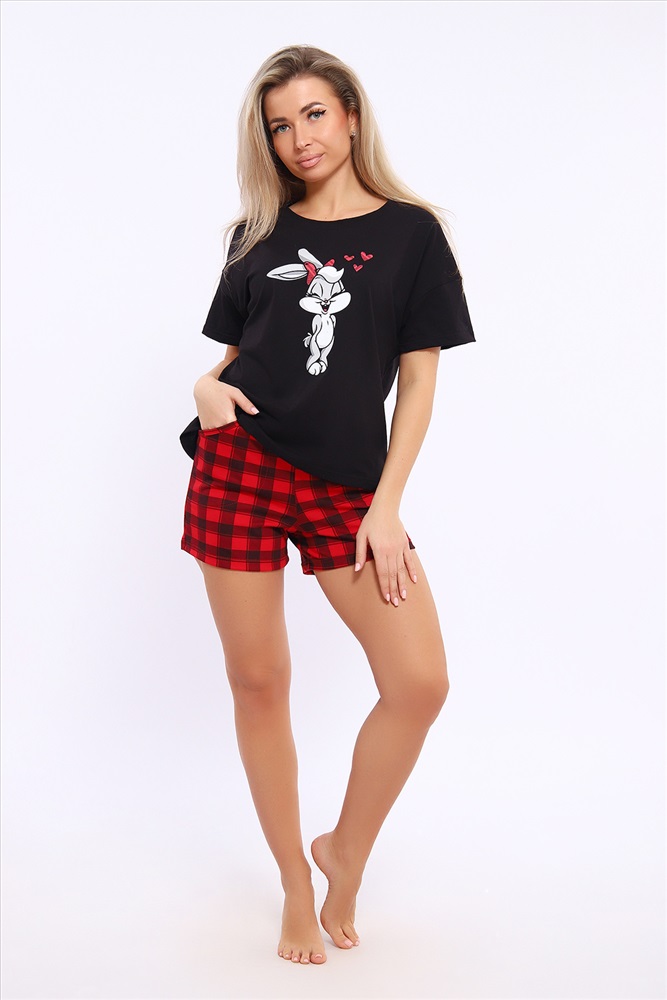 Застежка: без застежки Костюм женский комбинированный с шортами. Данная модель выполнена из трикотажного полотна кулирка ( хлопок 100%). Футболка свободного покроя с принтом. Шорты с поясом и карманами. Отлично подходит для дома и отдыха.