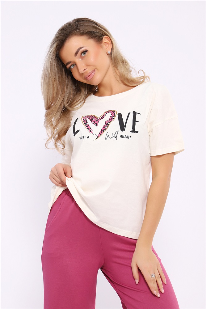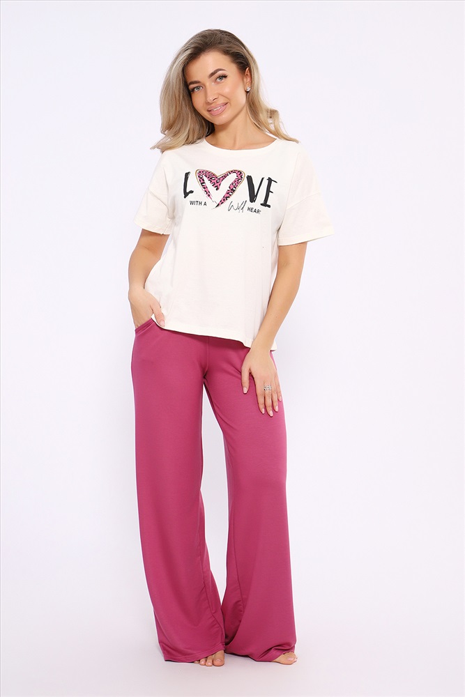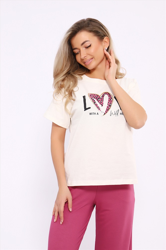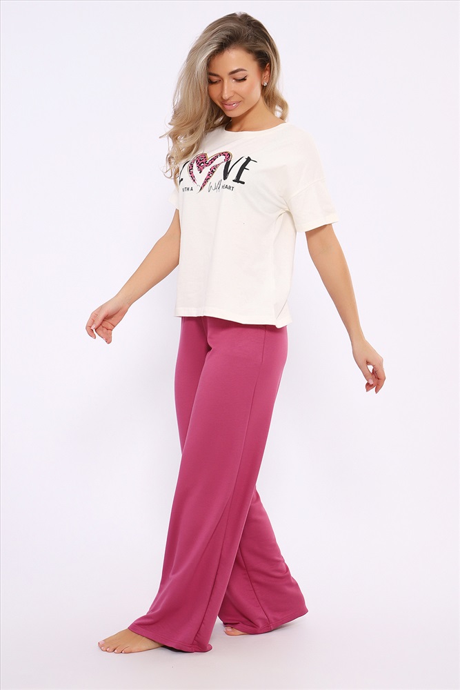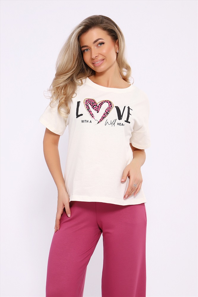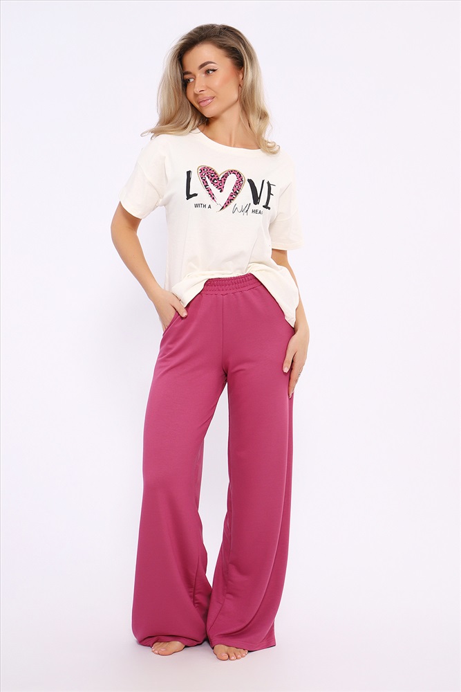 Застежка: без застежки Костюм женский (брюки и футболка с принтом). Брюки данной модели выполнены из качественого трикотжного полотна футер 2-х нитка с довавлением вискозы, очень приятная и комфортная ткань. По бокам присутствуют карманы и пояс втачной с отстрочками. Футболка с втачным рукавом но со пущеным плечом, свободного кроя. Выполнена из трикотажного полотна кулирка ( хлопок 100%). Отличная модель для дома и отдыха.