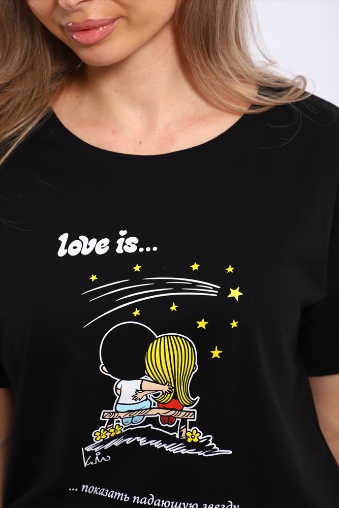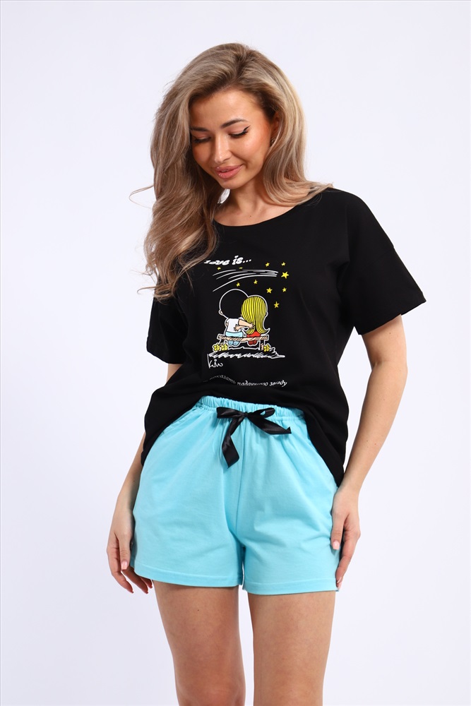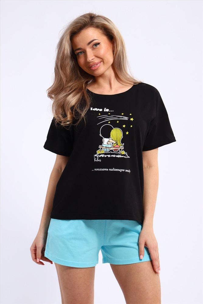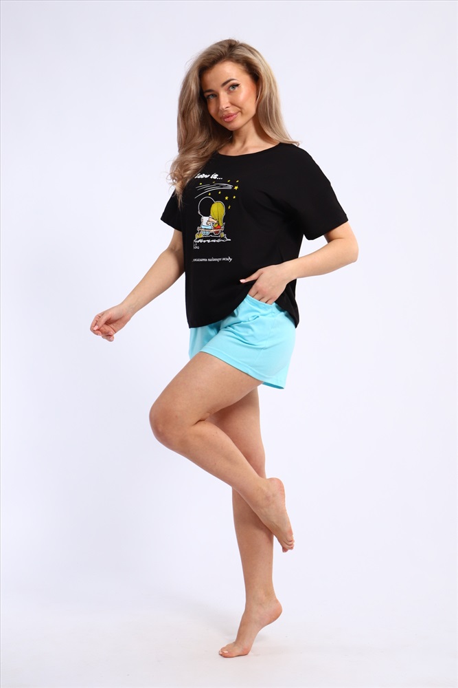 Застежка: без застежки Костюм женский, выполнен из трикотажного полотна кулирка. Костюм состоит из футболки и шорт. Футболка свободного силуэта, горловина окантована, на полочке выполнена печать.
