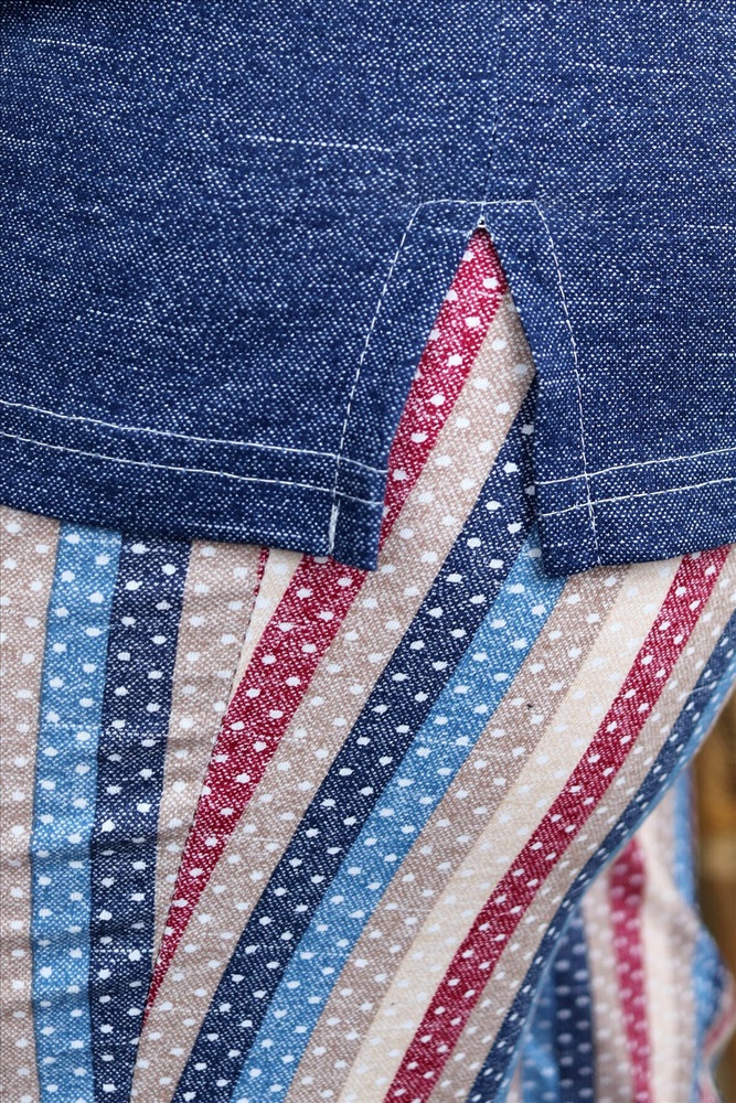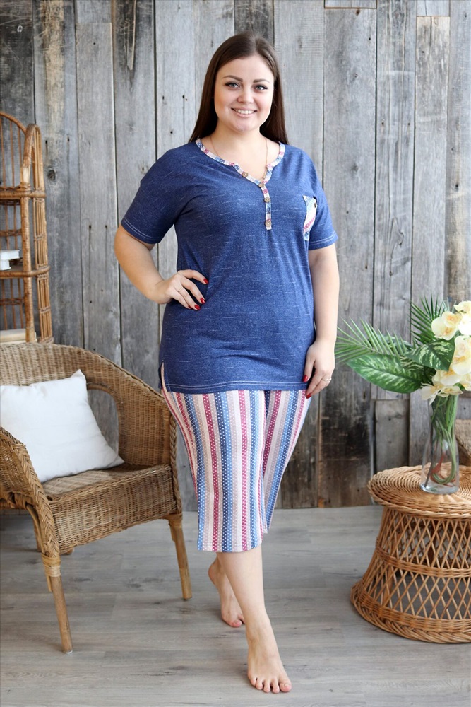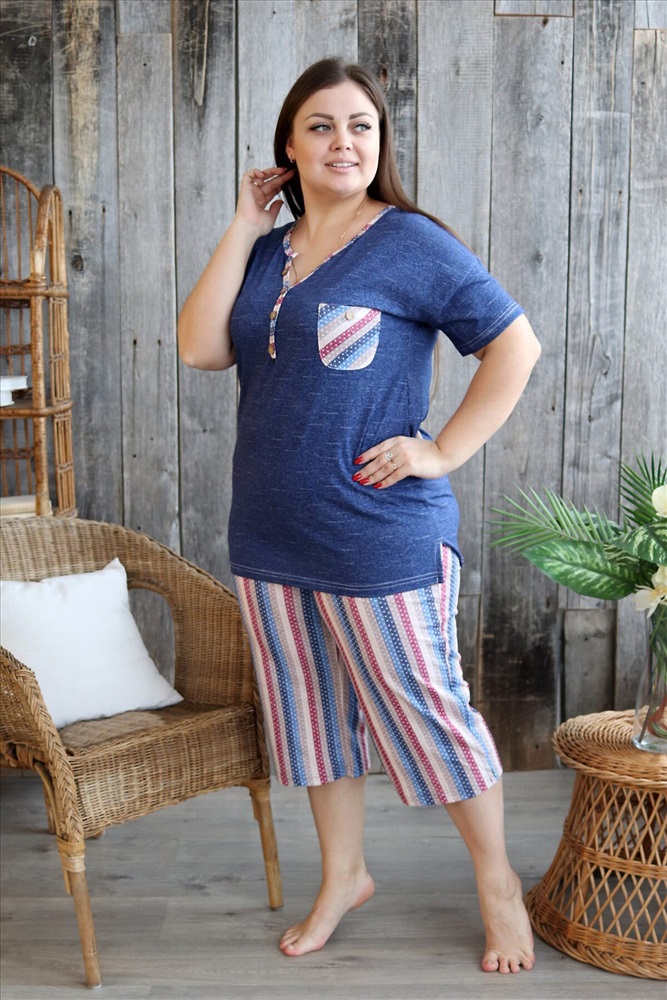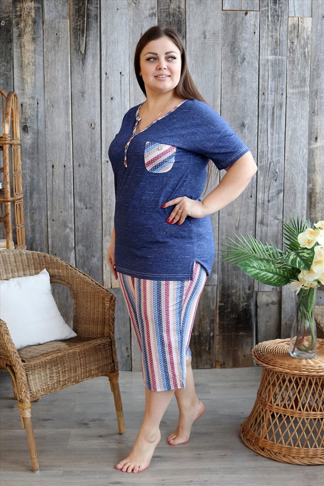 Костюм женский: туника и бриджи. Туника полуприлегающего силуэта с фигурным Y-образным вырезом. Рукав короткий цельнокроенный со швом. На полочке нагрудный карман с пуговицей, из отделочной ткани в полоску. В боковых швах туники и бриджей небольшие разрезы. Бриджи из ткани в полоску, длина ниже колена, на передних частях внутренние карманы, пояс обработан на многоигольной машине. На модели 52 размер