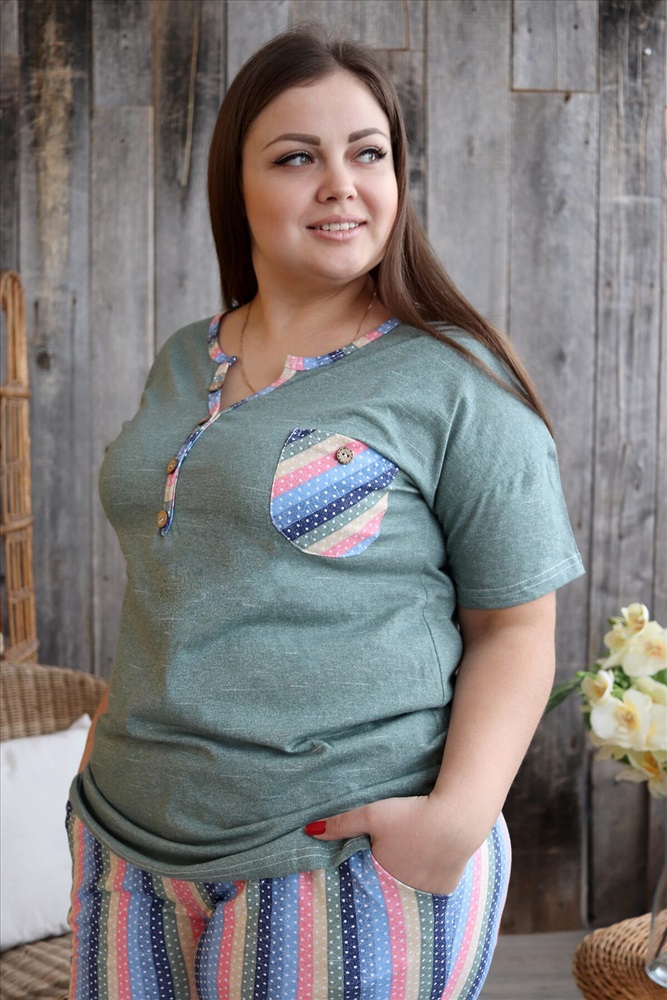 Костюм женский: туника и бриджи. Туника полуприлегающего силуэта с фигурным Y-образным вырезом. Рукав короткий цельнокроенный со швом. На полочке нагрудный карман с пуговицей, из отделочной ткани в полоску. В боковых швах туники и бриджей небольшие разрезы. Бриджи из ткани в полоску, длина ниже колена, на передних частях внутренние карманы, пояс обработан на многоигольной машине. На модели 52 размер