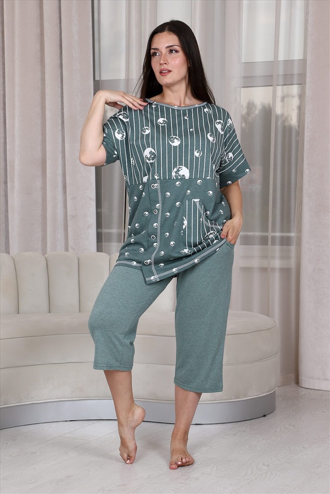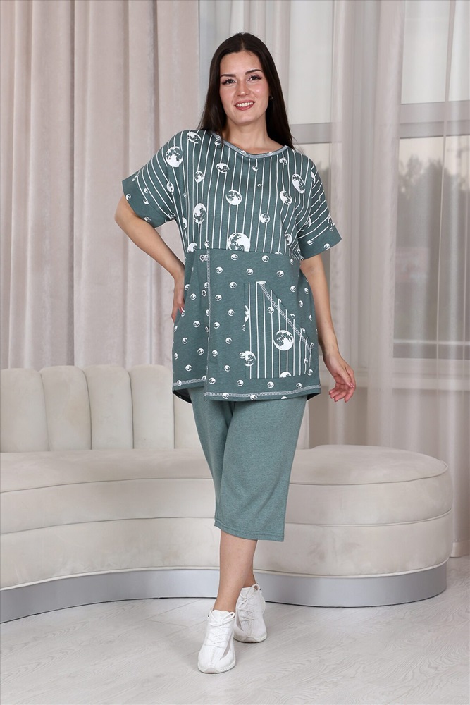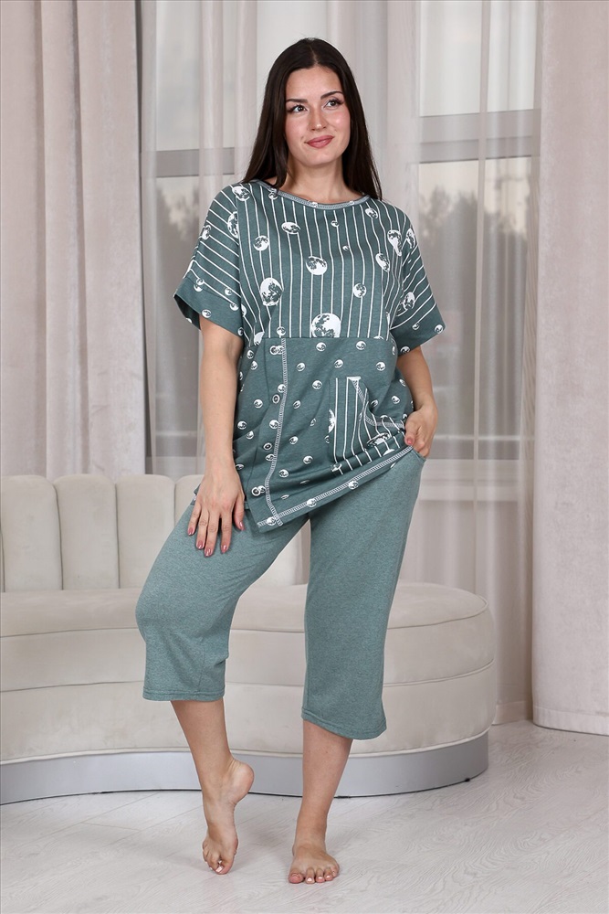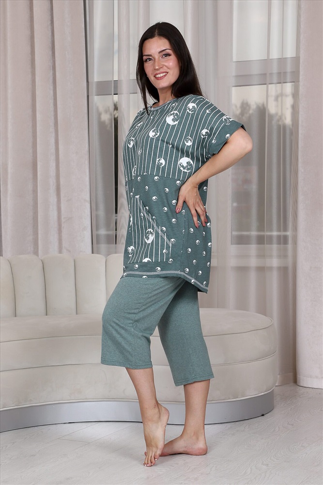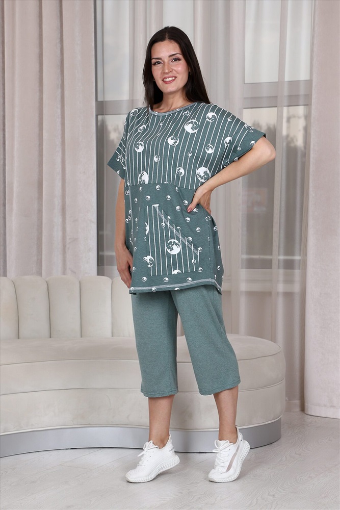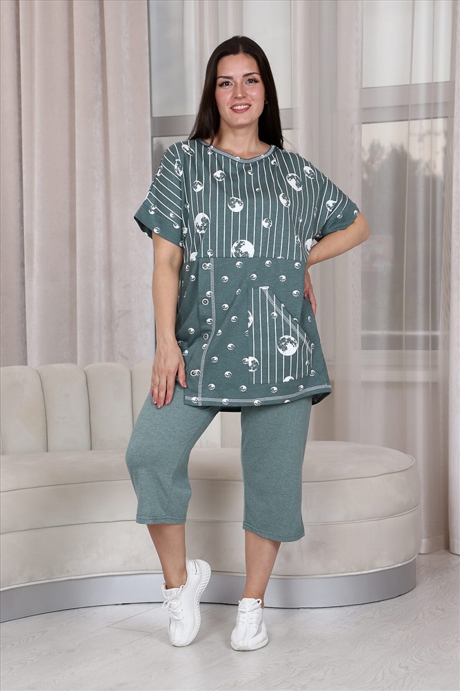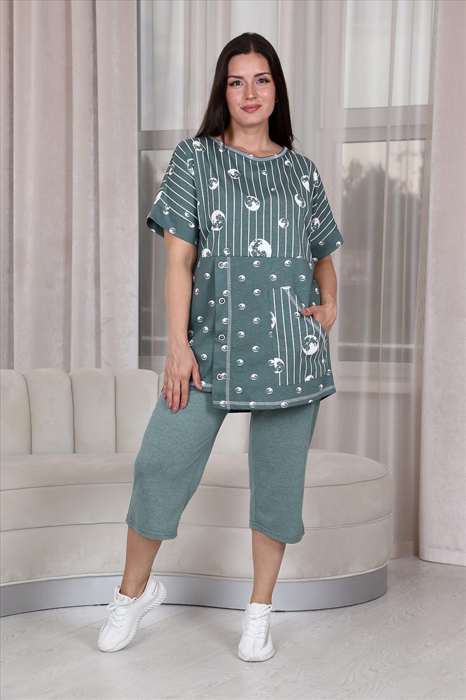 Страна производства: Россия Костюм женский: туника прямого силуэта и капри. Рукав цельнокроенный короткий с манжетой. Верхняя и нижняя часть туники из тканей-компаньонов. В нижней части туники складка с декоративными пуговицами и накладной карман. На передней части брюк внутренние карманы. Пояс выполнен на многоигольной машине.