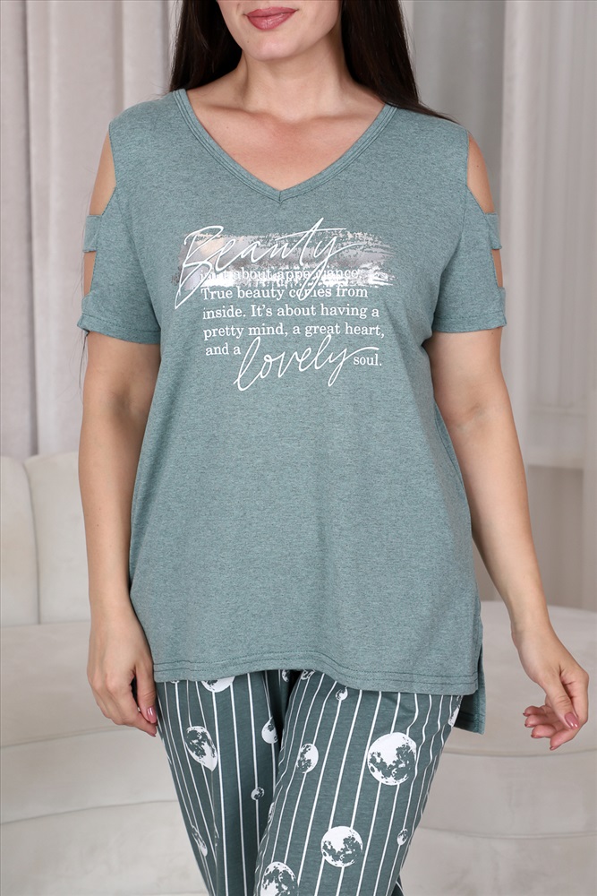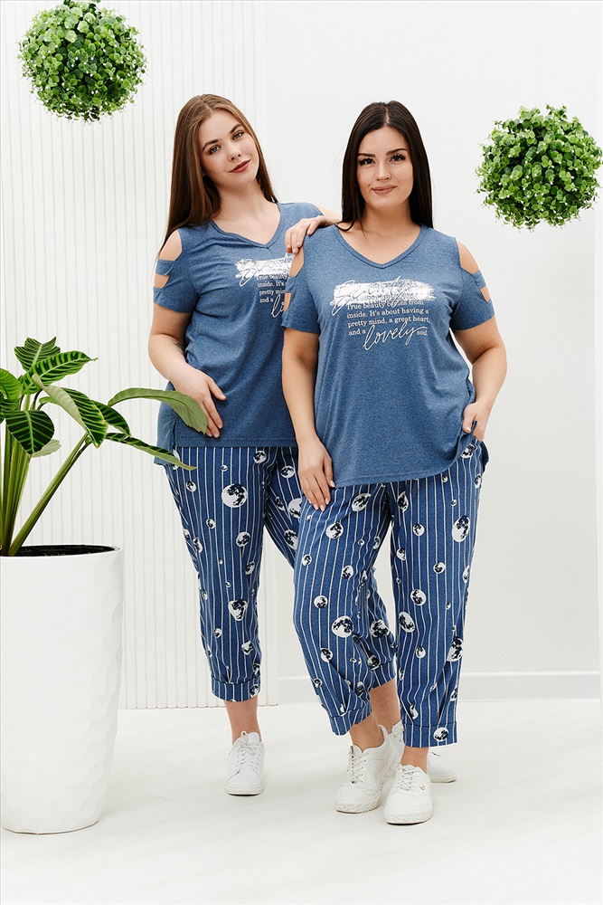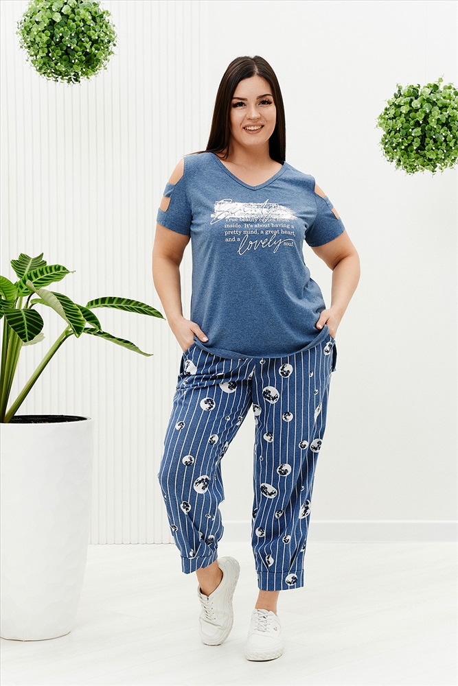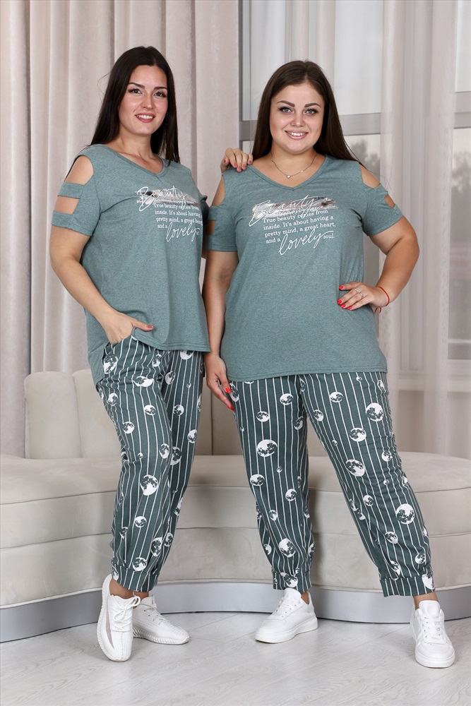 Состав: хлопок 100%; хлопок 43%, ПЭ 57% Модель: Костюм 9143 Тип товара: костюм с брюками Материал: кулирка | кулирка Бренд: Натали Суслова Карман: боковые Назначение: для дачи | для дома НДС: 22% Отделка: с карманами | с манжетами | с печатью Посадка: высокая посадка Рейтинг: Рейтинг 4 и выше Рисунок: надпись Рукав: короткий рукав Сезонность: лето Силуэт: прямой Скидка: любая | от 10% и больше Стиль: домашний Воротник: без воротника Застежка: без застежки Костюм женский: туника и брюки. Туника прямого силуэта, вырез Y-образный. Полочка несколько короче спинки, сбоку разрезы. На полочке принт. Рукав не цельный, два хляста, расположенные через расстояние друг от друга, втачаны в боковые части рукава. Брюки свободные, бананы, внизу передней и задней части по две встречные складки, манжеты. В брюках удобные внутренние карманы, пояс выполнен на многоигольной машине. Таблица размеров и весатуника