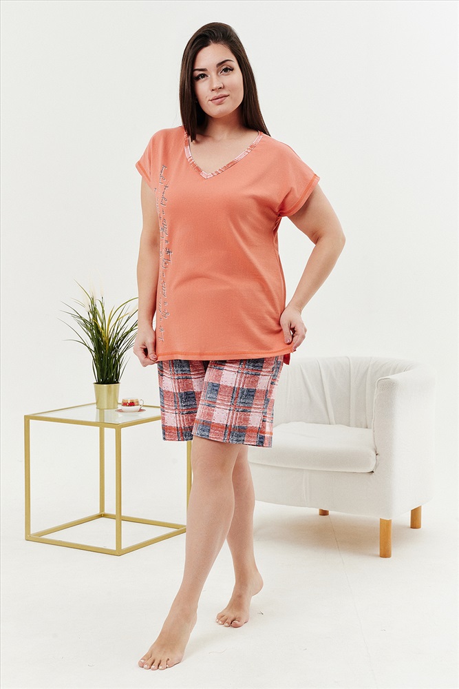 Состав: хлопок 100% Модель: Костюм 9169 Тип товара: костюм с шортами Материал: кулирка | кулирка Бренд: Натали Суслова Карман: боковые Назначение: для дома НДС: 22% Особенности: на резинке Отделка: с карманами | с печатью Посадка: высокая посадка Рейтинг: Рейтинг 4 и выше Рисунок: клетка | надпись Рукав: короткий рукав Сезонность: лето | осень | весна | зима Силуэт: прямой Стиль: домашний Воротник: без воротника Застежка: без застежки Костюм женский: футболка и шорты. Футболка прямого силуэта с разрезами в боковом шве. Y-образный вырез горловины. Рукав цельнокроеный короткий. На полочке стильный принт. Шорты прямые до колена. Пояс прострочен на многоигольной машине. На передней половинке внутренние карманы. В костюме использовано хорошее сочетание тканей-компаньонов: однотонный персик и клетка. Таблица размеров и весафутболка