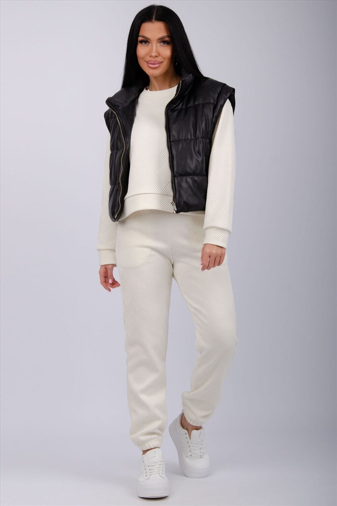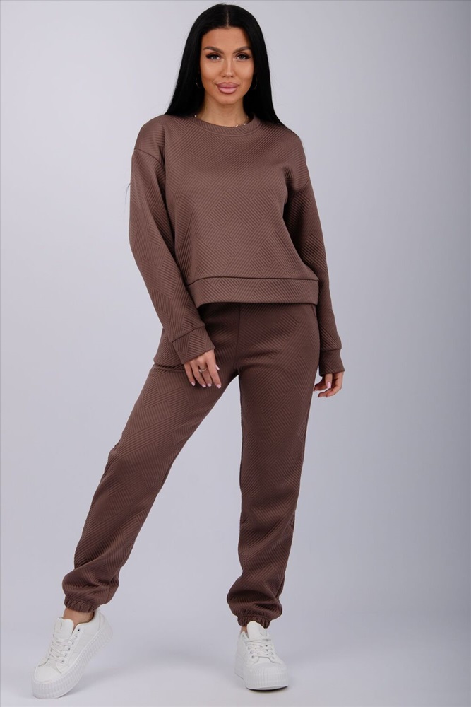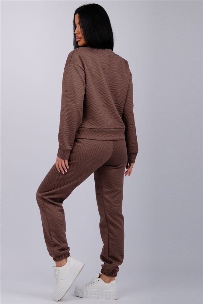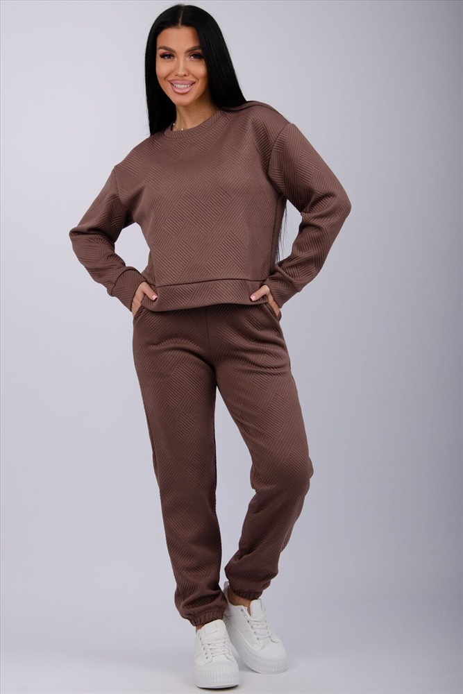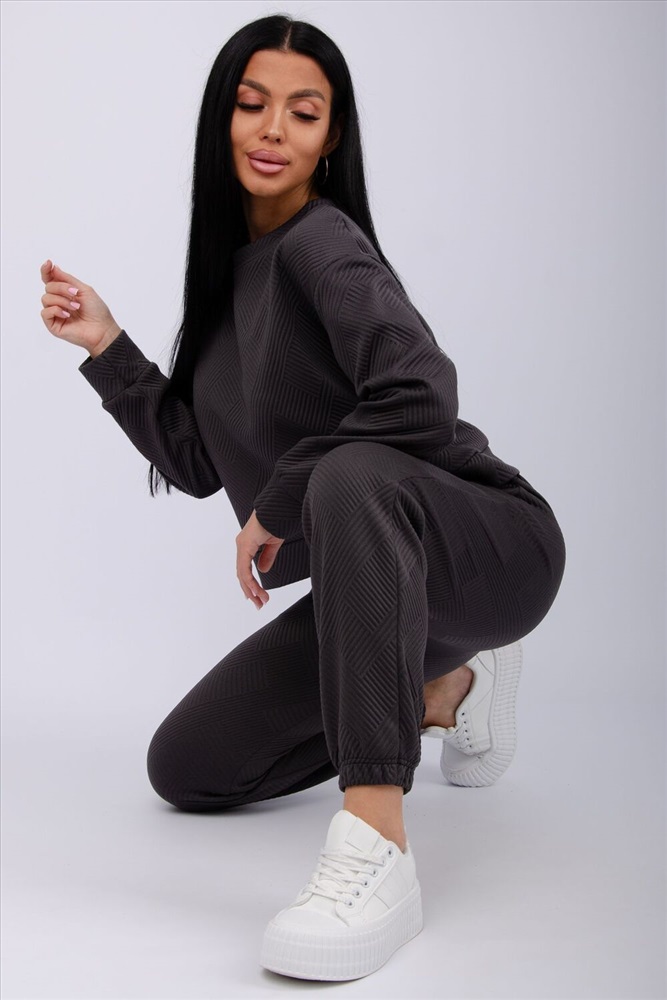 Застежка: без застежки Удобный костюм для повседневной носки и активного отдыха и выхода в свет. Варианты цветов вас приятно удивят: глубокий черный, шоколадный коричневый, серый графит и милый молочный. Верх: джемпер с манжетами на рукавах, низ: прямые брюки на резинке. Приятная фактурная ткань с объёмным геометрическим узором придаст элегантность вашему образу. Костюм легко комбинировать с кроссовками и ботинками. Отличный выбор для осени и зимы.