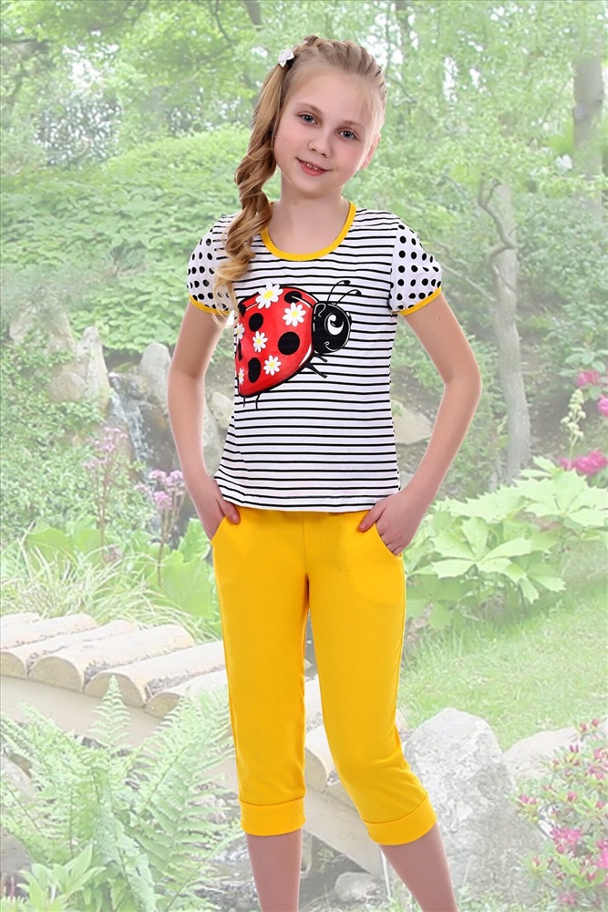 ID товара: 274524 Состав: 100% Хлопок Сезон: Весна/Лето Длина: Средняя Фасон: Повседневный Рукав: Короткий Крой брючин: Зауженный Основная ткань: Хлопок | Кулирка, Кулирка — это самое тонкое и гладкое трикотажное полотно, изготовленное из чистого хлопка. Полотно имеет характерную структуру- с лицевой стороны плоские «косички», с изнаночной – «кирпичная кладка». Особенности- гигроскопична, воздухопроницаема, при стирке, сушке и глажке не садится, хорошо держит форму, не образует складки. Стиль: Повседневный Страна бренда: Россия Страна производства: Россия Костюм из кулирки для девочек футболка + бриджи. Футболка с окантованными горловиной и рукавами, рукава в горох, принт спереди в виде божьей коровки, две расцветки — с полосками и без них. Желтые бриджи с карманами, внизу манжеты, длина чуть ниже коленей. Размеры от 24 до 36. Возможна розница. Комментарии к товару