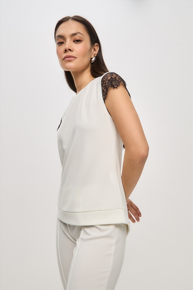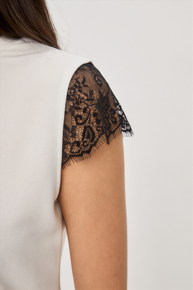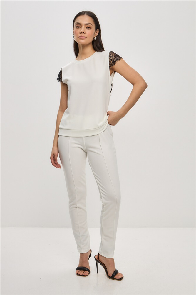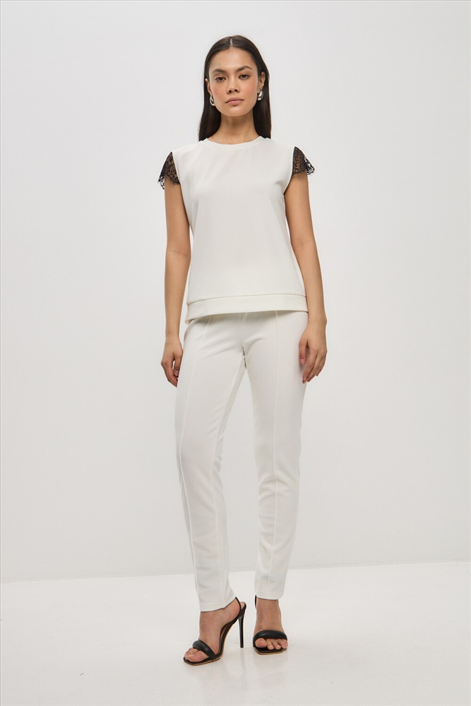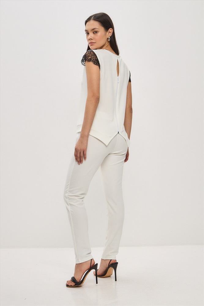 Женский брючный праздничный костюм от российского производителя бренда женской одежды. Основой комплекта являются зауженные классические брюки с резинкой на талии, с элегантными прошитыми стрелками, отлично подчеркивающие фигуру. В комплекте блуза сложного геометрического кроя с удлиненной спинкой на молнии, с вырезом-капелькой, рукавами, выполненными из тонкой кружевной ткани черного цвета. Необычное дизайнерское решение позволило совместить элегантную классику и эффектный стиль. Базовый вариант подойдет для повседневного ношения в офис или на деловую встречу. На любом мероприятии Вы будете чувствовать себя нарядно и комфортно.