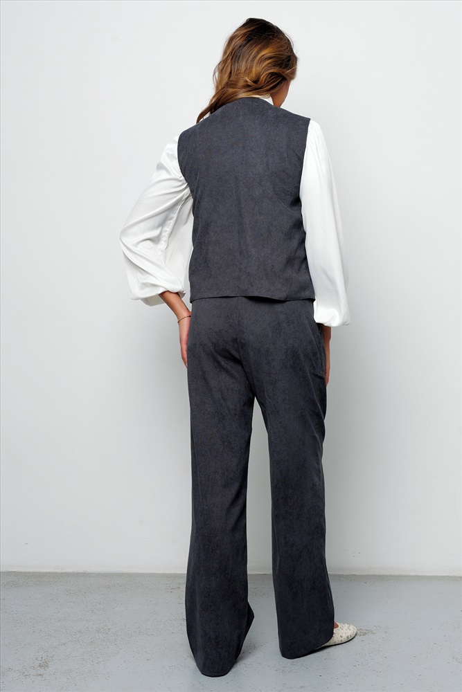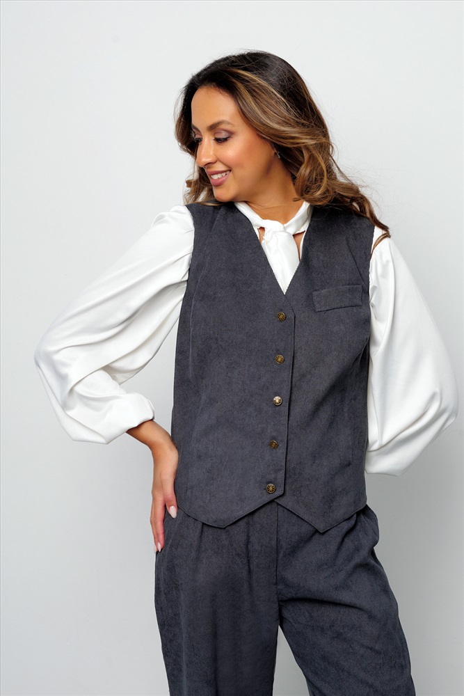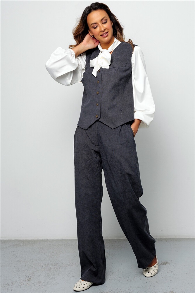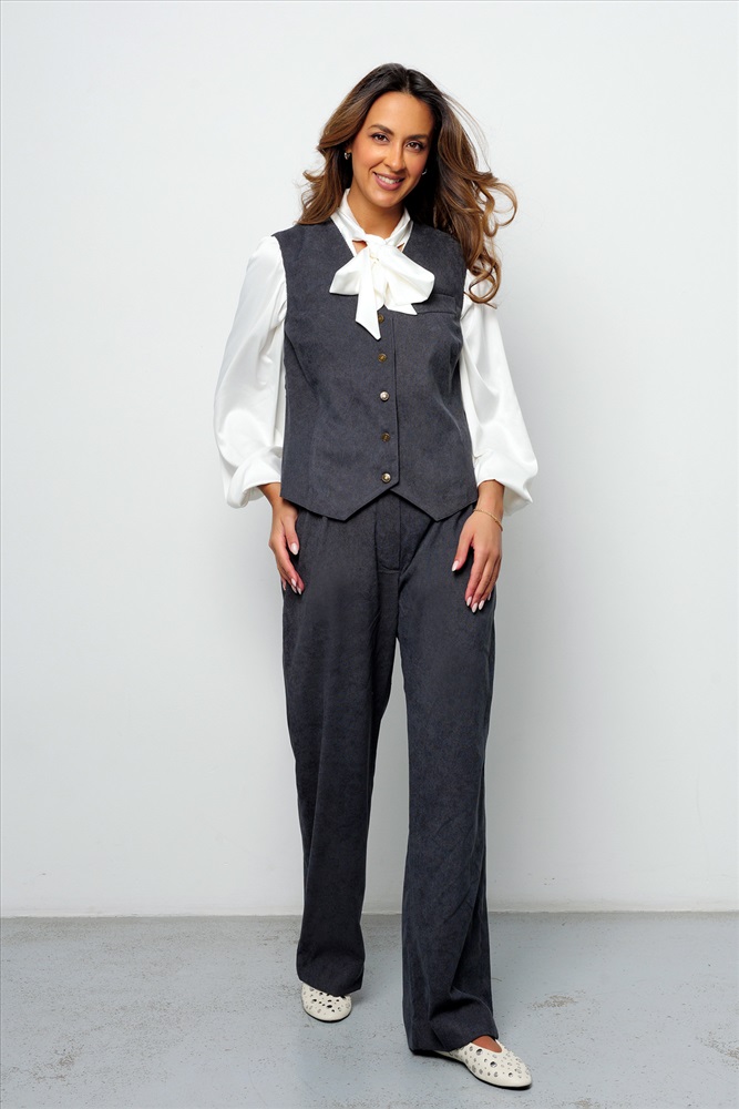 Состав: 98% п/э; 2% лайкра Модель: Костюм брючный вельветовый с жилеткой 399GRY Тип товара: костюм с брюками Материал: вельвет | вельвет Бренд: Рапоза Карман: боковые | прорезные Отделка: с карманами Посадка: высокая посадка Рисунок: однотонные Рукав: без рукава Сезонность: лето | осень | весна | зима Силуэт: свободный Стиль: офисный | повседневный Воротник: без воротника Застежка: молния | пуговицы Костюм женский брючный с жилеткой от Raposa стильное и комфортное решение для современных женщин 2025, ценящих элегантность и практичность. Это идеальное сочетание классики и тренда. Благородство однотонного дизайна дополняется удобством. Летний и весенний базовый костюм из дышащего и не мнущегося вельвета станет лучшим выбором для вечерних мероприятий, деловых встреч или просто для отдыха на море. Серый костюм женский в классическом стиле с широкими штанами и однобортным жилетом подчеркивает его универсальность, позволяя комбинировать его с различными аксессуарами. Брюки палаццо, трубы, с прорезными карманами добавляют образу женственности и комфорта, а жилетка с застежкой на клепки придает ему особый шарм. Эргономичная резинка на талии сзади у широких штанишек мягко прилегает без сдавливания, а передняя планка пояса имеет корректирующий эффект, способствуя идеальной посадке. Костюм двойка из вельвета обеспечивает комфорт в теплую и прохладную погоду, а его фактура в рубчик и клетчатый подклад шикарны. Велюровая ткань не мнется и сохраняет форму после стирки. Модель костюма премиум качества в стиле олд мани с небольшим оверсайз кроем прекрасно подойдет для женщин больших размеров плюс сайз до 58 и 60, подчеркивая достоинства фигуры и позволяя выглядеть шикарно и безупречно. Этот нарядный костюм с шароварами станет незаменимым элементом вашего гардероба, будь то рабочая встреча в офисе, вечернее свидание или летний отдых. Брючный костюм женский праздничный идеальный вариант на выпускной или на свадьбу, для подружек невесты. С блузой или водолазкой костюм с брюками палаццо вписывается в рамки делового дресс кода и применим как школьная форма для девочки подростка, девушки. Бархатный костюм прекрасно подходит для учебы в колледже или университете, для прогулок. Строгий комплект двойка с безрукавкой с глубоким V образным вырезом и брюками с защипами поможет создать образ красивой и уверенной в себе женщины. Ткань: велюр. Состав: 98% п/э + 2% лайкра Таблица размеров и весаБрюки