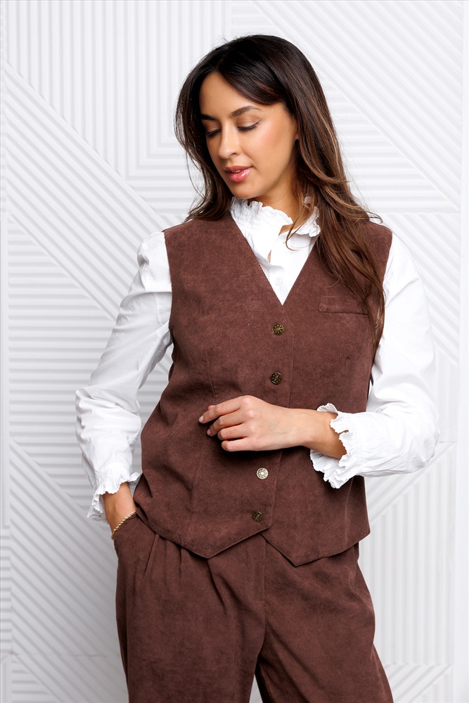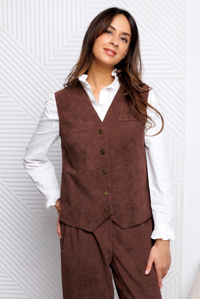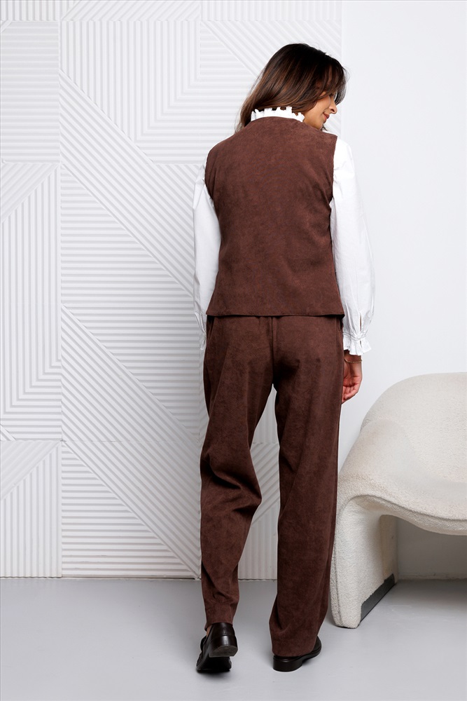 Состав: 98% п/э + 2% лайкра Модель: Костюм брючный вельветовый с жилеткой 399MOC Тип товара: костюм с брюками Материал: вельвет | вельвет Бренд: Рапоза Карман: боковые | прорезные Особенности: на резинке Отделка: с карманами Посадка: высокая посадка Рисунок: однотонные Рукав: без рукава Сезонность: лето | осень | весна | зима Силуэт: свободный Воротник: без воротника Застежка: пуговицы Костюм женский брючный с жилеткой от Raposa стильное и комфортное решение для современных женщин 2026, ценящих элегантность и практичность. Это идеальное сочетание классики и тренда. Благородство однотонного дизайна дополняется удобством. Летний и весенний базовый костюм из дышащего и немнущегося вельвета станет лучшим выбором для вечерних мероприятий, деловых встреч или просто для отдыха на море. Коричневый костюм женский в классическом стиле с широкими штанами и однобортным жилетом подчеркивает его универсальность, позволяя комбинировать его с различными аксессуарами. Брюки палаццо, трубы, с прорезными карманами добавляют образу женственности и комфорта, а жилетка с застежкой на клепки придает ему особый шарм. Эргономичная резинка на талии сзади у широких штанишек мягко прилегает без сдавливания, а передняя планка пояса имеет корректирующий эффект, способствуя идеальной посадке. Костюм двойка из вельвета обеспечивает комфорт в теплую и прохладную погоду, а его фактура в рубчик и клетчатый подклад шикарны. Велюровая ткань не мнется и сохраняет форму после стирки. Модель теплый костюм женский премиум качества в стиле олд мани с небольшим оверсайз кроем прекрасно подойдет для женщин больших размеров плюс сайз до 58 и 60, подчеркивая достоинства фигуры и позволяя выглядеть шикарно и безупречно. Этот нарядный костюм с шароварами станет незаменимым элементом вашего гардероба, будь то рабочая встреча в офисе, вечернее свидание или летний отдых. Брючный костюм женский праздничный идеальный вариант на выпускной или на свадьбу, для подружек невесты. Костюм с брюками палаццо вписывается в рамки делового дресс кода и применим как школьная форма для девочки подростка, девушки. Бархатный костюм прекрасно подходит для учебы в колледже или университете, для прогулок. Строгий комплект двойка с безрукавкой с глубоким V образным вырезом и брюками с защипами поможет создать образ красивой и уверенной в себе женщины. Ткань: вельвет. Состав: 98% п/э + 2% лайкра Таблица размеров и весаЖилет