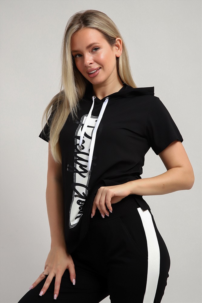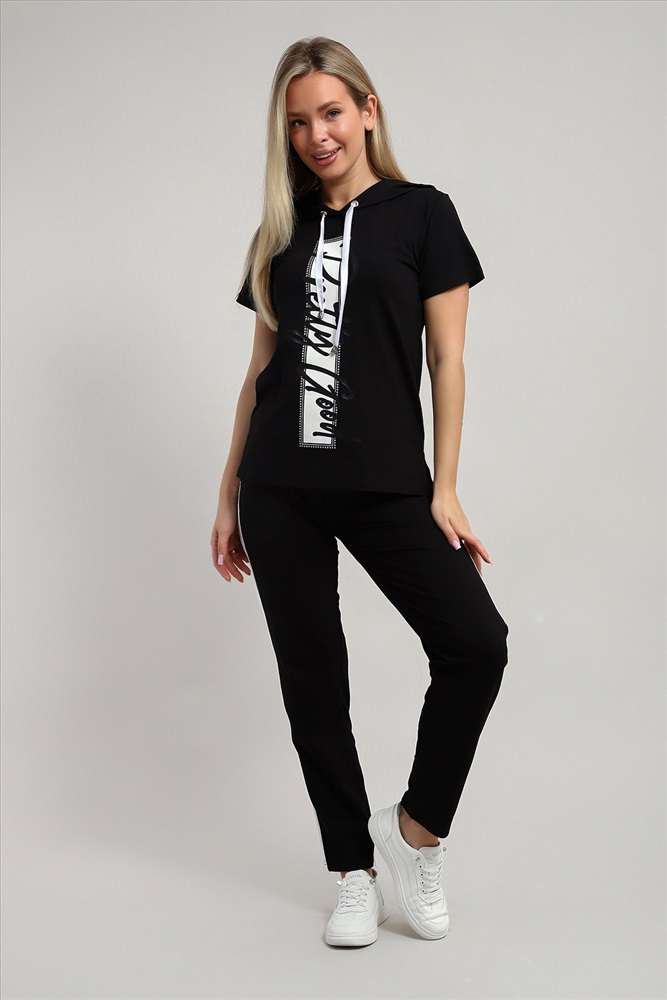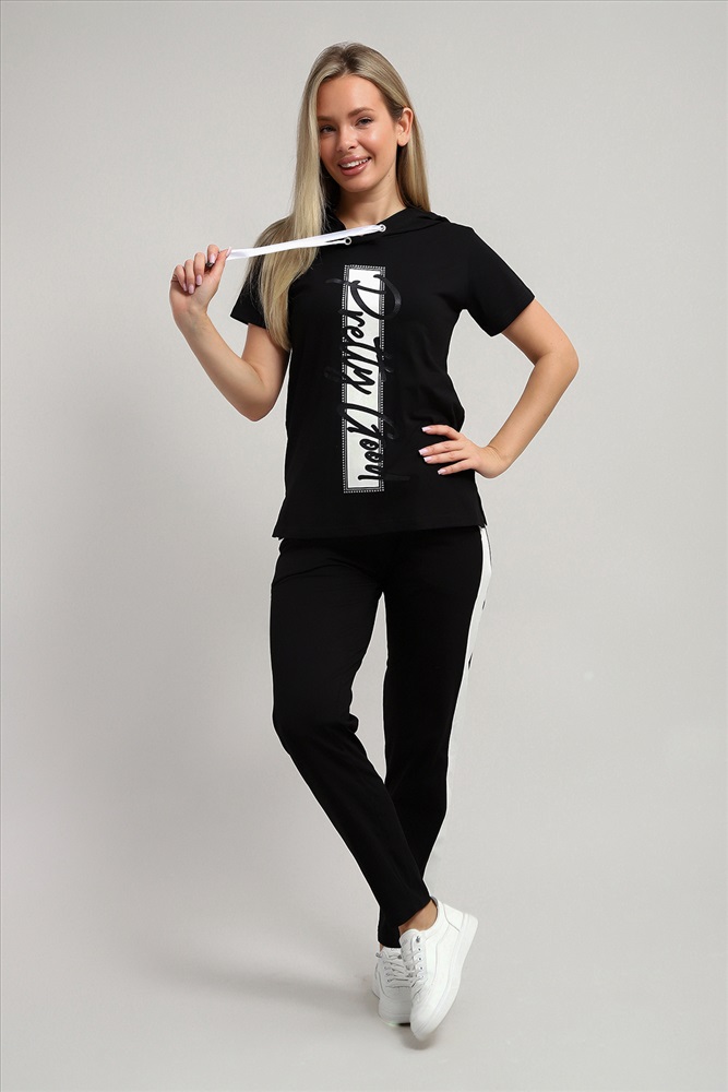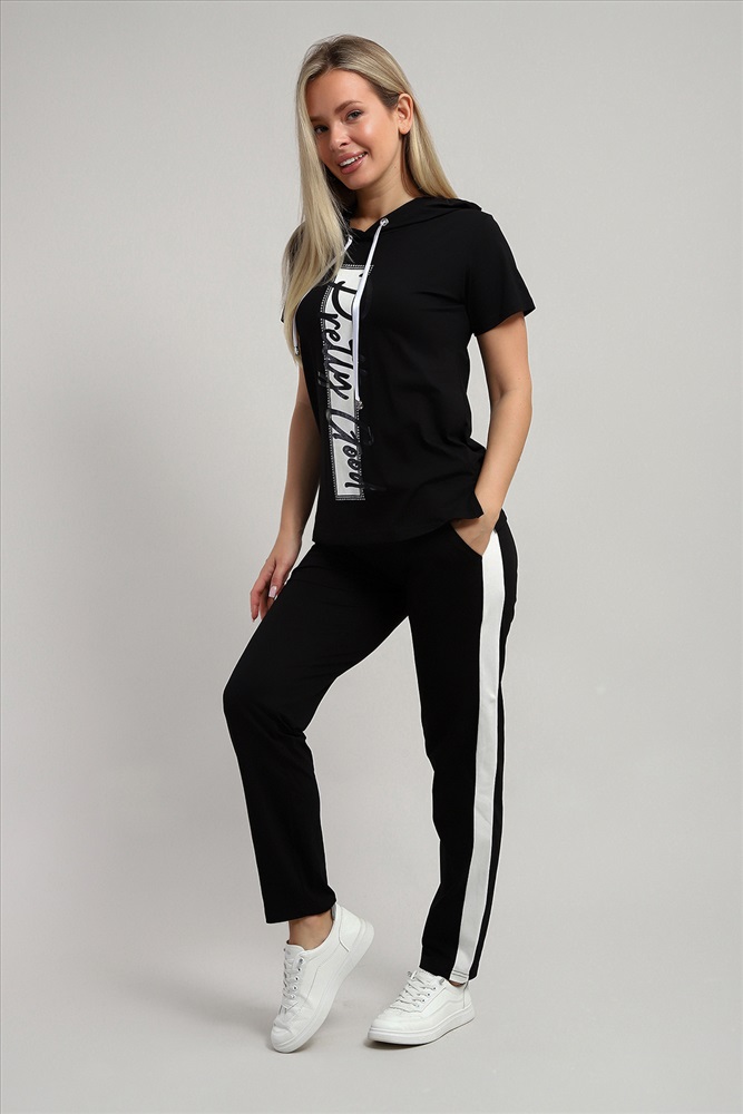 Воротник: с капюшоном Стильный женский костюм из легкой дышащей ткани. Сшит из мягкого трикотажного полотна высокого качества. Основной изюминкой костюма является яркий принт на полочке кофты, расположенный вертикально и контрастирующий с общим фоном. Кроме того, на кофте имеется капюшон, объем которого регулируется тонкой лентой. Этот универсальный и практичный повседневный костюм в спортивном стиле будет удобным и комфортным во многих ситуациях. Комплект отлично подойдет для спорта, бега или танцев. Брюки свободные с яркими лампасами, двумя боковыми карманами, на широком поясе с резинкой. Каждую вещь вполне можно использовать по отдельности. Комплект отлично подойдет для женщин любого возраста и поможет хозяйке выглядеть стильно, при этом даря чувство комфорта!