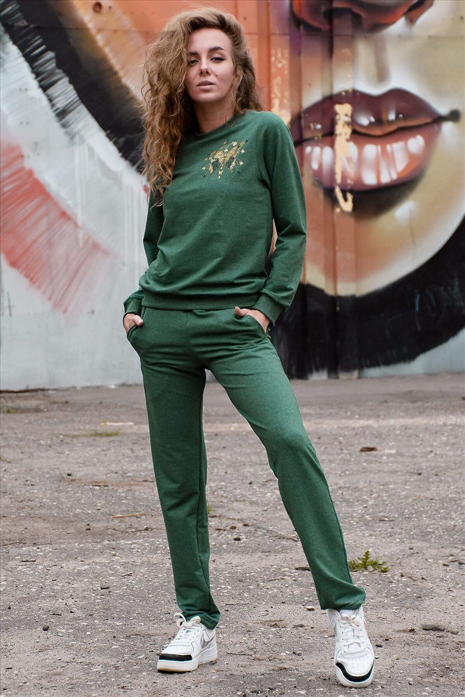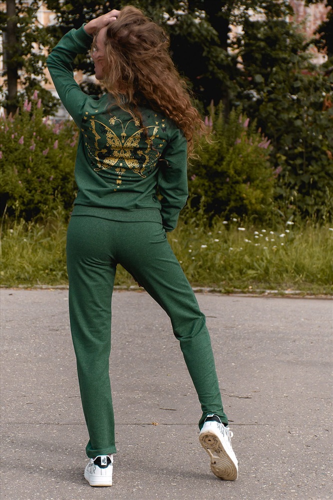 ID товара: 278818 Состав: Хлопок 72%, Полиэстер 20%, Лайкра 8% Сезон: Весна/Лето Длина: Полная Фасон: Полуприлегающий Рукав: Длинный Вид застежки: Нет Крой брючин: Зауженный Рисунок: бабочки Тип карманов: Втачные Основная ткань: Хлопок | Футер с лайкрой 2-х нитка, Футер с лайкрой двухнитка — это футерная ткань с добавлением двух дополнительных нитей, в состав которой входит лайкра для улучшения свойств ткани. Особенности- эластичность, мягкость, гигроскопичность, легкость в уходе, комфорт при носке. Стиль: Спортивный Страна бренда: Россия Страна производства: Россия Современный молодёжный костюм, состоящий из свитшота и брюк, зауженных к низу. Брюки на кокетке с боковыми внутренними карманами. Манжеты, горловина, пояс на свитшоте изготовлены из качественной ткани-кашкорсе, которая не растягивается после стирки. Тёмный цвет костюма визуально стройнит. Комментарии к товару