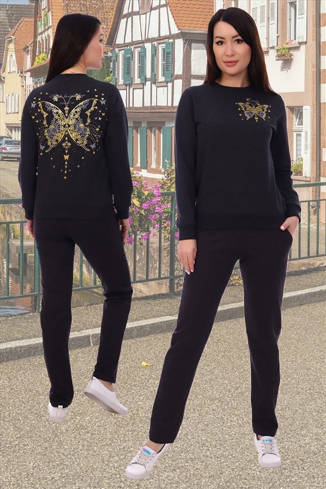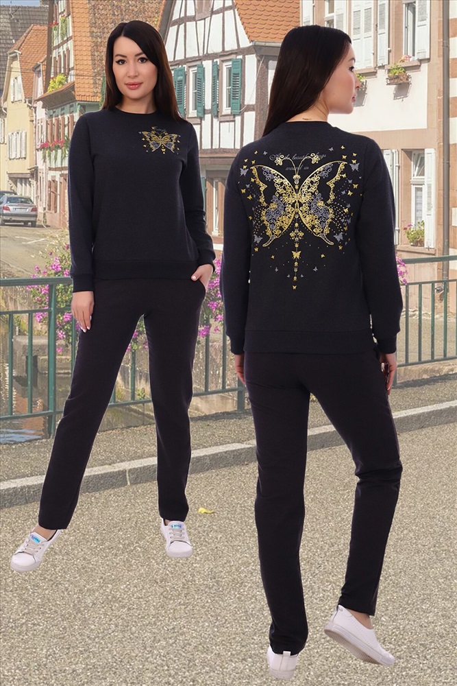 ID товара: 278819 Состав: Хлопок 72%, Полиэстер 20%, Лайкра 8% Сезон: Весна/Лето Длина: Полная Фасон: Полуприлегающий Рукав: Длинный Рисунок: бабочки Тип карманов: Втачные Основная ткань: Хлопок Стиль: Спортивный Страна бренда: Россия Страна производства: Россия Современный молодёжный костюм, состоящий из свитшота и брюк, зауженных к низу. Брюки на кокетке с боковыми внутренними карманами. Манжеты, горловина, пояс на свитшоте изготовлены из качественной ткани-кашкорсе, которая не растягивается после стирки. Тёмный цвет костюма визуально стройнит. Комментарии к товару