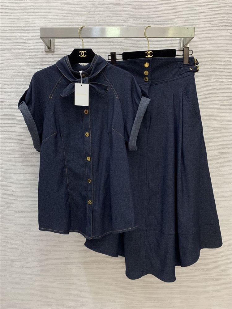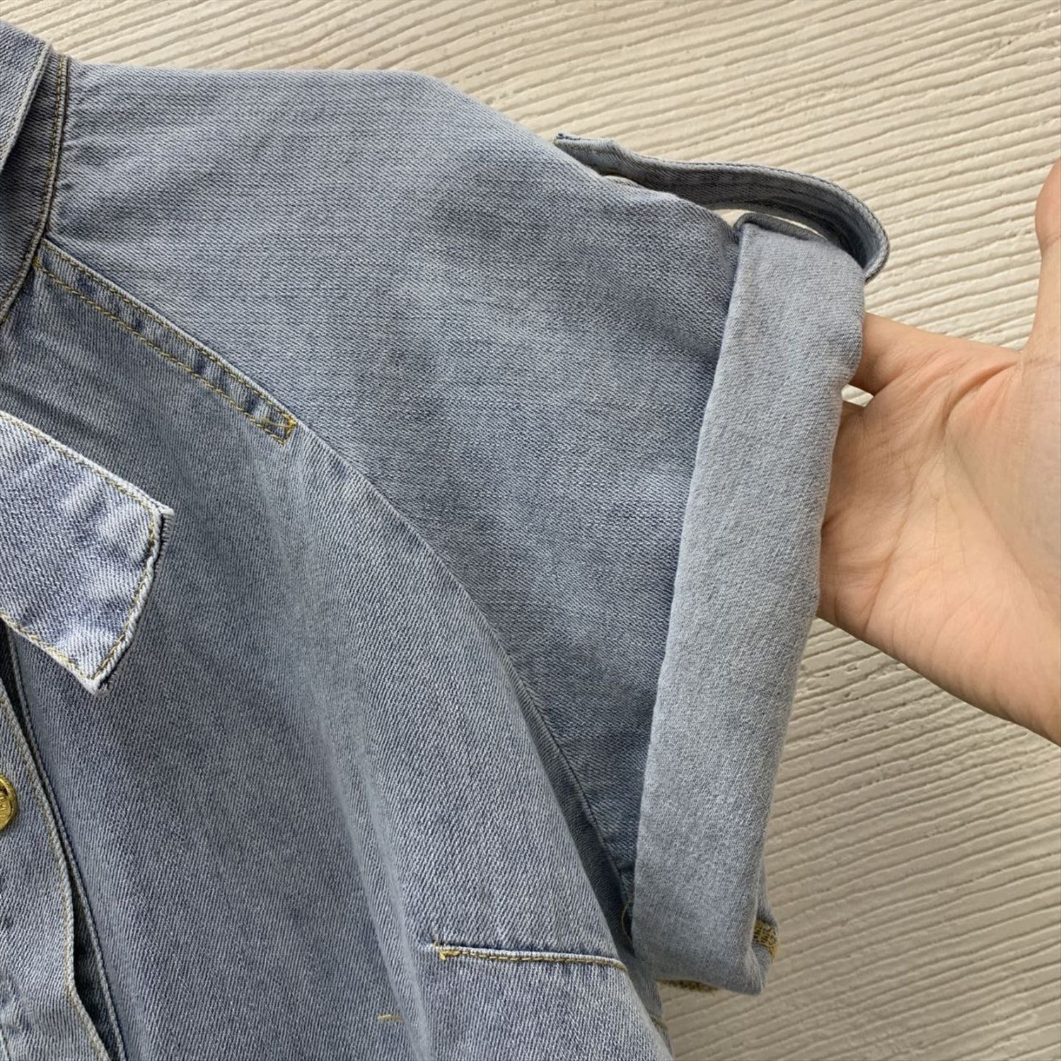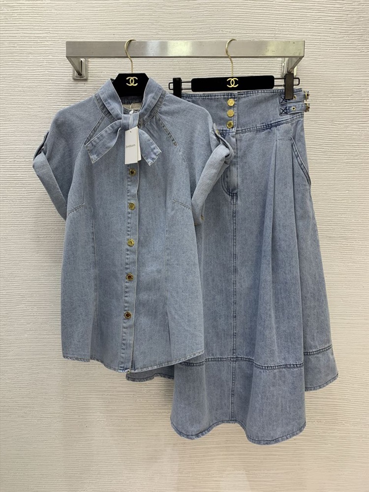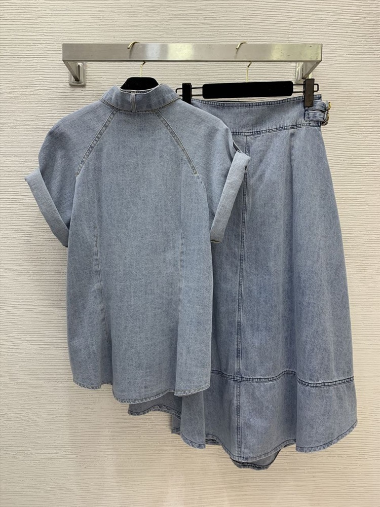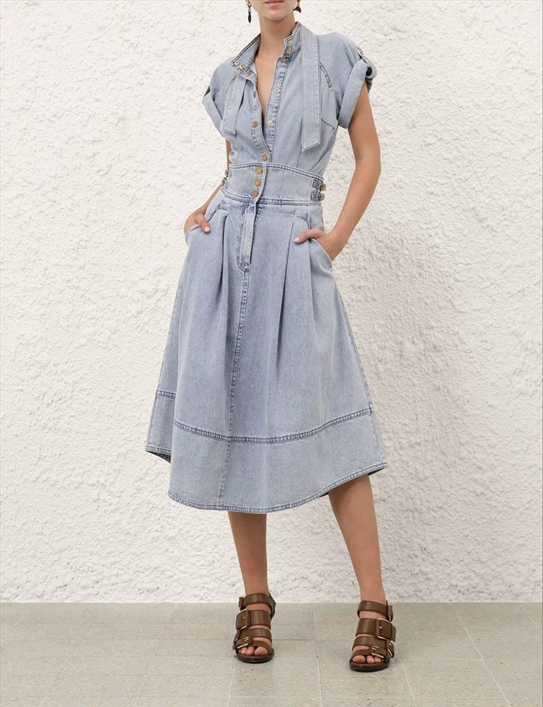 Джинсовый топ с коротким рукавом и небольшим воротником-стойкой на пуговицах; необычная планка на пуговицах с широкой талией; тонкая джинсовая юбка с высокой талией.