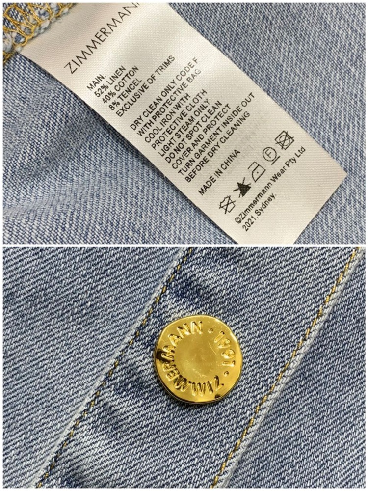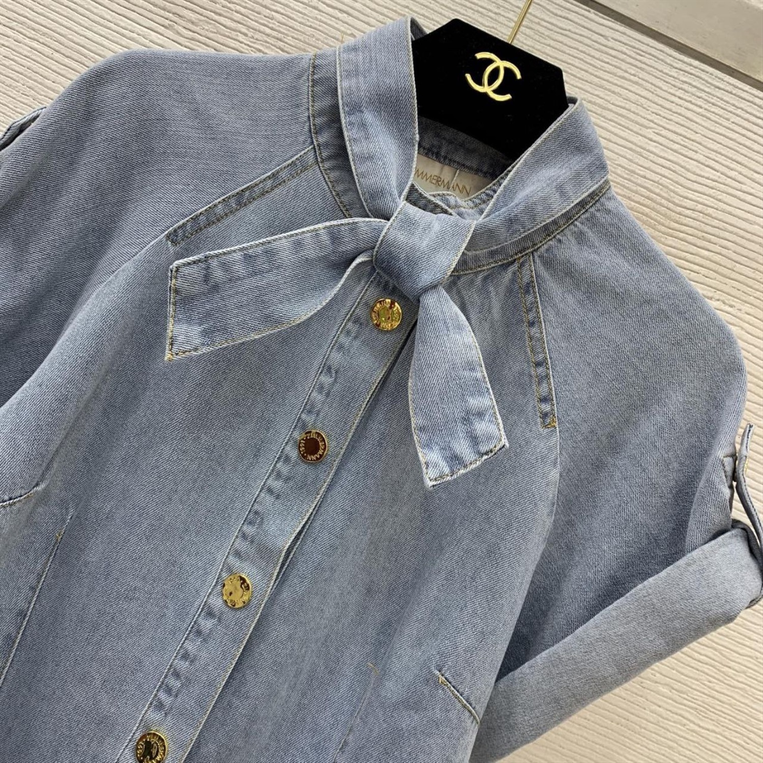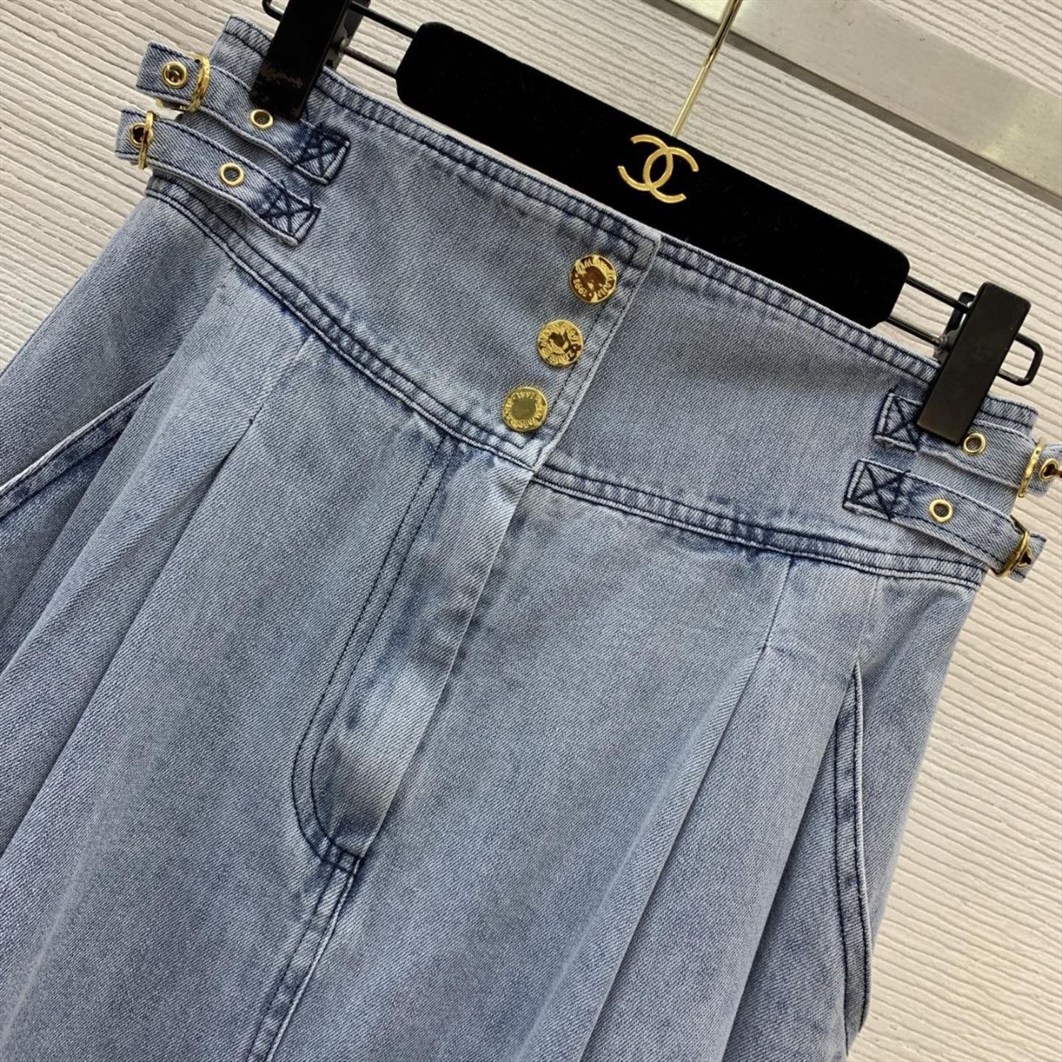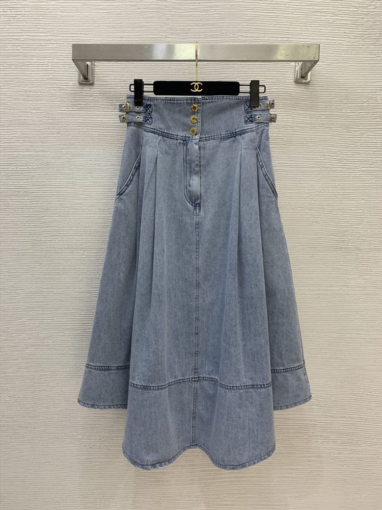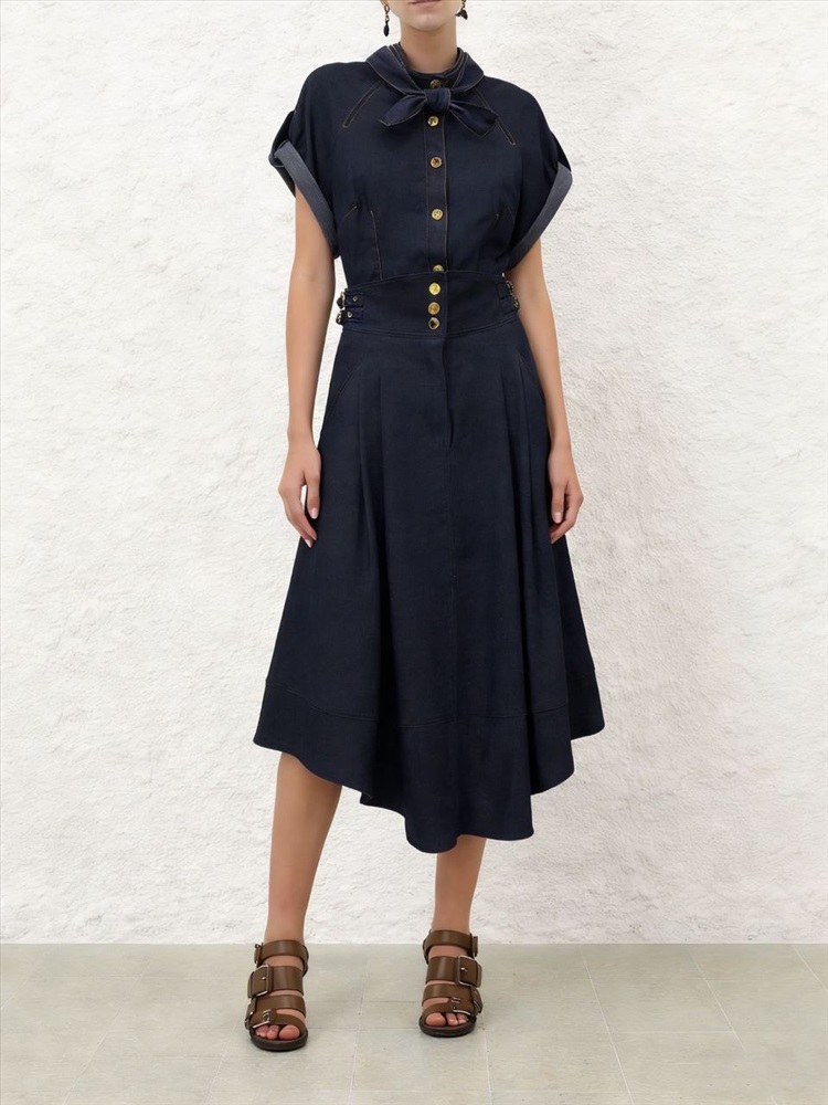 Джинсовый топ с коротким рукавом и небольшим воротником-стойкой на пуговицах; необычная планка на пуговицах с широкой талией; тонкая джинсовая юбка с высокой талией.