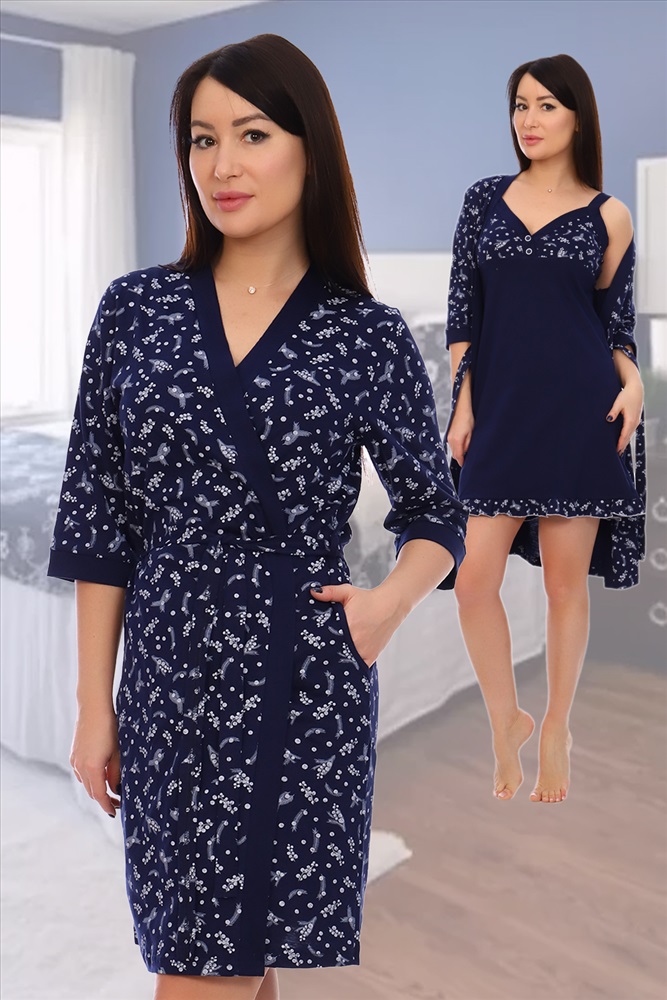 Состав: 100% хлопок Модель: Костюм Элуна Тип товара: пеньюар с сорочкой Материал: кулирка | кулирка Бренд: Натали Суслова Длина: короткий Карман: боковые Назначение: для дома НДС: 5% Отделка: с карманами | с поясом | с волнистым краем Рисунок: разное Рукав: рукав 3/4 Сезонность: лето | осень | весна | зима Силуэт: полуприлегающий Стиль: домашний Застежка: на запах | пояс Костюм состоит из сорочки и халата. Халат на запах с карманами по бокам. Сорочка на широких бретелях с кокетливыми рюшами по низу изделия. Таблица размеров и весахалат