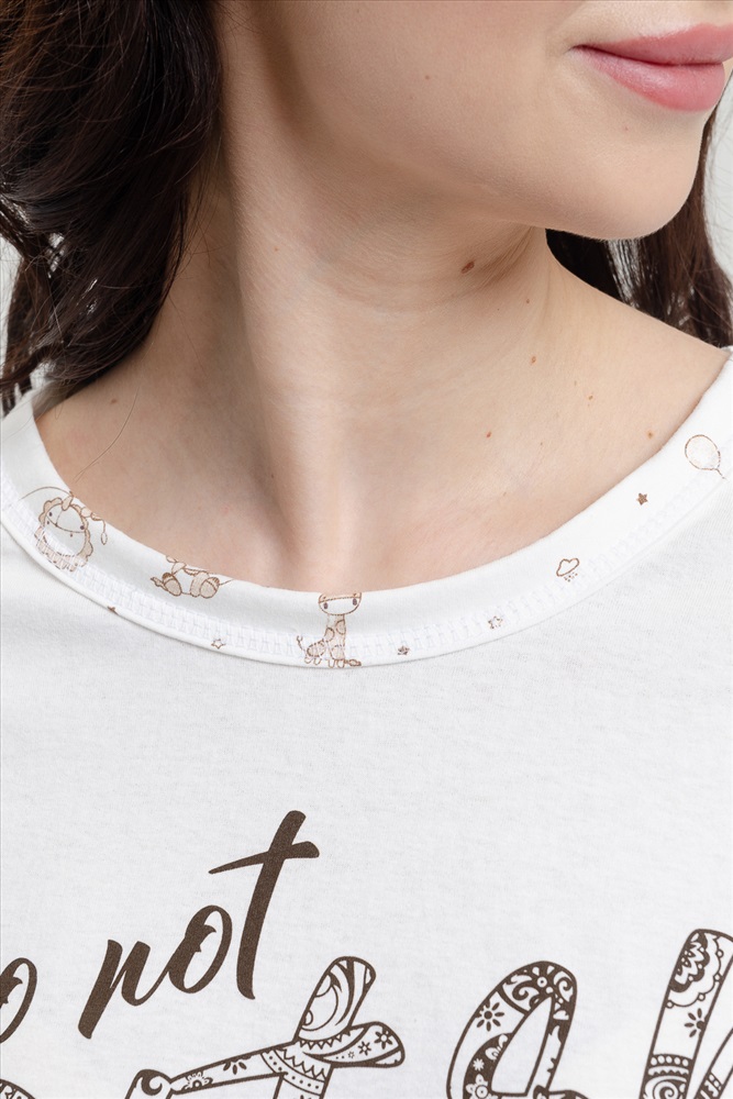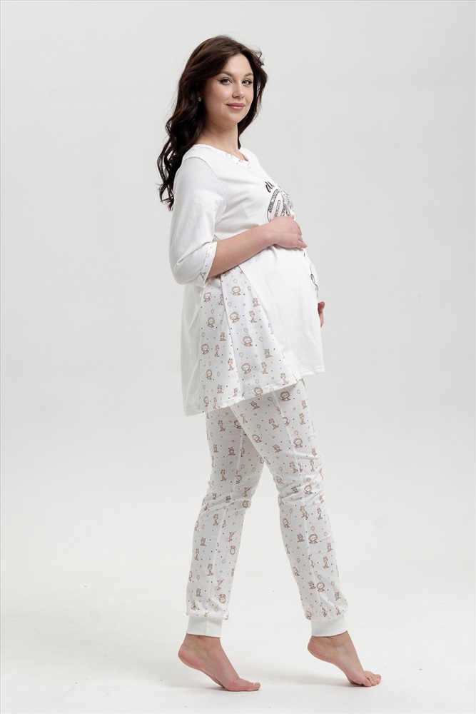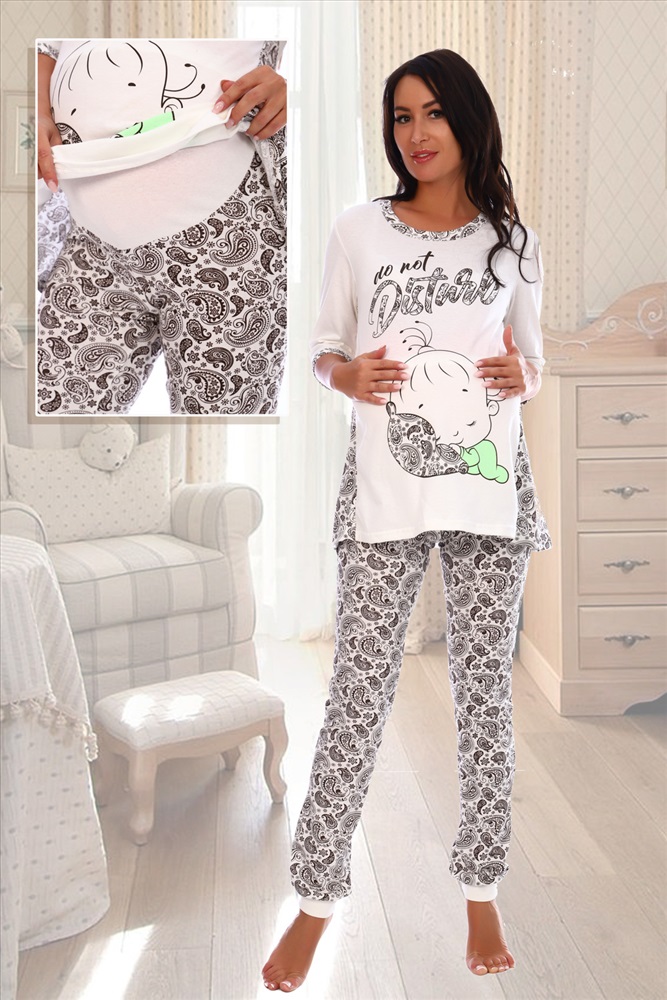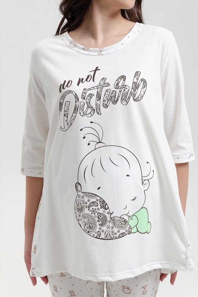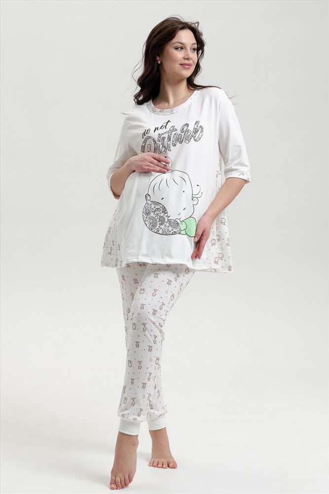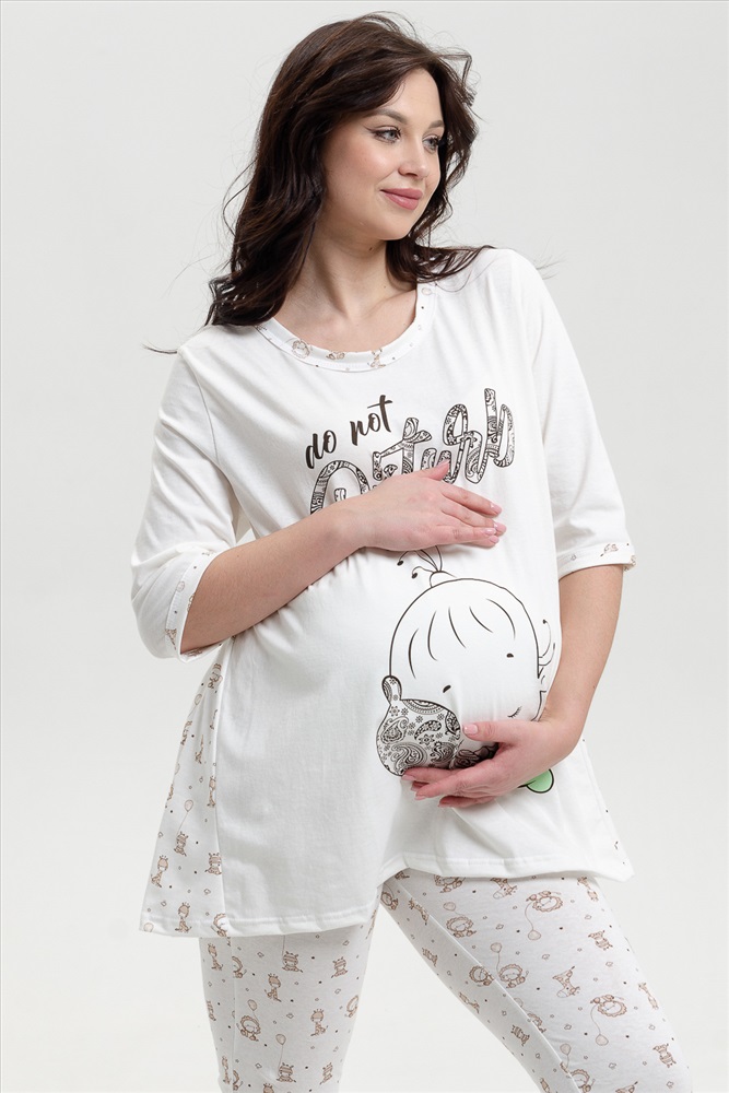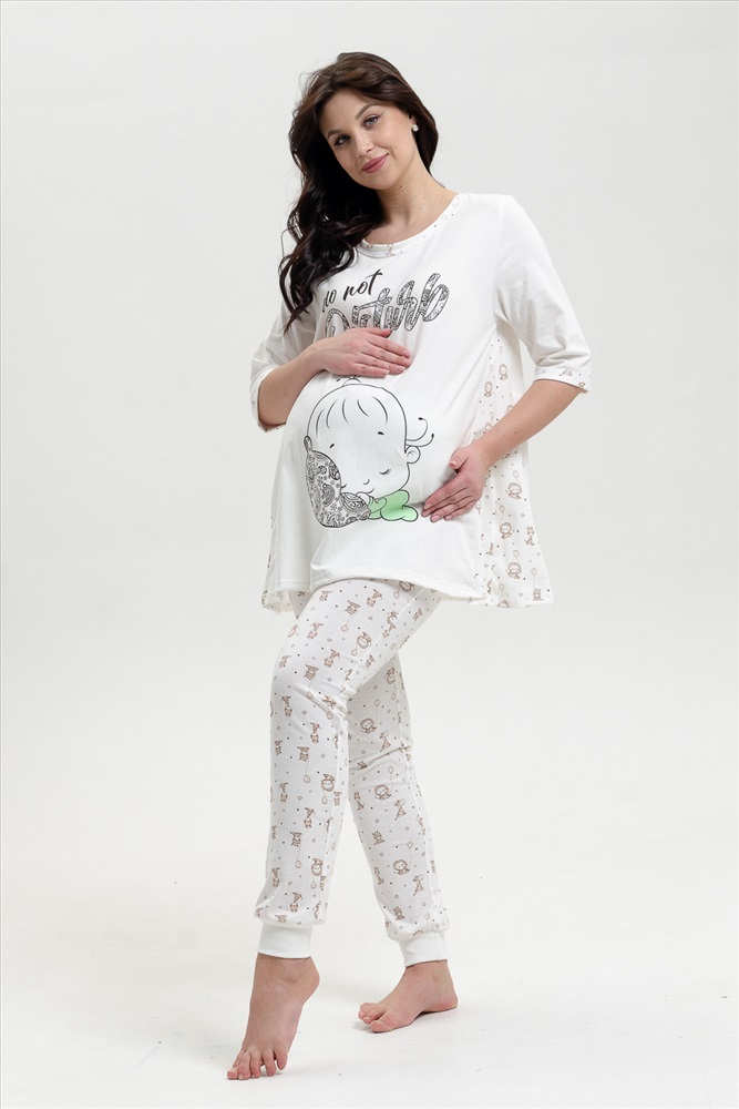 Застежка: без застежки Пижама для беременных. Футболка с коротким рукавом, отделка - кант, принт на полочке. Брюки на манжетах, рисунок - огурцы