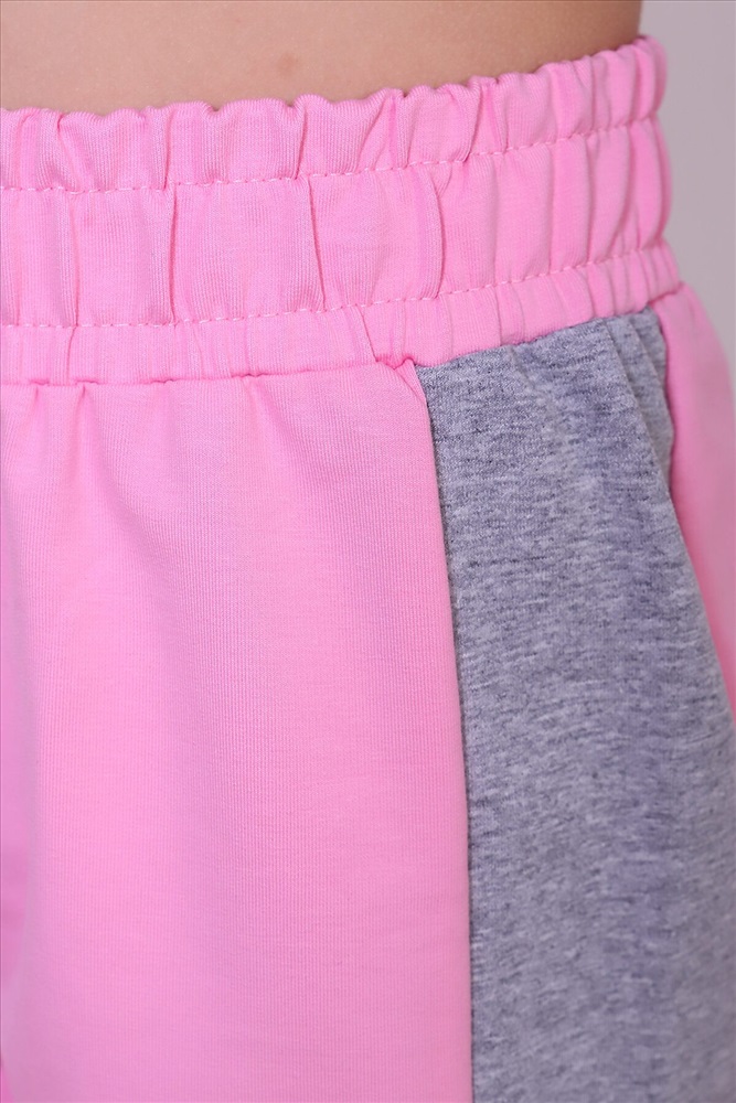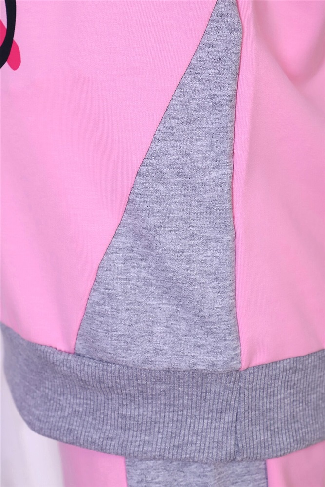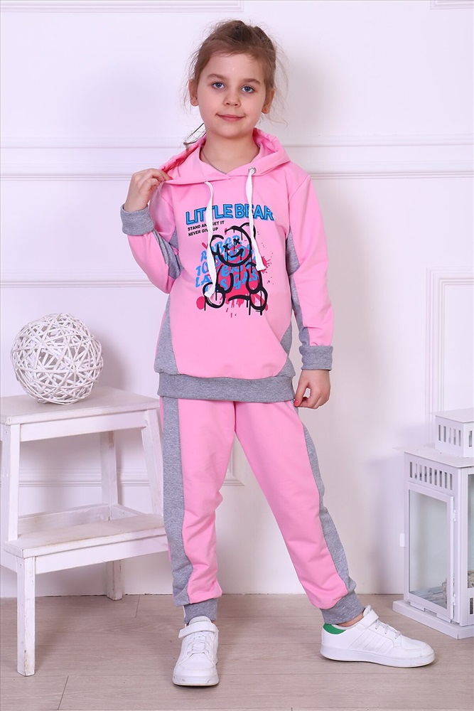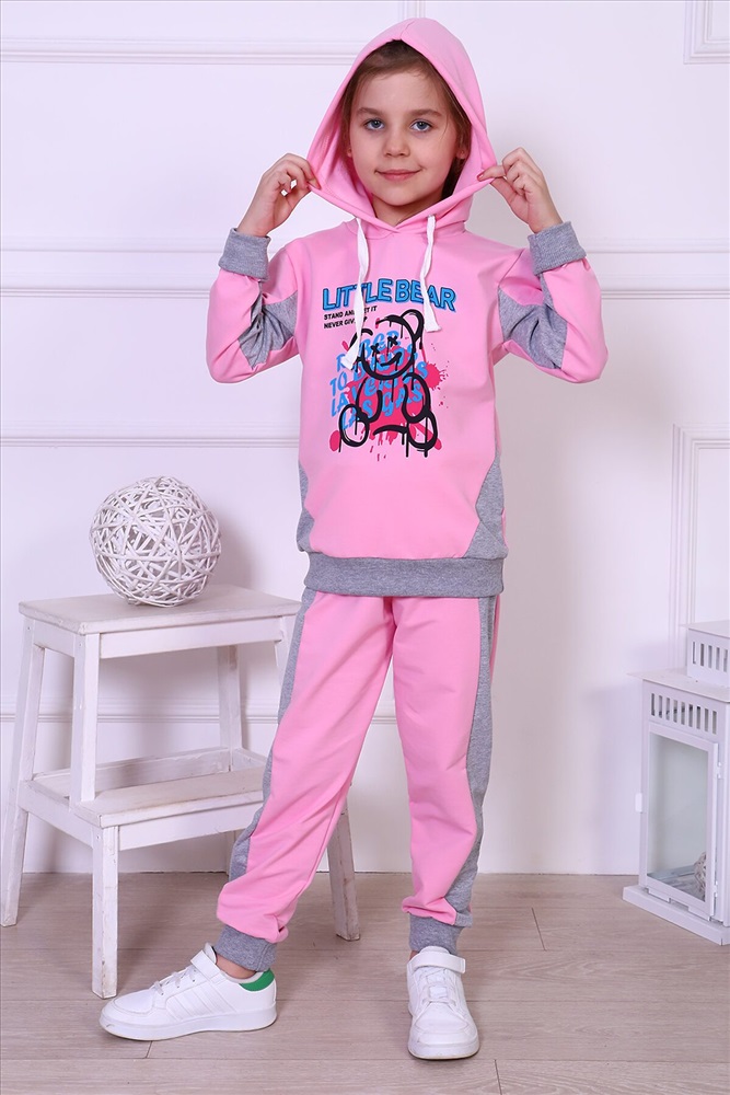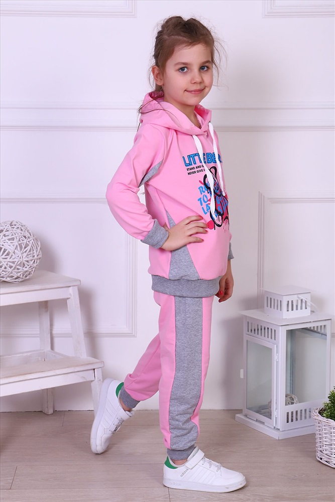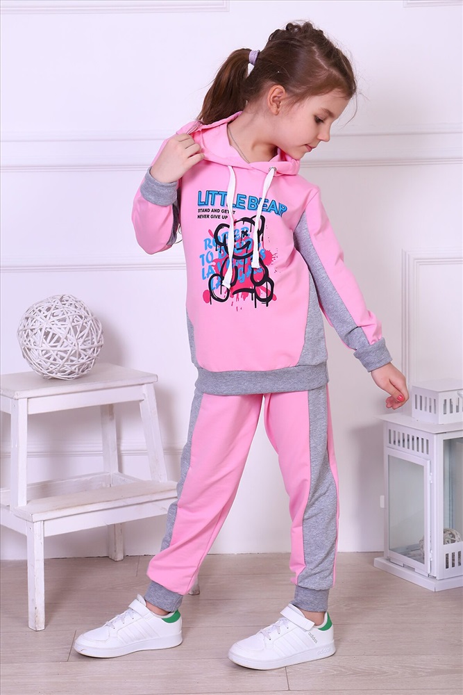 Костюм состоит из брюк с лампасами, низ обработан кашкорсе. Толстовка с печатью на полочке, с капюшоном, рукава и низ обработаны кашкорсе. На рукавах и полочке имеются вставки.