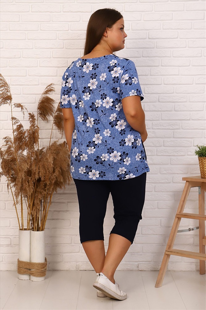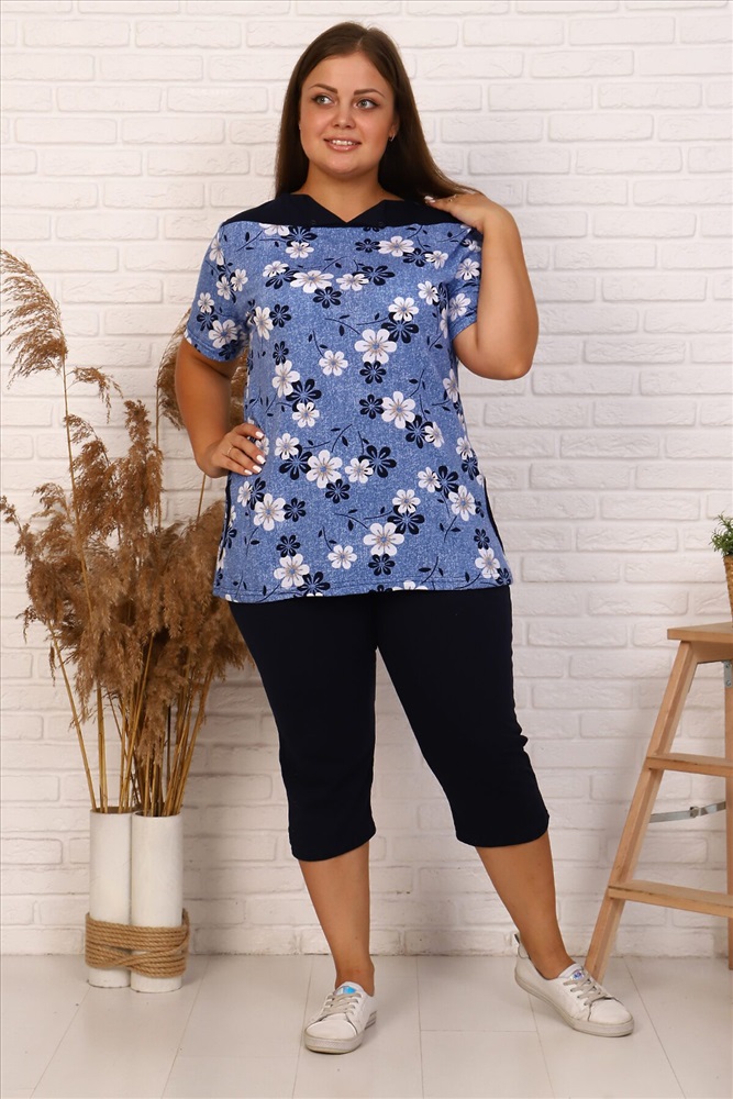 ID товара: 881687 Состав: 100% Хлопок Сезон: Демисезон Длина: Средняя Фасон: Полуприлегающий Рукав: короткие Крой брючин: Облегающий Рисунок: цветочный Декоративные элементы: Принт Основная ткань: Кулирка Стиль: повседневный Страна бренда: Россия Страна производства: Россия Костюм с бриджами, свободного кроя, рукав короткий. Комментарии к товару
