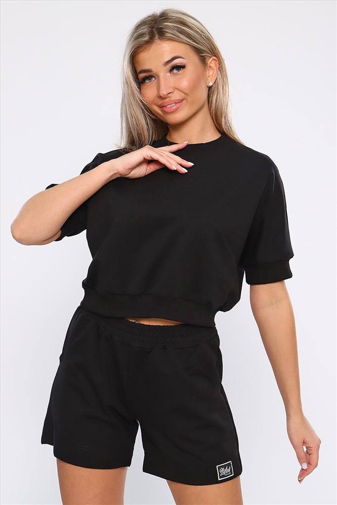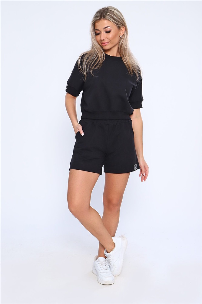 Костюм молодежный из футера 2-х нитки. Костюм с шортами и укороченной кофты. Кофта со спущенным рукавом, рукава и пояс на кашкорсе на одном из рукавов эмблема, шорты с карманами, пояс сделан поясной машиной, на подгибе тоже эмблема. На модели размер 46-48.