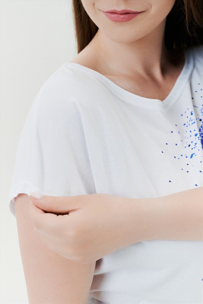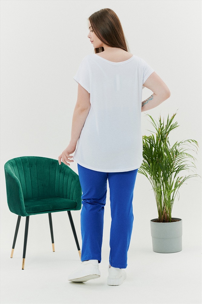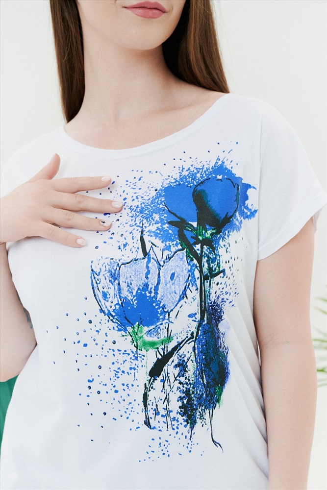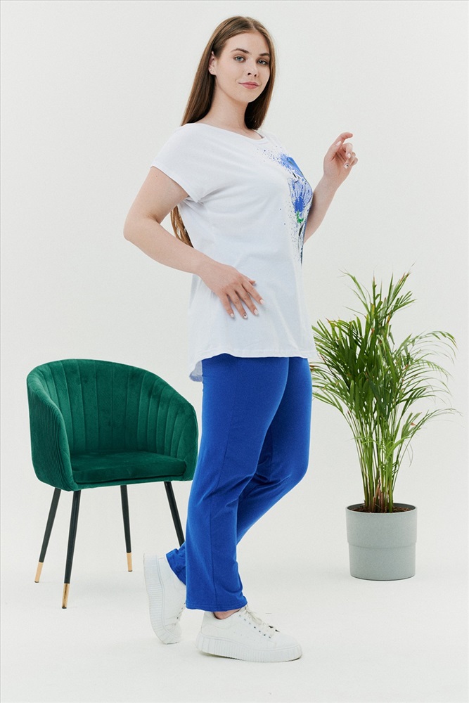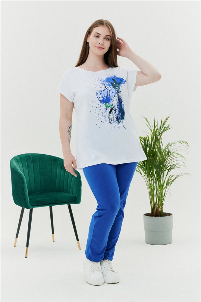 Застежка: без застежки Костюм футболка из кулирки + брюки из кулирки с лайкрой. Принт в виде цветка из брызг и потеков краски на белом фоне. Брюки однотонные, с карманами по бокам
