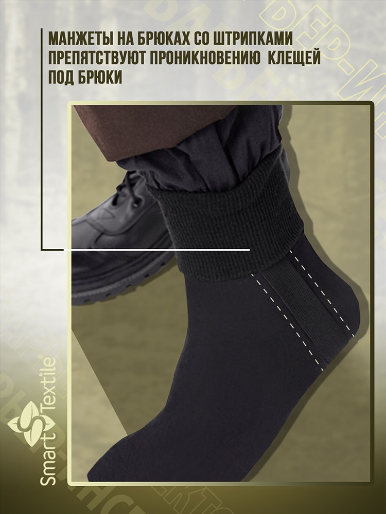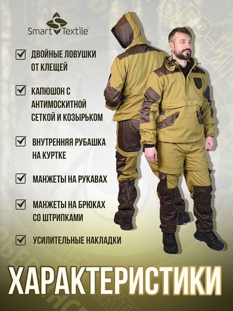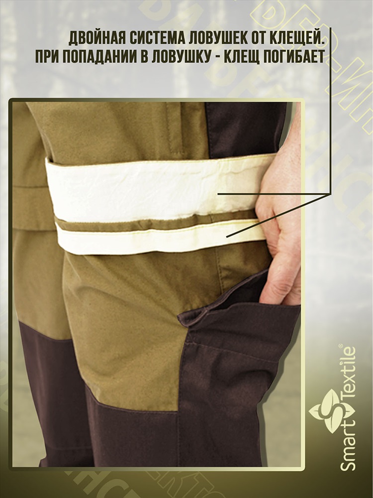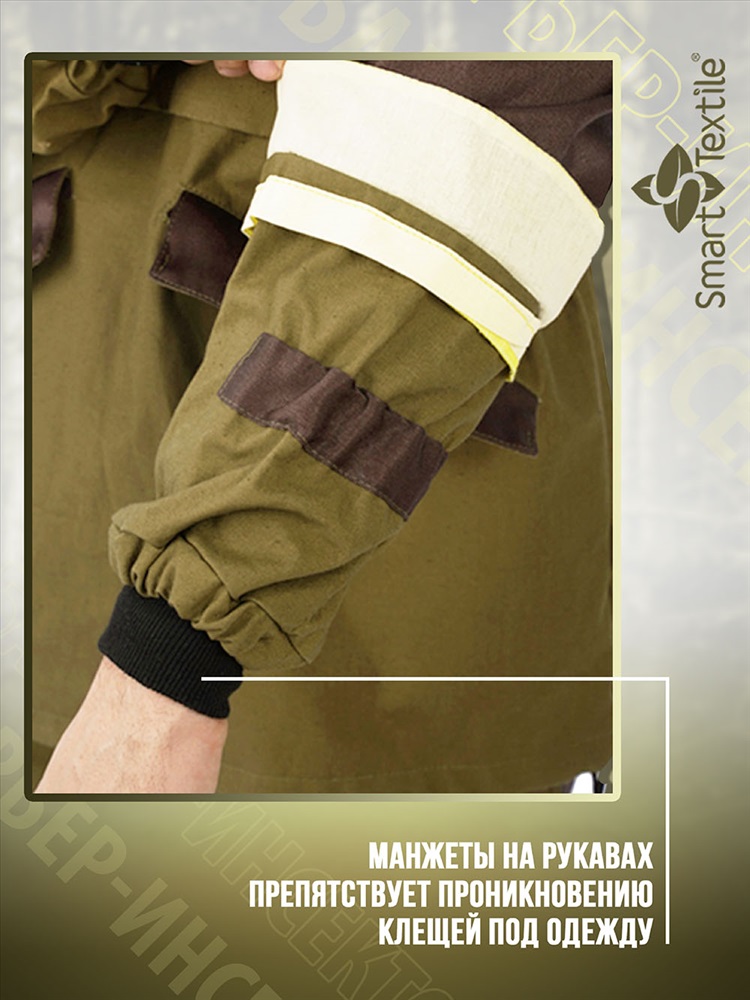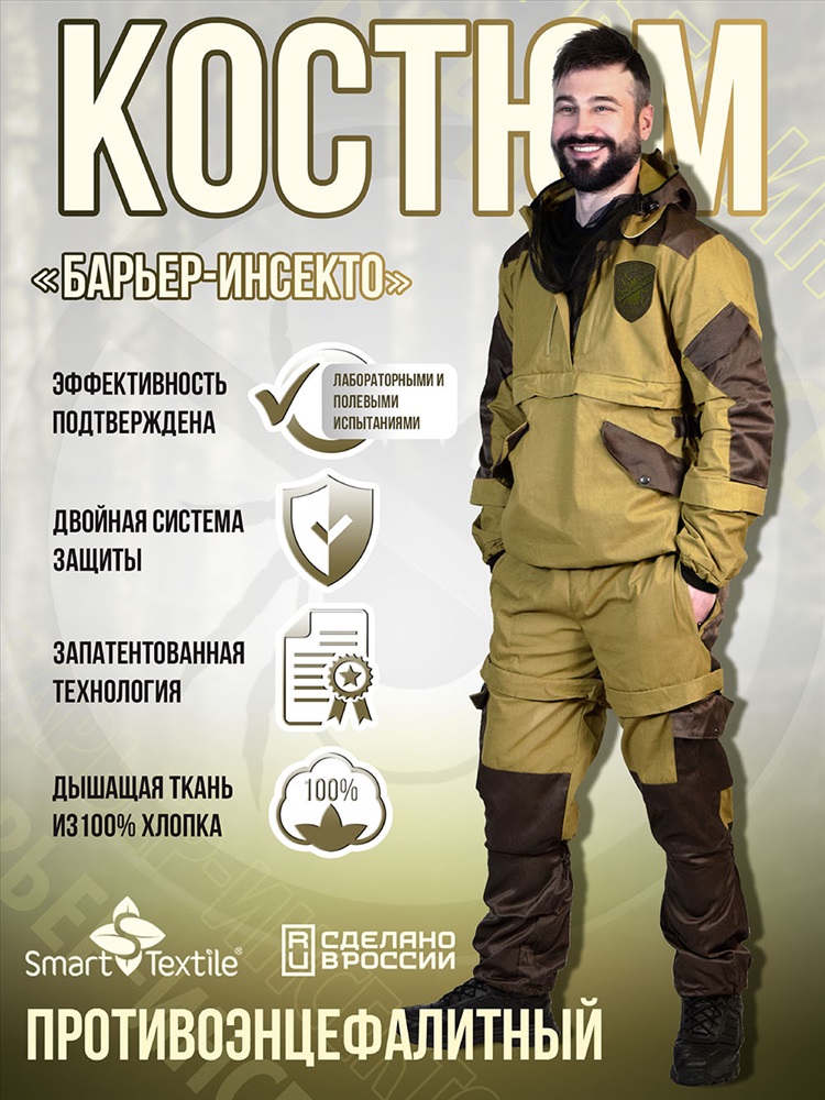 Состав: 100% хлопок Модель: Костюм противоэнцефалитный антимоскитный Барьер - Инсекто У Тип товара: костюм с брюками Материал: палаточное полотно | палаточное полотно Бренд: Smart Textile Карман: боковые | накладные | прорезные НДС: 22% Особенности: на резинке | противоэнцефалитный Отделка: с карманами | с сеткой Рисунок: колорблок Рукав: длинный рукав Сезонность: лето | осень | весна Силуэт: прямой | свободный Стиль: милитари | спецодежда | туризм, охота, рыбалка Воротник: с капюшоном Застежка: молния Репеллетентно-аккарицидный костюм Барьер Инсекто это ваш надёжный защитник от клещей и других насекомых в природных условиях! Представляем вам универсальный защитный костюм, выполненный в практичном цвете хаки. Он обеспечивает защиту от клещей и насекомых. Этот костюм станет вашим верным спутником во время активного отдыха, охоты, рыбалки и работы в лесу. Особенности модели: Специальная конструкция с ловушками для клещей на всех элементах. Встроенная антимоскитная сетка для защиты от насекомых. Продуманная система карманов: Куртка: два верхних внутренних кармана на молнии, два нижних внутренних кармана на кнопках, а также внешние карманы на рукавах на липучках. Брюки: два внутренних кармана на молнии и два внешних накладных кармана на кнопках. Технические характеристики: Рост: 170176 см. Размеры: 44/46, 48/50, 52/54, 56/58. Материал верха: плотная ткань палатка (100% хлопок). Защитные элементы: дополнительные защитные элементы на локтях и коленях для дополнительной изноустойчивости. Подкладка: натуральная бязь (100% хлопок). Обработка специальным препаратом на основе технологии нано-микрокапсулирования против клещей на всех ловушках. Преимущества: - Дышащие натуральные материалы. - Продуманный крой для свободы движений. - Надежная защита от клещей и насекомых. - Функциональные карманы для необходимых мелочей. - Комфортная посадка по фигуре. - Костюм от клещей Барьер-Инсекто с микрокапсульной акарицидно-репеллентной обработкой от клещей это надёжная защита от клещевого энцефалита и других инфекций. Он позволяет наслаждаться природой, не беспокоясь о своей безопасности. Основная особенность: Костюм не только имеет физические параметры защиты, но и специальную акарицидно-репеллентную обработку ловушек. Эта обработка оказывает тройное действие на насекомых: - Отпугивающее предотвращает посадку летающих насекомых и приближение ползающих. - Дезориентирующее при попадании насекомого на ловушку, оно теряет ориентацию в пространстве и не может вонзить свой хоботок. - Летальное гибель насекомого наступает через 510 минут. Где носить: - Костюм будет полезен в различных ситуациях: - Во время охоты или сбора грибов в лесу. - На рыбалке в заболоченной местности. - При работе в саду и огороде. - Во время туристических походов. - При проведении полевых работ. Сделайте свой отдых безопасным и комфортным с противоэнцефалитным костюмом Барьер Инсекто! Костюм прошел лабораторные и полевые испытания в тайге. Таблица размеров и веса