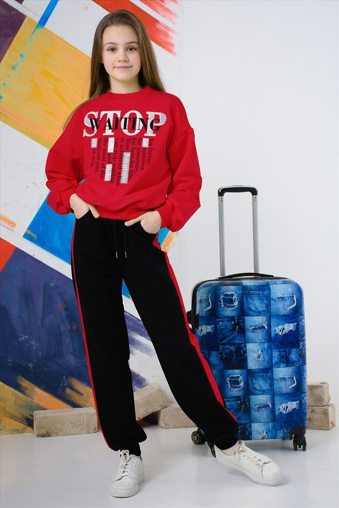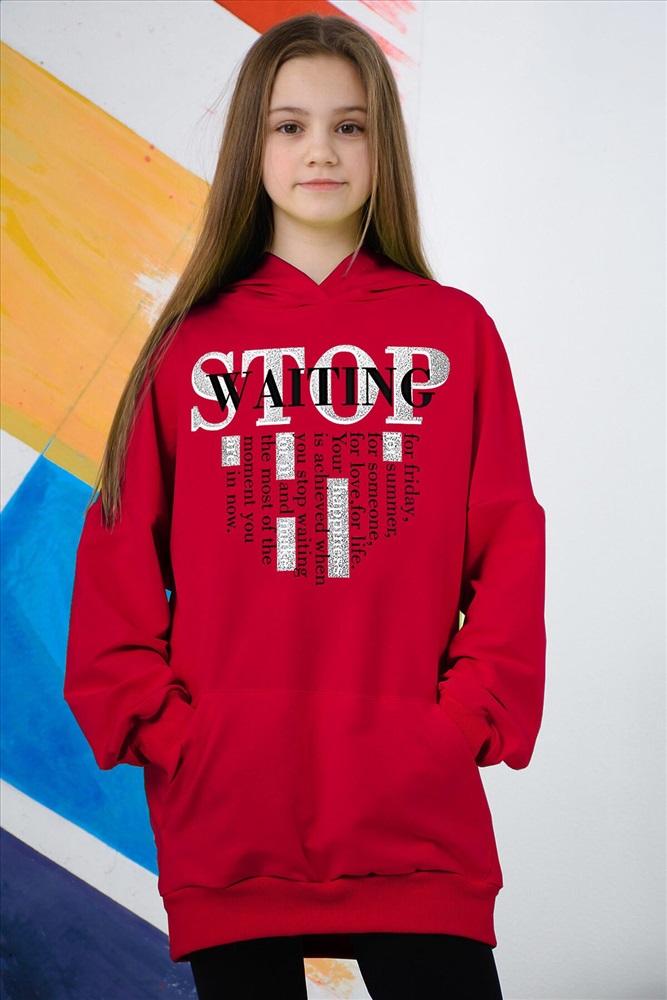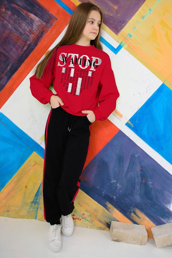 Современный костюм для подростков. Печать на толстовке гласит: "Хватит ждать пятницу, лето, кого-то, хватит ждать любовь, жизнь. Найдёшь счастье лишь тогда, когда перестанешь что-то ждать, лишь тогда, когда научишься наслаждаться настоящим." Костюм состоит из толстовки очень свободного кроя с сильно спущенным плечом. Брюки-джоггеры с внутренними карманами на широком поясе. Манжеты и горловина выполнены из кашкорсе. В характеристиках длина рукава указана от горловины.