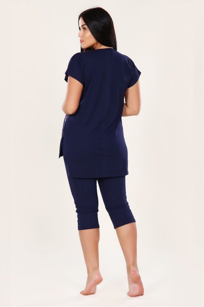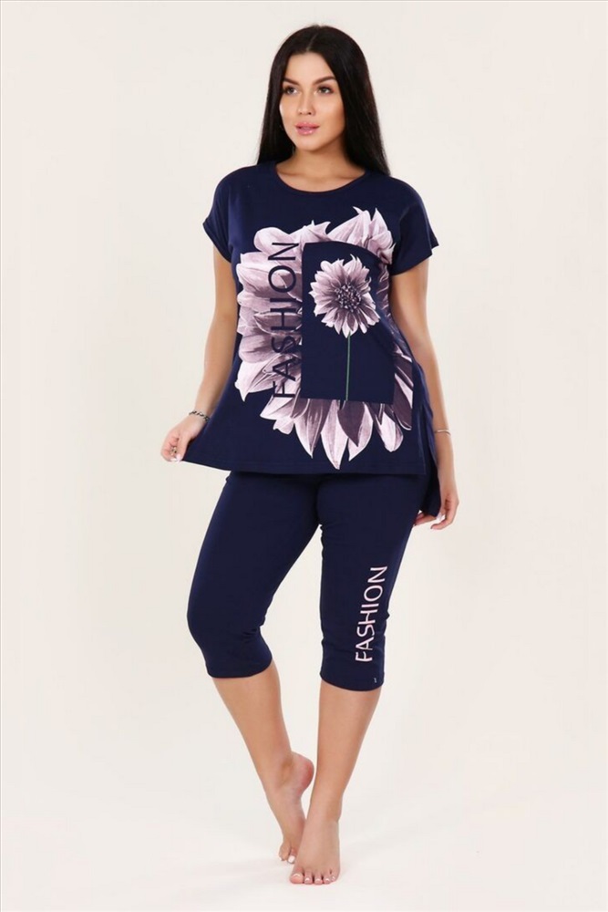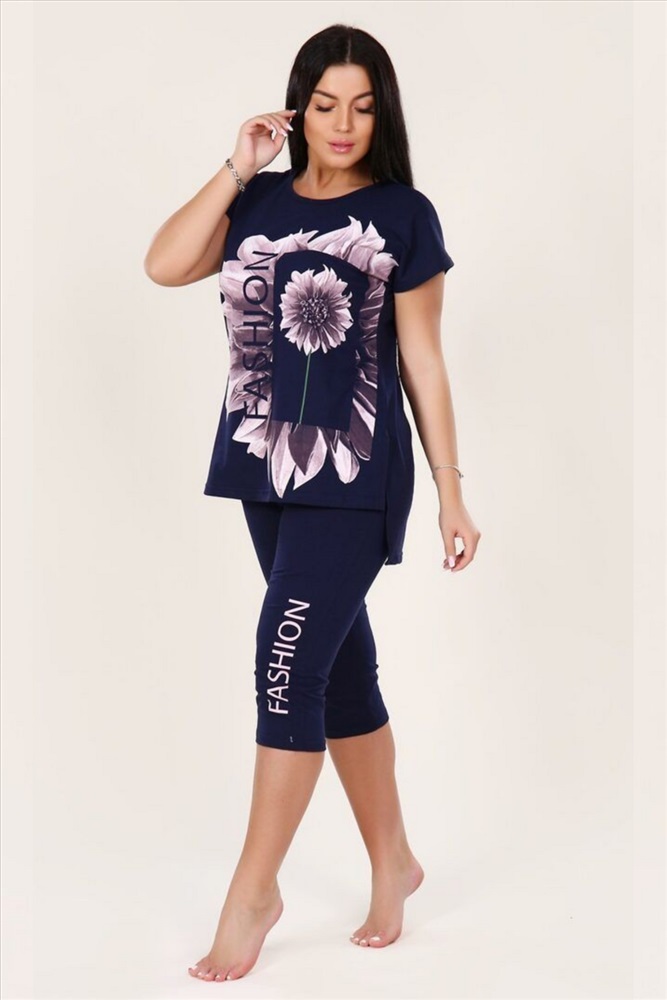 Застежка: без застежки Женский костюм, состоящий из футболки с удлинённой спинкой и бриджей, выполнен из лёгкого и приятного на ощупь материала 100% хлопка в исполнении кулирной глади. Элегантный флористический принт с надписями в стиле FASHION flower придаёт комплекту оригинальности и стиля. Костюм доступен в широком размерном ряде: 46, 48, 50, 52, 54, 56, 58, 60, что позволяет подобрать идеальный вариант для каждой женщины. Темно-синий цвет изделия делает его универсальным и легко сочетаемым с различными аксессуарами и обувью. Этот стильный и комфортный костюм отлично подойдёт как для повседневной носки, так и для расслабляющего отдыха. Хлопковый материал обеспечивает отличную воздухопроницаемость, что гарантирует удобство на протяжении всего дня.