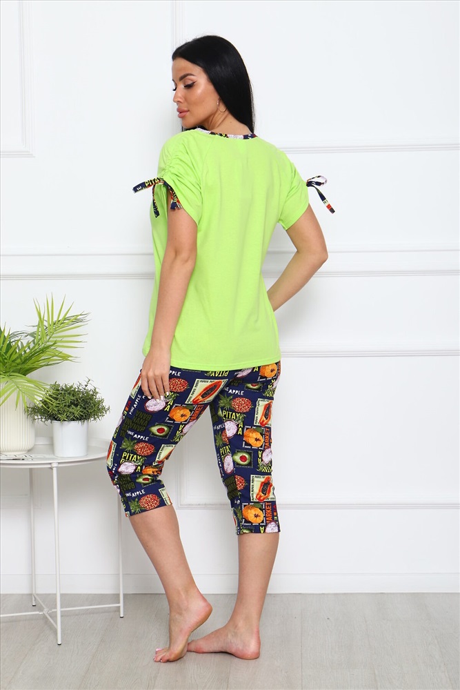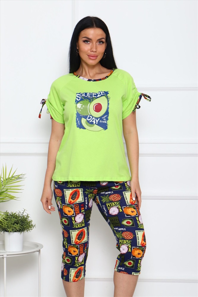 ID товара: 1000461 Состав: 100% Хлопок Сезон: Весна/Лето Фасон: Свободный крой Рукав: Короткие Крой брючин: Зауженный Рисунок: Фантазийный Тип карманов: Прорезные Вид ткани: Кулирка Страна бренда: Россия Страна производства: Россия Костюм женский, выполнен из трикотажного полотна кулирка. Костюм состоит из футболки и бридж. Футболка свободного силуэта, на рукавах выполнена кулиска, горловина окантована. Бриджи свободного кроя, с карманами. Комментарии к товару