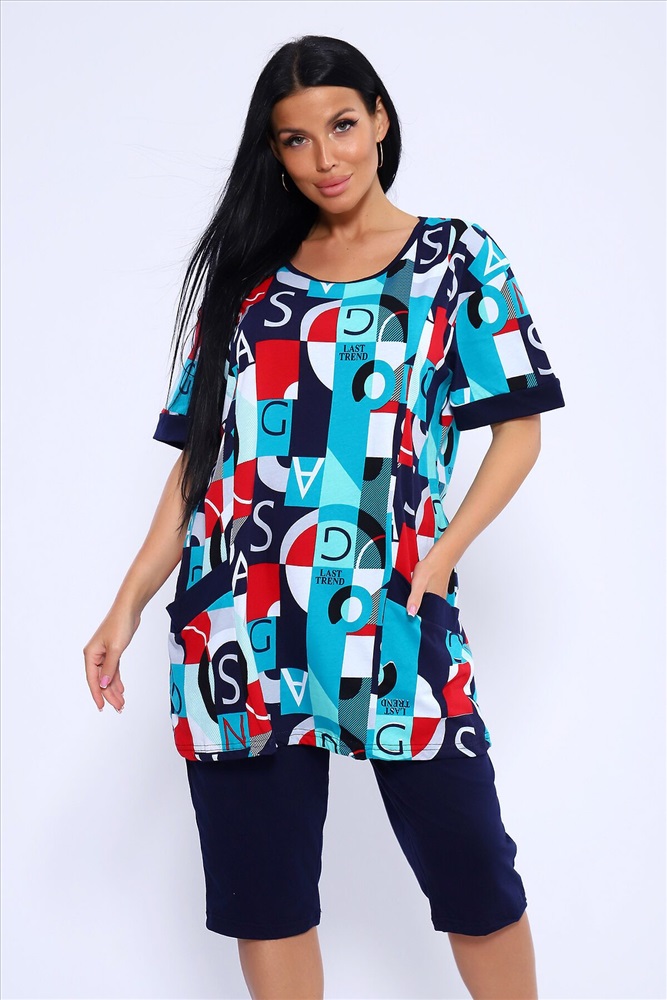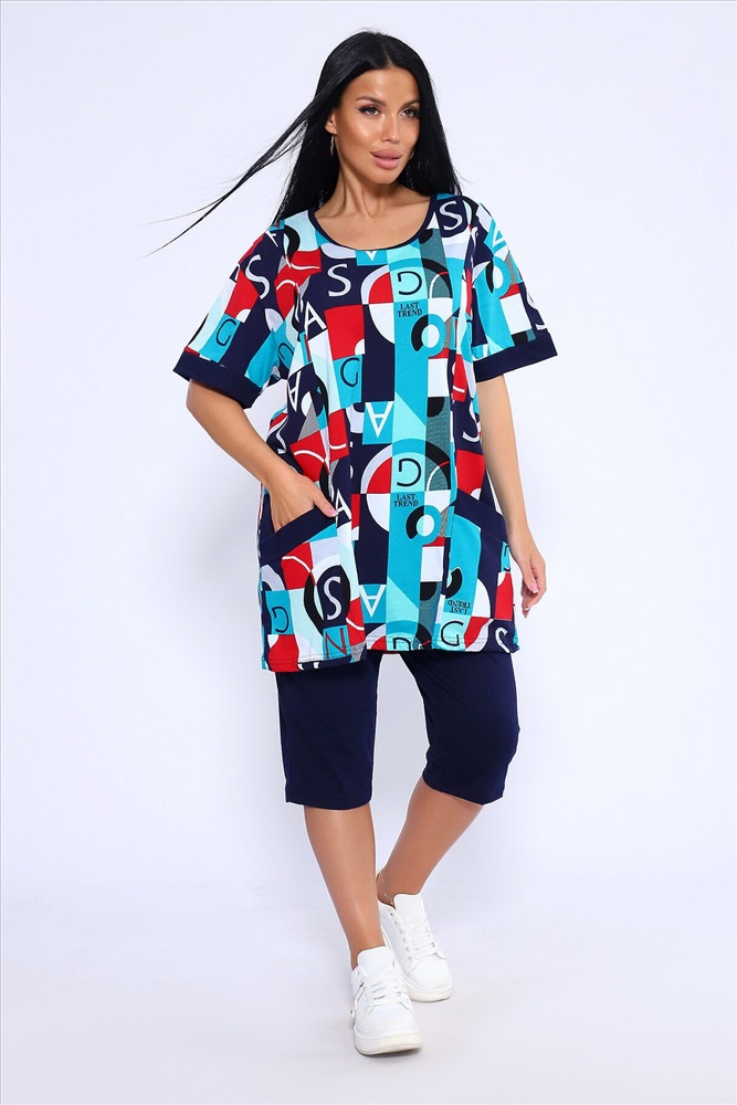 ID товара: 1021931 Состав: 100% Хлопок Сезон: Весна/Лето Фасон: Свободный крой Рукав: Короткие Крой брючин: Прямой Рисунок: Фантазийный Тип карманов: Накладные Вид ткани: Кулирка Страна бренда: Россия Страна производства: Россия Костюм состоит из туники и бридж. Бриджи с карманами, длиной ниже колена. Туника с короткими рукавами на манжетах. Полочка с отрезными бочками и накладными карманами. Комментарии к товару