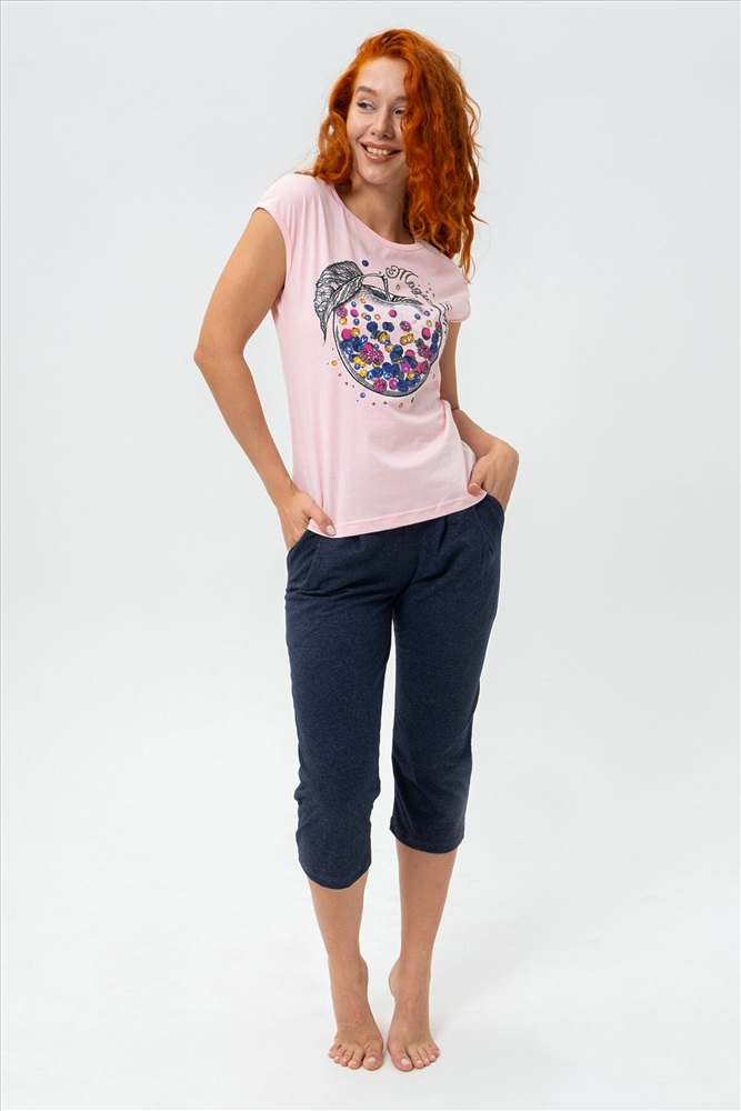 ID товара: 1024594 Состав: Верх- Хлопок 100%; низ- Хлопок 65%; Полиэстер 35% Сезон: Весна/Лето Длина: Средняя Фасон: Полуприлегающий Рукав: короткие Крой брючин: Зауженный Рисунок: Фантазийный Тип карманов: В шве Декоративные элементы: Принт Основная ткань: Хлопок Стиль: повседневный Вид ткани: Кулирка Страна бренда: Россия Страна производства: Россия Удобный универсальный костюм для дома и любимой дачи. Бриджи-капри на кокетке со складками, к низу заужены, длина до середины икры. Благодаря наличию в составе 35% полиэстера бриджи не растянутся на коленях. Футболка украшена полноцветной печатью, поэтому ягоды кажутся натуральными. Горловина - лодочка. Очень удобный крой. Оттенок ткани бриджей может отличаться от представленного на фото. Комментарии к товару