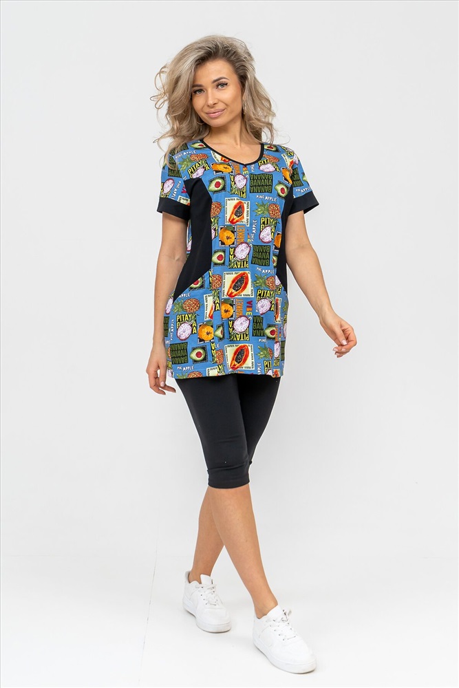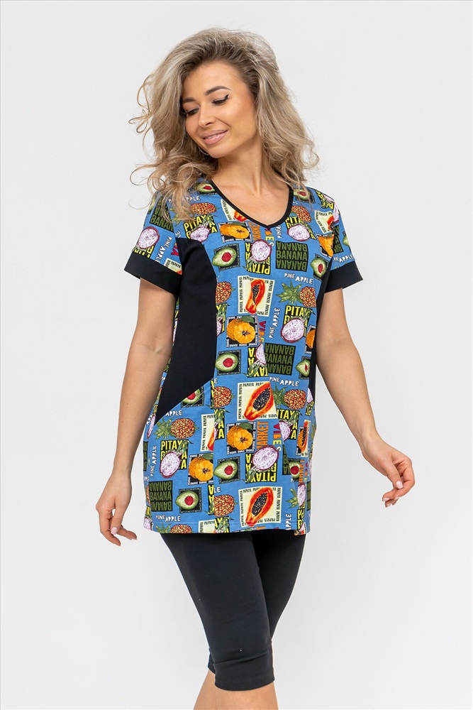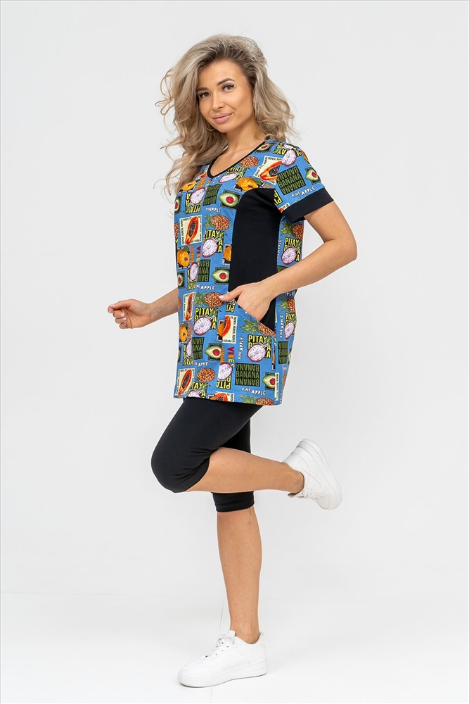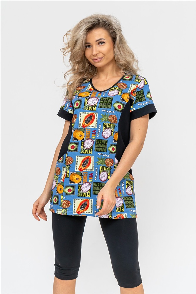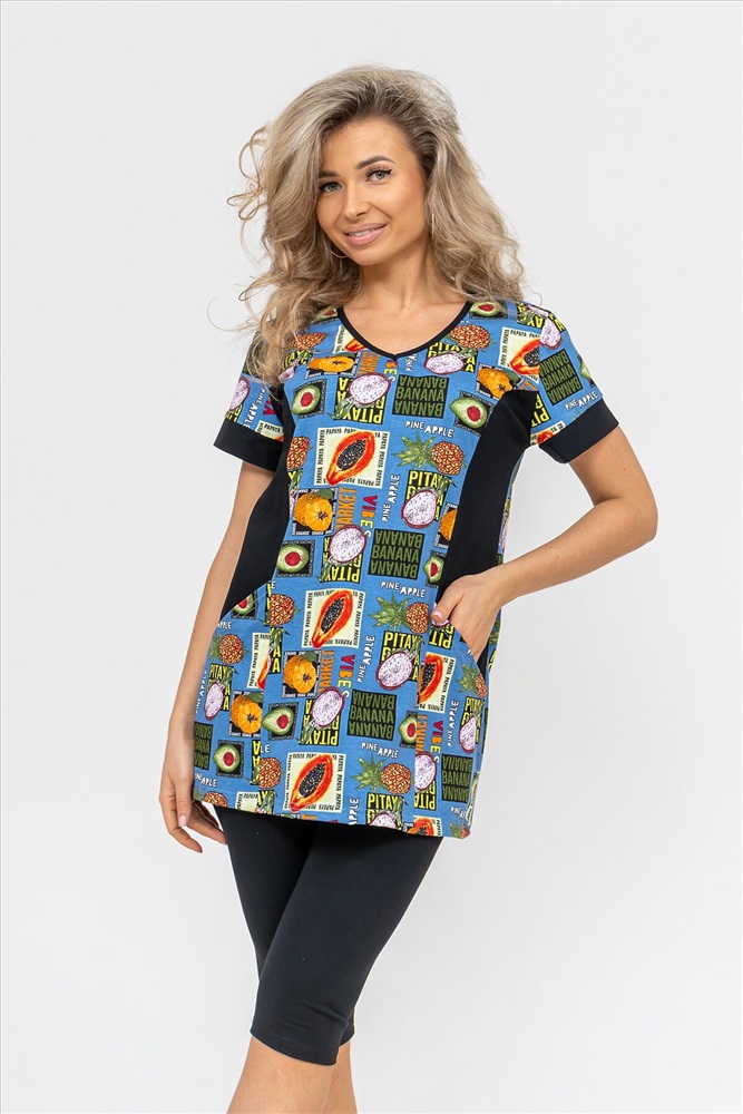 ID товара: 981611 Состав: 100% Хлопок; 92% Хлопок, 8% Лайкра Сезон: Весна/Лето Длина: Средняя Фасон: Полуприлегающий Рукав: короткие Крой брючин: Облегающий Рисунок: Фрукты Тип карманов: В шве Декоративные элементы: Принт Основная ткань: Хлопок Стиль: повседневный Вид ткани: Кулирка, кулирка с лайкрой Страна бренда: Россия Страна производства: Россия Женский костюм полуприлегающего силуэта состоит из туники и бриджей. 100% дышащий хлопок туники и эластичная вискоза бриджей несут в себе удобство при носке, гигроскопичность и износостойкость. V-образный вырез горловины придаёт изделию женственный вид. Для удобства туника имеет вместительные накладные карманы и втачные рукава с манжетами. Рельефы на полочке изделия создают идеальную посадку и безупречный внешний вид. Бриджи на резинке с высокой посадкой. В костюме такого плана Вы будете чувствовать себя комфортно как дома, так и на любимой даче. Эта двойка идеально подойдет для летнего отдыха на даче, на море или просто для девушек, которые хотят чувствовать себя уютно и комфортно дома. Летний женский костюм подходит для поездок и путешествий, загородного отдыха на природе, а также для получения лечения в больнице или санатории. Повседневное хлопковое изделие с бриджами - отличная идея для подарка любимой жене, маме, сестре или подруге на день рождения, 8 Марта или по любому другому приятному поводу. Рекомендация: для того чтобы продлить яркую жизнь Вашему костюму для дома и отдыха из хлопка, стирку производить при температуре не выше 30 градусов, а во избежание деформации изделия не прибегать к ручному отжиму (не перекручивать), утюжить слегка недосушенное изделие утюгом на паровом режиме. Покупайте наши красивые и удобные домашние костюмы с бриджами и носите с удовольствием! Приятных покупок! Комментарии к товару