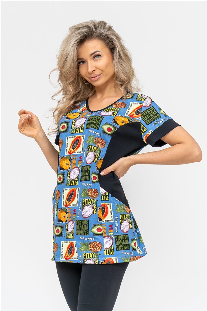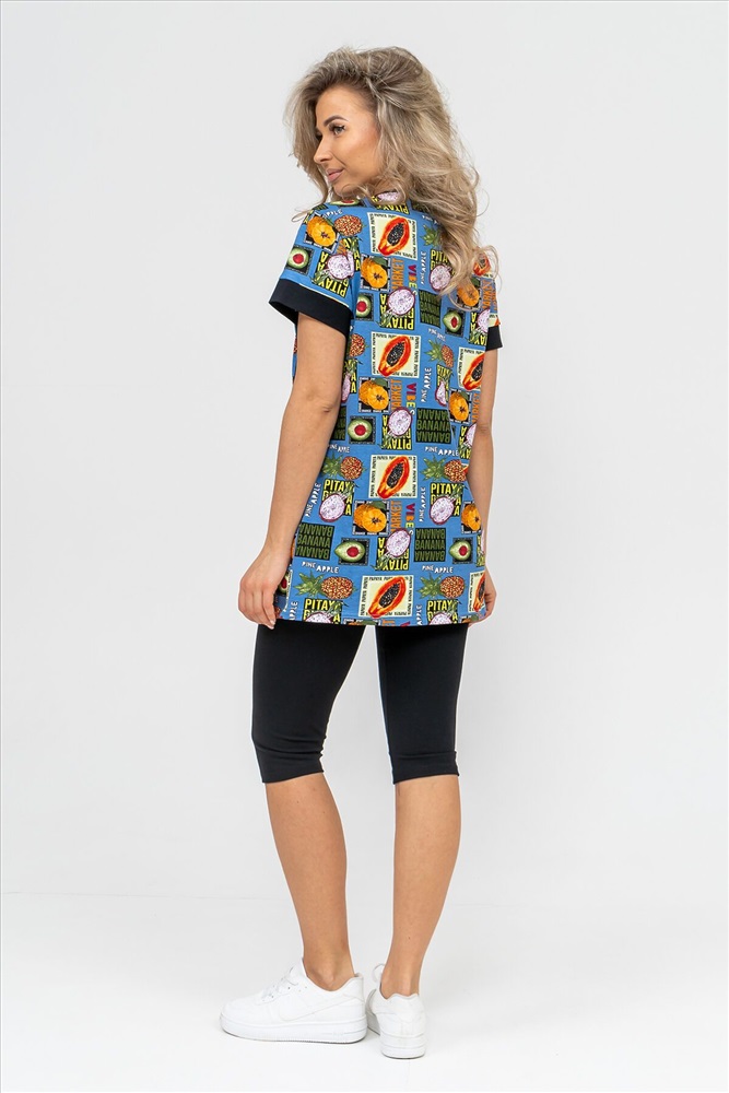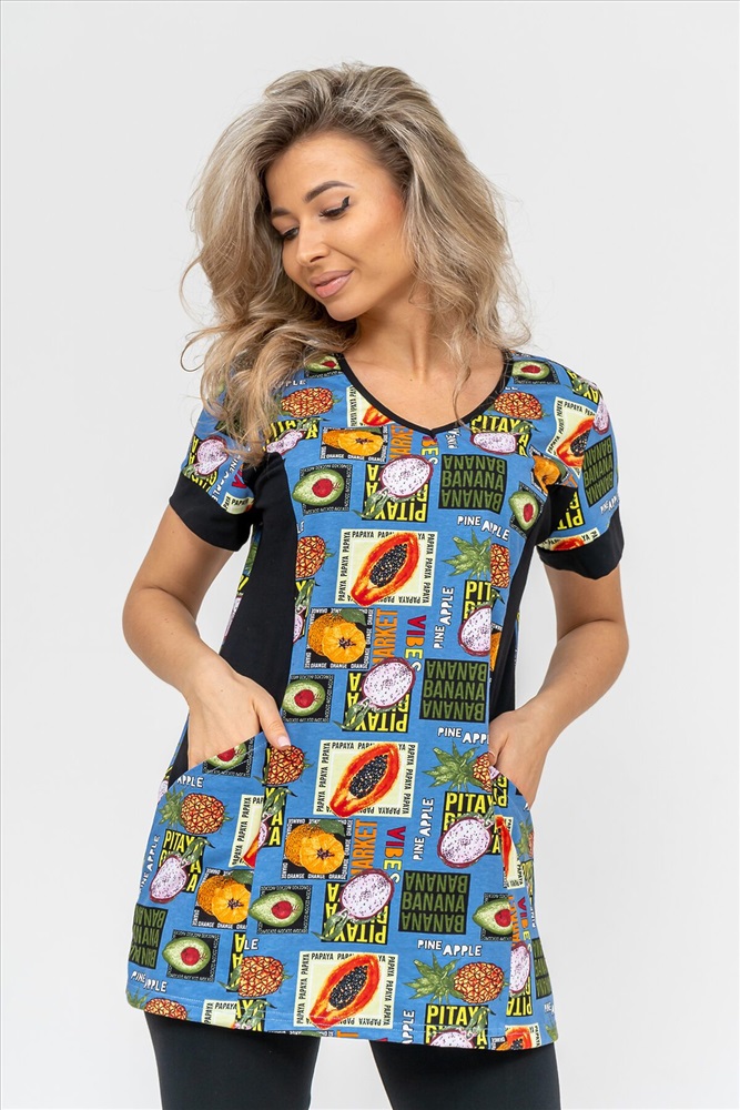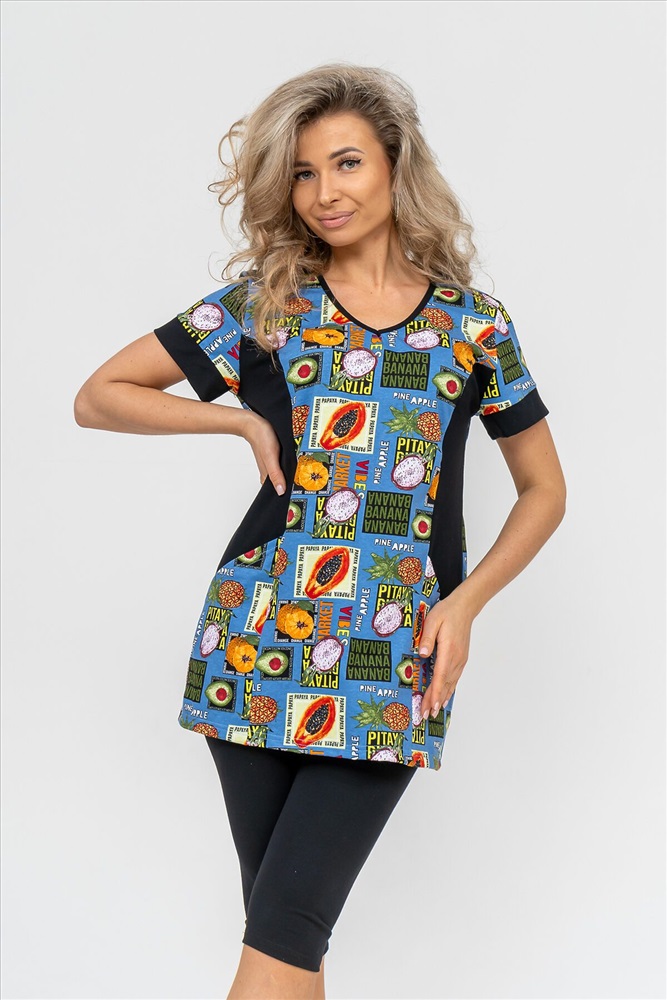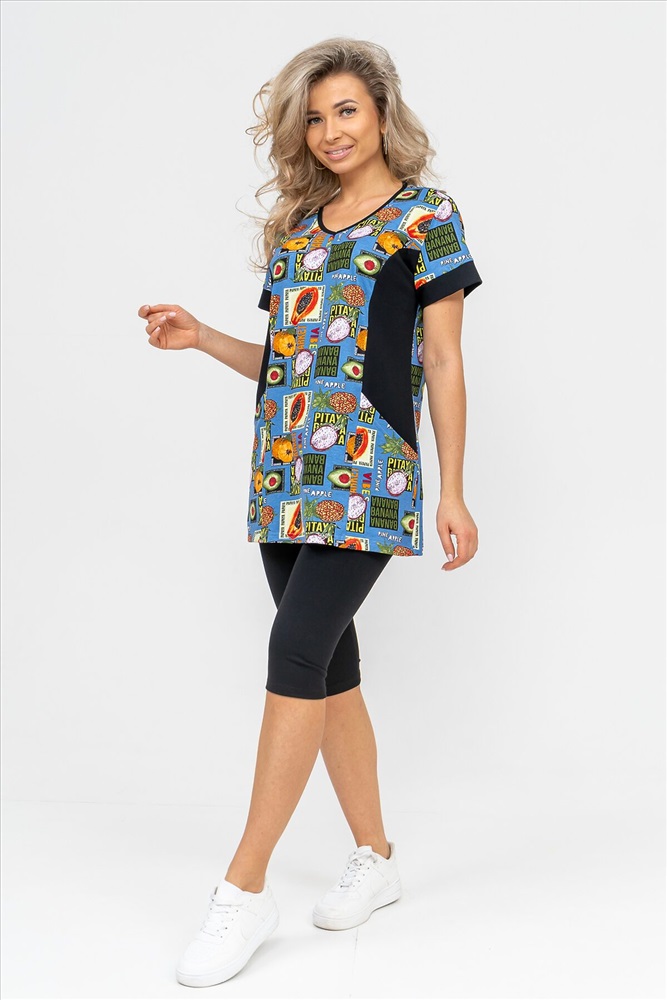 ID товара: 981611 Состав: 100% Хлопок; 92% Хлопок, 8% Лайкра Сезон: Весна/Лето Длина: Средняя Фасон: Полуприлегающий Рукав: короткие Крой брючин: Облегающий Рисунок: Фрукты Тип карманов: В шве Декоративные элементы: Принт Основная ткань: Хлопок Стиль: повседневный Вид ткани: Кулирка, кулирка с лайкрой Страна бренда: Россия Страна производства: Россия Женский костюм полуприлегающего силуэта состоит из туники и бриджей. 100% дышащий хлопок туники и эластичная вискоза бриджей несут в себе удобство при носке, гигроскопичность и износостойкость. V-образный вырез горловины придаёт изделию женственный вид. Для удобства туника имеет вместительные накладные карманы и втачные рукава с манжетами. Рельефы на полочке изделия создают идеальную посадку и безупречный внешний вид. Бриджи на резинке с высокой посадкой. В костюме такого плана Вы будете чувствовать себя комфортно как дома, так и на любимой даче. Эта двойка идеально подойдет для летнего отдыха на даче, на море или просто для девушек, которые хотят чувствовать себя уютно и комфортно дома. Летний женский костюм подходит для поездок и путешествий, загородного отдыха на природе, а также для получения лечения в больнице или санатории. Повседневное хлопковое изделие с бриджами - отличная идея для подарка любимой жене, маме, сестре или подруге на день рождения, 8 Марта или по любому другому приятному поводу. Рекомендация: для того чтобы продлить яркую жизнь Вашему костюму для дома и отдыха из хлопка, стирку производить при температуре не выше 30 градусов, а во избежание деформации изделия не прибегать к ручному отжиму (не перекручивать), утюжить слегка недосушенное изделие утюгом на паровом режиме. Покупайте наши красивые и удобные домашние костюмы с бриджами и носите с удовольствием! Приятных покупок! Комментарии к товару