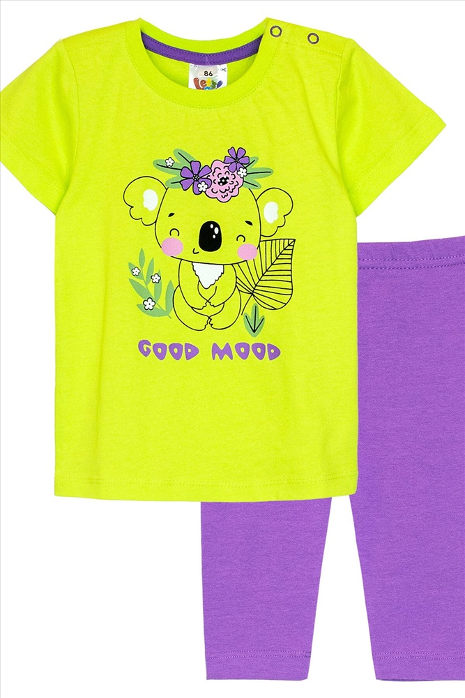 Комплект для девочки, состоящий из футболки и бридж из высококачественного 100% хлопка. Не будет сковывать движений и отлично подойдет для детского сада, прогулок, спорта и активных игр. Футболка для девочки прямого силуэта, с втачным коротким рукавом. На левом плече застежка на 2 пробивные кнопки. На полочке принт Шелкография. Надпись переводится как Хорошее настроение. Бриджи для девочки прилегающего силуэта.