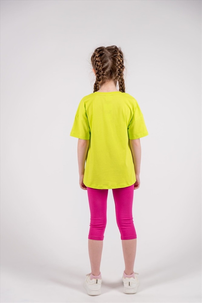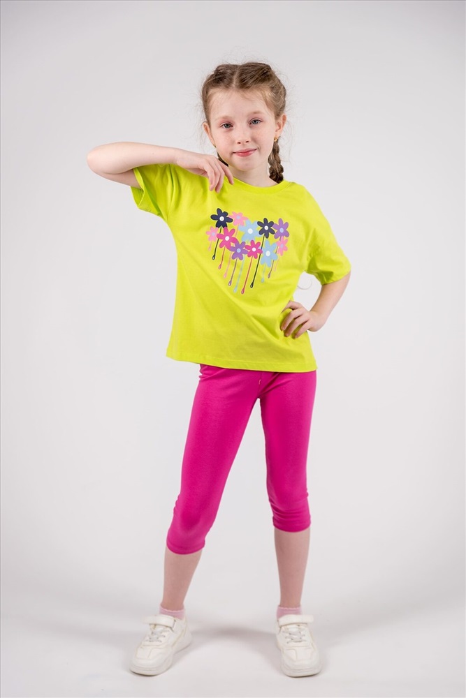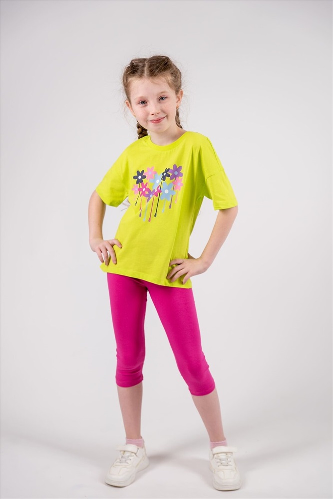 Легкий костюм для девочек, состоящий из футболки и бридж. Комплект выполнен из приятного хлопкового трикотажа, ткань немного тянется что добавляет комфорта в носке. Футболка для девочки прямого силуэта с фигурным низом, со спущенным плечом, коротким рукавом. Украшена милым рисунком - мягкий эластичный принт шелкография. Практичные однотонные бриджи сочетаются с принтом на футболке, пояс на комфортной широкой резинке. Костюмчик отлично подойдет для лета, детского сада, не требует особого ухода (посадка всегда отличается в зависимости от комплекции конкретного ребенка)